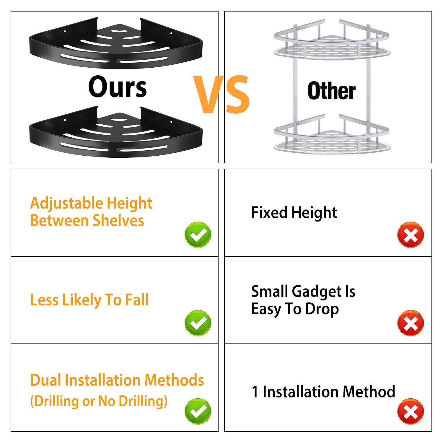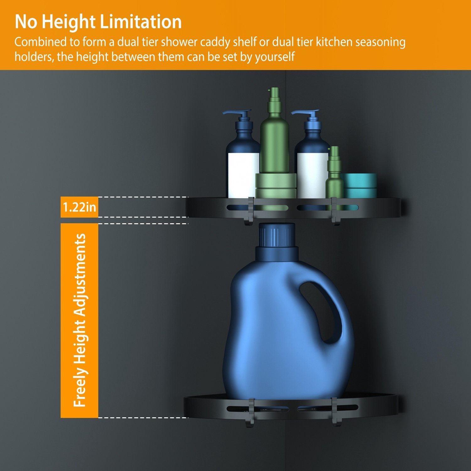 **No Height Limitation*:Separate and independent dual tier shelf; you can mount one on your bathroom and install one to the kitchen; or combined to form a dual tier shower caddy shelf or dual tier kitchen seasoning holders; the height between them can be set by yourself.