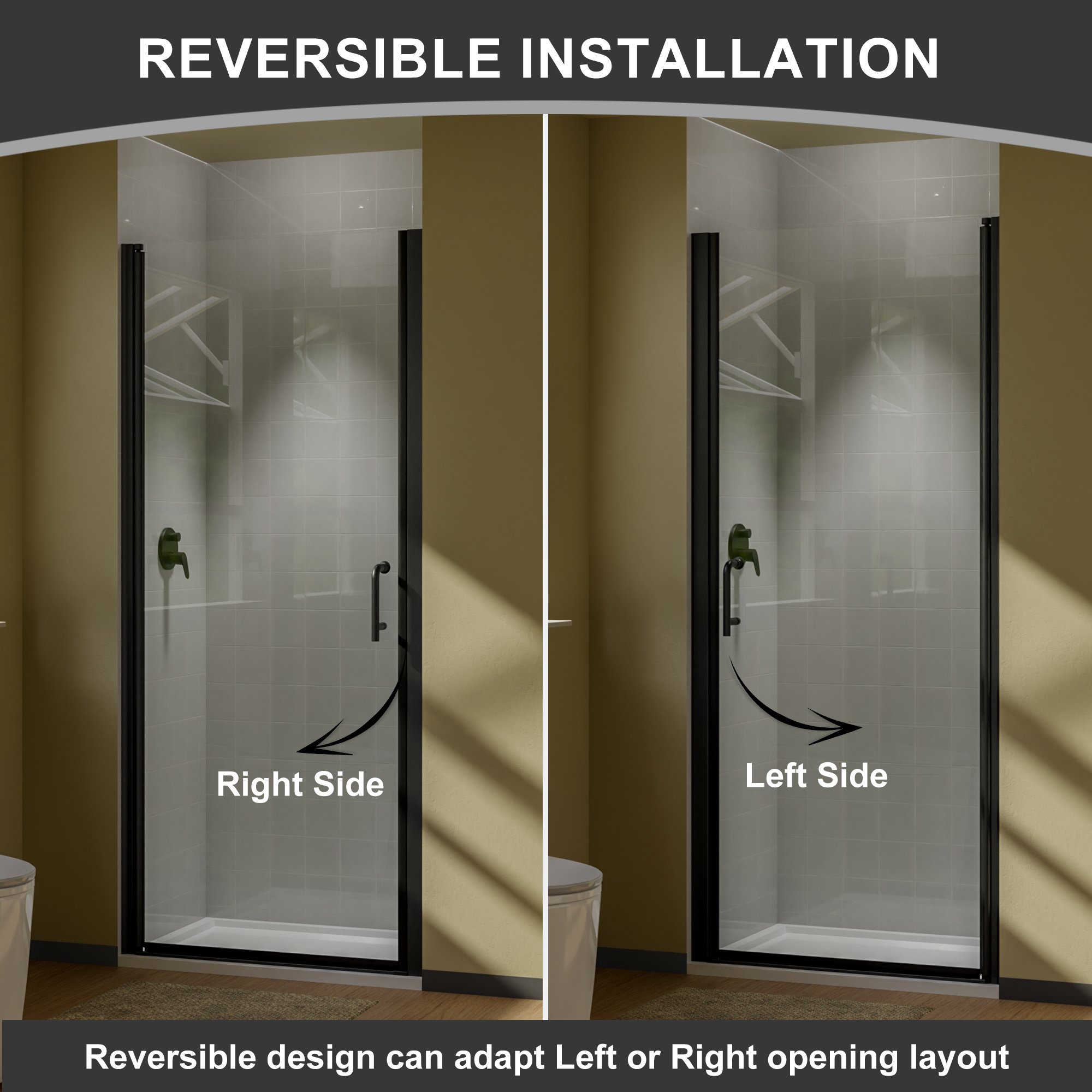 [Pivot Glass Shower Door] Made of 1/4 " SGCC certified clear tempered glass, strong and unbreakable. Reversible shower door can be installed on the left or right side with hinges and shafts that pivot 90°.