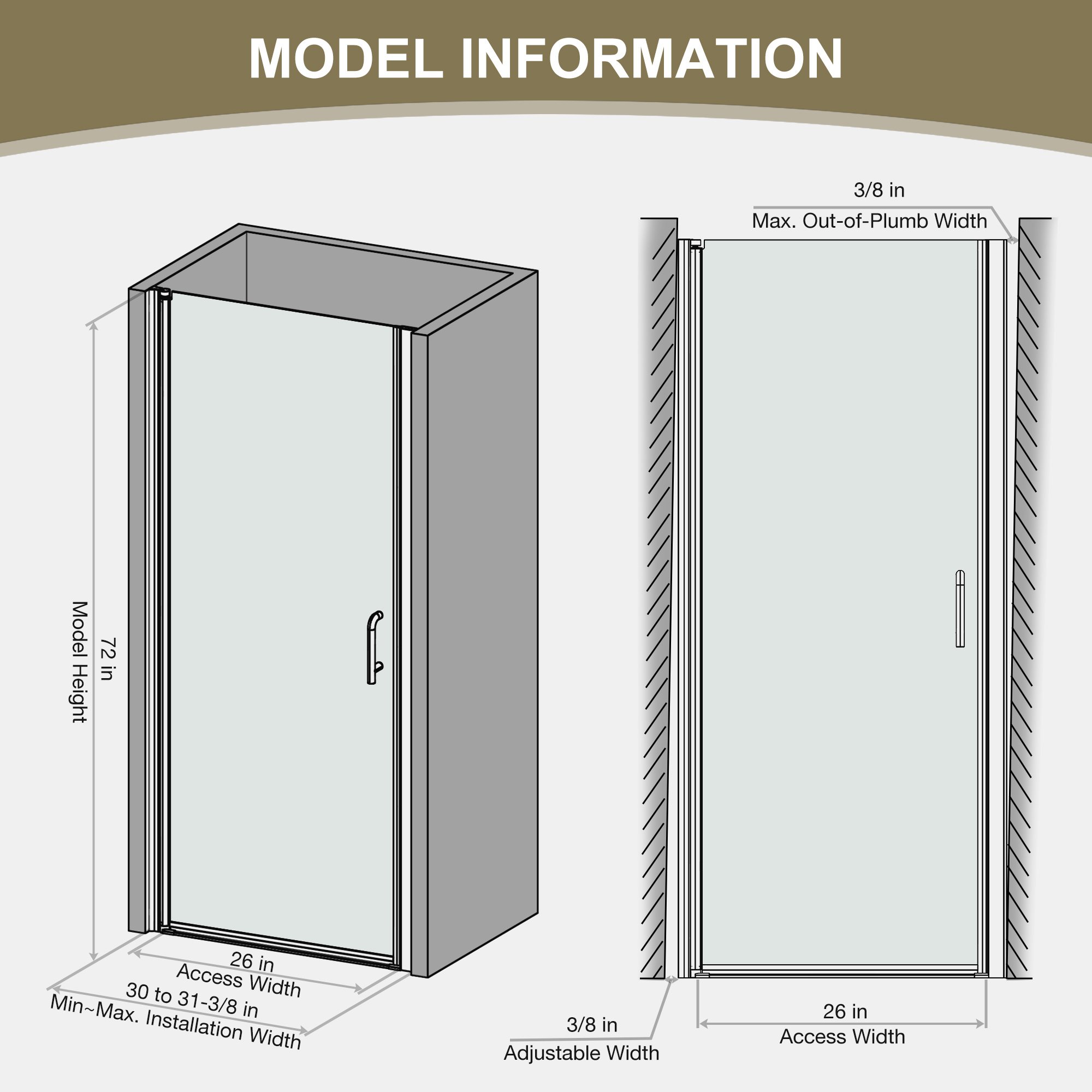 [Adjustable Sides] Bathroom shower door is adjustable on both sides for easy installation in shower stall with different wall spacing. Size: 30-31.5 "W*72 "H. Glass cannot be cut, please measure the wall spacing before installation.