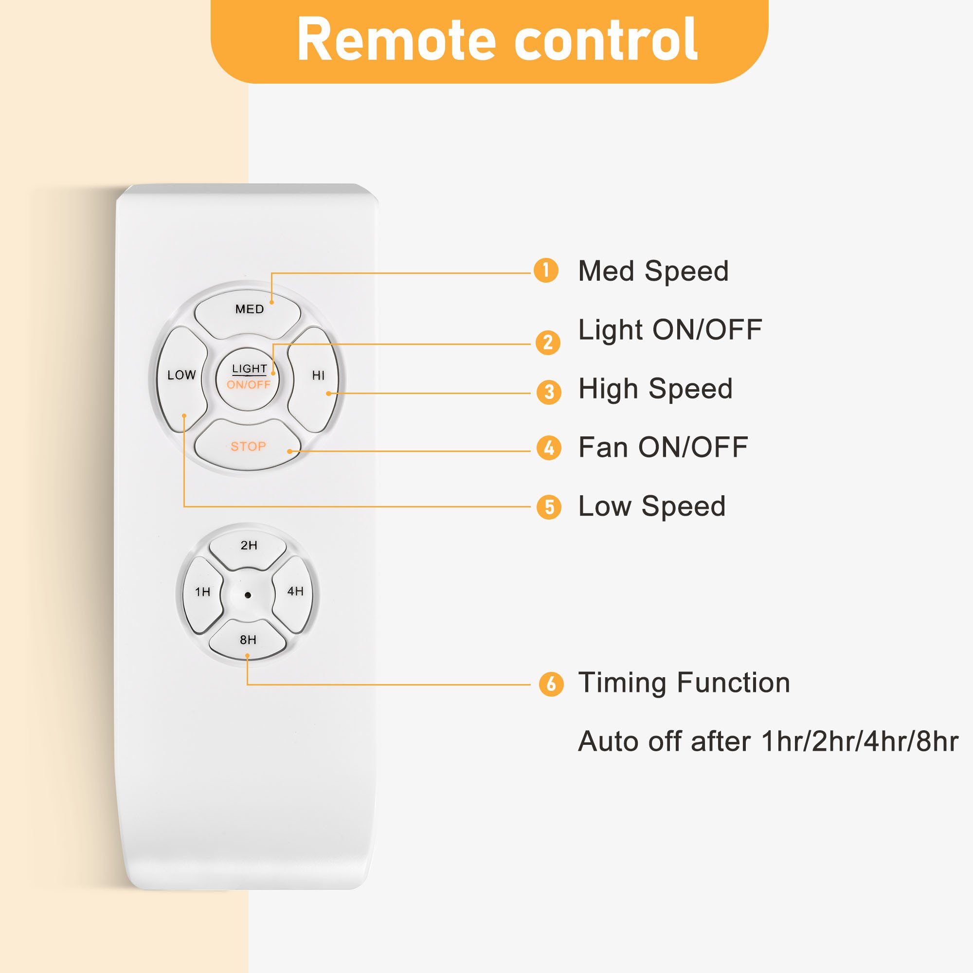 [Remote control] You can control the ceiling fan from anywhere in the room; adjust the wind speed (3-speed; low/medium/high); and set the running time (1/2/4/8 hours); which is more convenient to use.