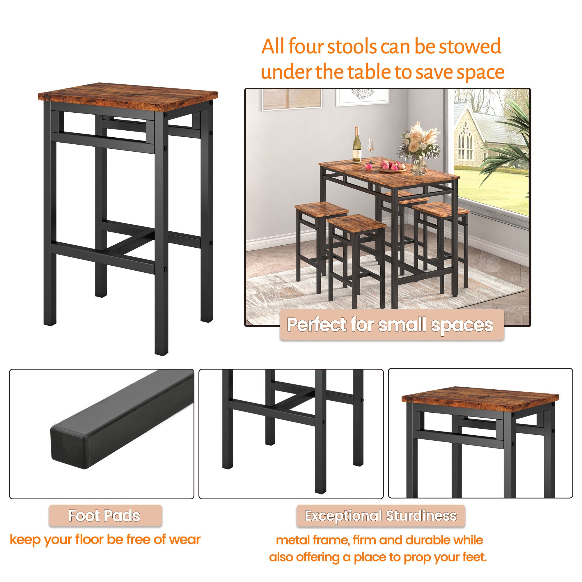 Bar table set 5PC Dinging table set with high stools; structural strengthening; industrial style (Rustic Brown; 43.31''w x 23.62''d x 35.43''h)Pieces Included1 Table + 4 StoolsProduct description•Table Dimensions: 43.31''L x 23.62''W x 35.43''H; Stools Dimensions: 14.96''L x 11.02''W x 23.62''H. Table Weight Capacity:350 LBS; Stools Weight Capacity350 LBS.•The dining table set is made of high-quality particle board and metal square tube; and has been reinforced with a design for greater stability and exceptional sturdiness; The maximum load can reach an amazing 350 pounds!•These stools can be placed under the table when not in use; saving space and making serving dishes easier without the user worrying about the stools tripping you as you pass.It is the perfect solution for small kitchen small apartment or studio.•Thanks to the detailed instructions and clearly marked parts; you can assemble this set of tables and chairs in no time; and after that; the great meal can begin!•The simple lines and Vintage Wooden tabletop create a stunning visual effect allows you to use it in various scenarios; perfect as a dining table; computer desk; desk; writing desk or soho workbench; industrial DIY workbench; it is your faithful friend.Product Information•Product Type:Bar Table Set 5pc•Color:Rustic Brown+Black•Material:Particleboard + Iron•Table Dimension:43.31'w x 23.62'd x 35.43'h•Stool Dimension:14.96'w x 11.02'd x 23.62'h•Desktop thickness:0.6''•stool surface thickness:0.6''•Table Weight:33.04LBS•Stool Wight:.6.6LBS•Table Wight Capacity:350LBS•Stool Weight Capacity:350LBS•Assembly Required:About 30min•Ships in 1 package Notice•Indoor use only.•Colorways and measurements may vary slightly.•Consult all warning information and use caution when assembling. •Liquids should be immediately blotted with a damp cloth. •Avoid the use of chemicals and household cleaners as they may damage the finish.•Adjust locks and hardware as needed.