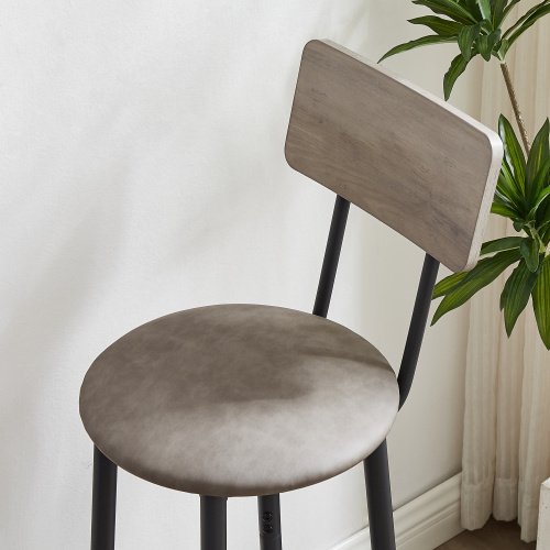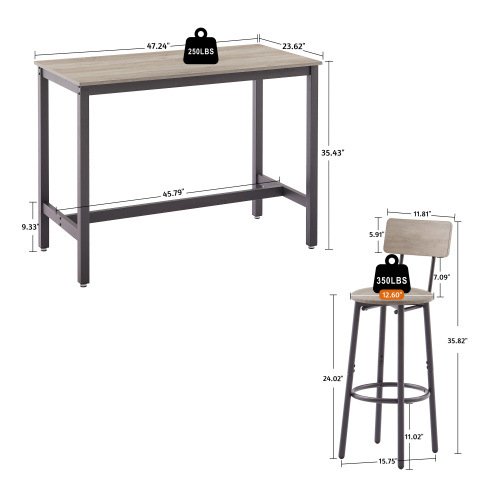 Bar Table Set with 4 Bar stools PU Soft seat with backrest (Grey; 47.24''w x 23.62''d x 35.43''h)Pieces Included1Bar table+4Bar stoolsProduct description•The bar stool comes with a 12.6-inch width PU upholstery; a looped footrest and a wooden backrest that provides a soft touch and you can lean back comfortably on the backrest.•The four stools; with a cushion width of 12.6 inches and a height of approximately 24.41 inches from the floor; can be placed under the table when not in use without interfering with your passage; while maintaining a clean and beautiful appearance; ideal for small spaces.•The bar table and chairs are composed of sturdy iron frame and high quality particle board (0.6 inches thick); load capacity: table: 200lbs. Stool: 220 lbs.•Rustic brown particleboard and high-quality black iron frame create a minimalist style; while the PU upholstered seat gives it an industrial feel and a comfortable feel.•Your bar table and chairs; you have the final say! You can pull the chairs out from under the table at any time and enjoy a drink with family and friends; it will make you feel the relaxed atmosphere and enjoy the happy time of family gathering.Product information•Product Type: Bar table set of 5•Color:Grey•Material: Particleboard + Iron +PU•Table Dimensions: 47.24''w x 23.62''d x 35.43''h•Stool Dimensions: 12.60''w x 12.60''d x 36.22''h•Stool cushion height from the ground:24.41''•Backrest width:11.85''•Table Weight:36.74LBS•Stool:8.47LBS•Tabletop Thickness: 0.6'•Cushion Thickness: 2.36'•Table Weight Capacity:250 LBS •Stool Weight Capacity: 350 LBS•Assembly Required: About 25 minutes•Ships in 1 package Notice•Indoor use only.•Colorways and measurements may vary slightly.•Consult all warning information and use caution when assembling. •Liquids should be immediately blotted with a damp cloth. •Avoid the use of chemicals and household cleaners as they may damage the finish.•Adjust locks and hardware as needed.