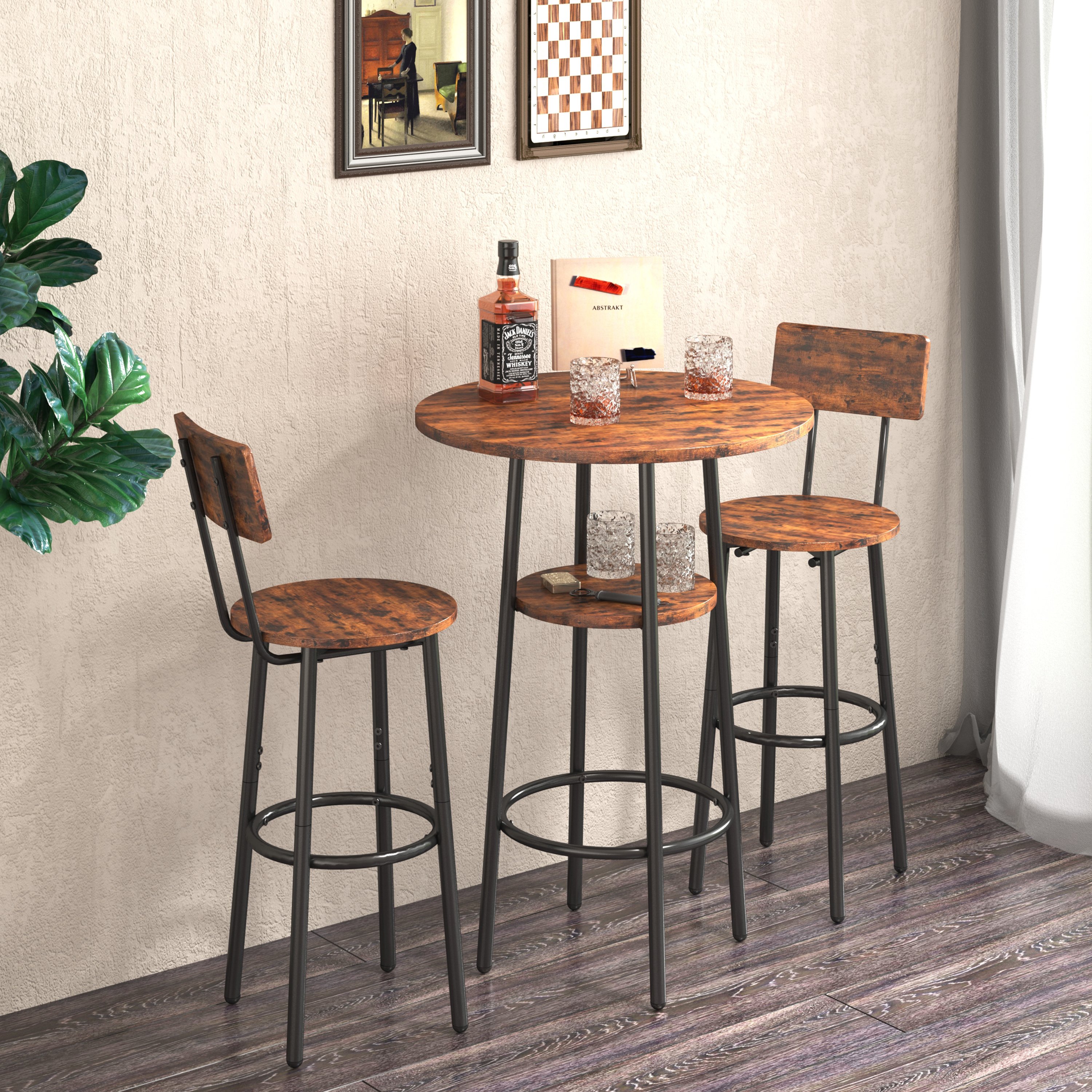 double -layer round bar table set 3PC breakfast table; including 2 back stools with back(Rustic Brown; 23.62''w x 23.62''d x 35.43''h)Pieces Included1Bar Table + 2Bar stoolsProduct description•The bar stool comes with a 12.6-inch wide seat cushion; ring foot cushion and curved backrest; you can comfortably lean back on the backrest and the ring foot cushion underneath provides all-around support to help create the right posture and reduce fatigue.•There is a 13.19-inch wide circular shelf in the middle for wine glasses; lighters; bottle openers; etc.•The bar and chairs are made of strong iron frame and high quality particle board (0.6 inches thick); the table can support 200 lbs. The stools can hold up to 350 lbs.•Rustic brown particle board and high quality black iron frame create a minimalist style; this bar is perfect for small spaces.•Your bar table and chairs; you name it; you can put it anywhere in your home and have a drink with good friends or relax with a drink alone.Product information•Product Type: Bar table set of 3•Color:Rustic Brown•Material: Particleboard & Iron•Table Dimensions: 23.62''w x 23.62''d x 35.43''h•Middle shelf size:13.19''•Stool Dimensions: 12.60''w x 12.60''d x 36.22''h•Stool surface height from the ground:24.41''•Backrest width:11.85''•Table Weight:14.3LBS•Stool:8.47LBS•Thickness of the desktop: 0.6'•Thickness of stool surface:0.6'•Table Weight Capacity:200 LBS •Middle shelf capacity:70LBS•Stool Weight Capacity: 350 LBS•Assembly Required: About 25 minutes•Ships in 1 package Notice•Indoor use only.•Colorways and measurements may vary slightly.•Consult all warning information and use caution when assembling. •Liquids should be immediately blotted with a damp cloth. •Avoid the use of chemicals and household cleaners as they may damage the finish.