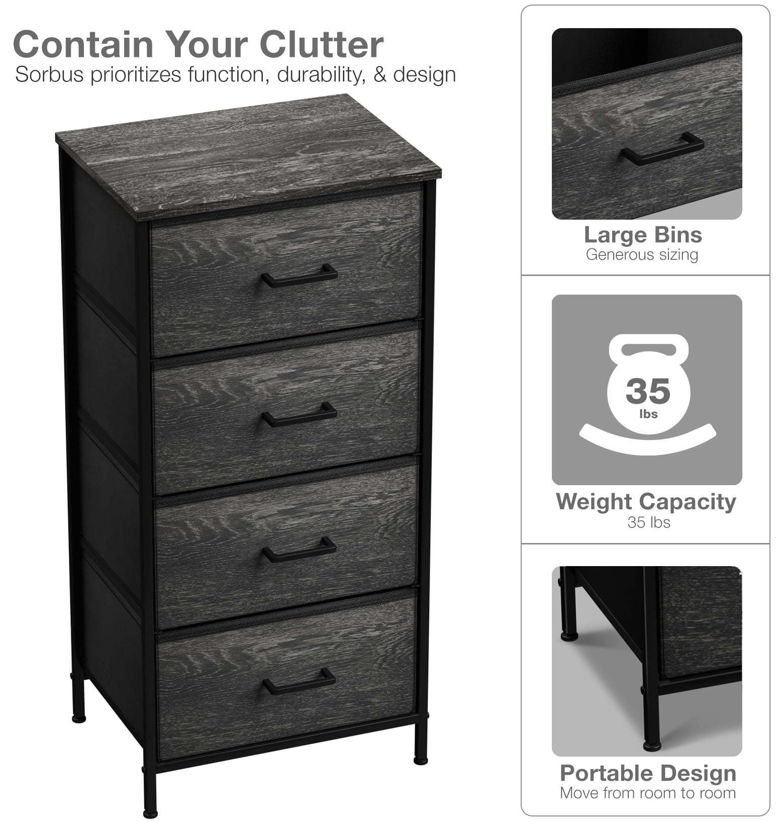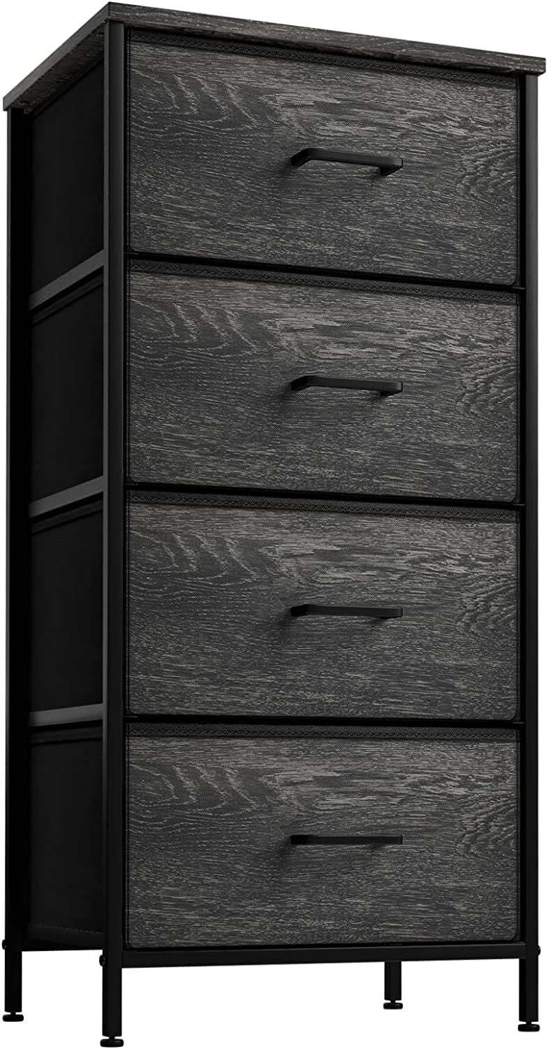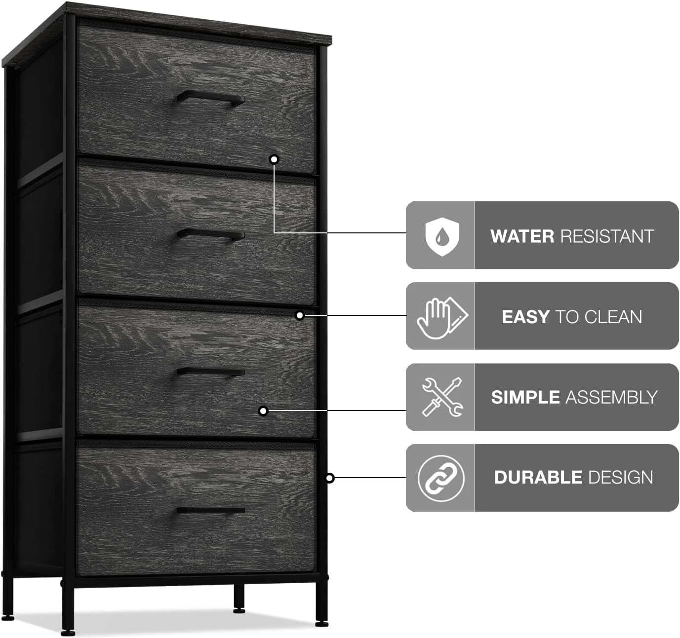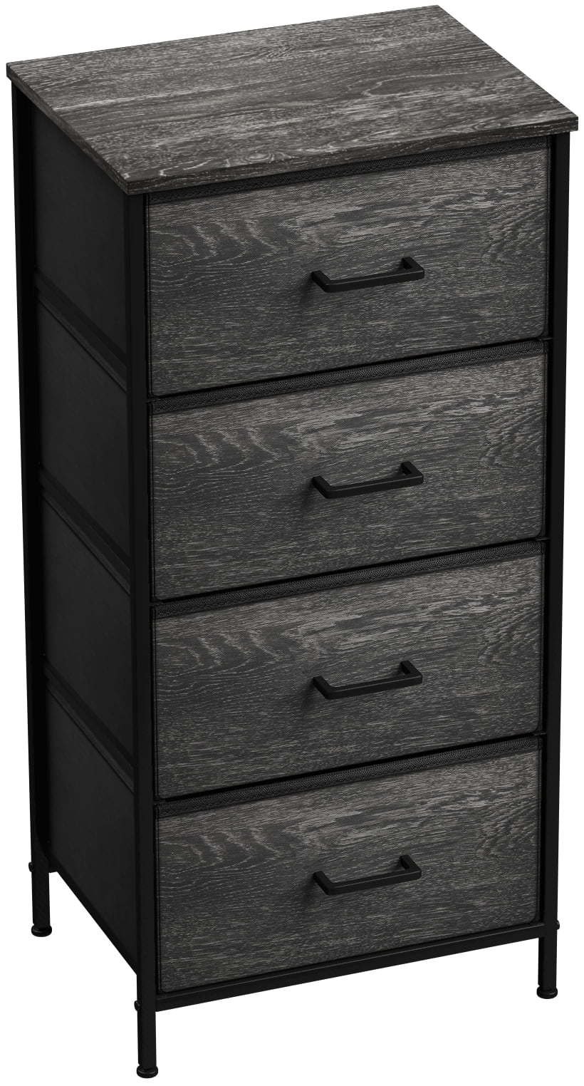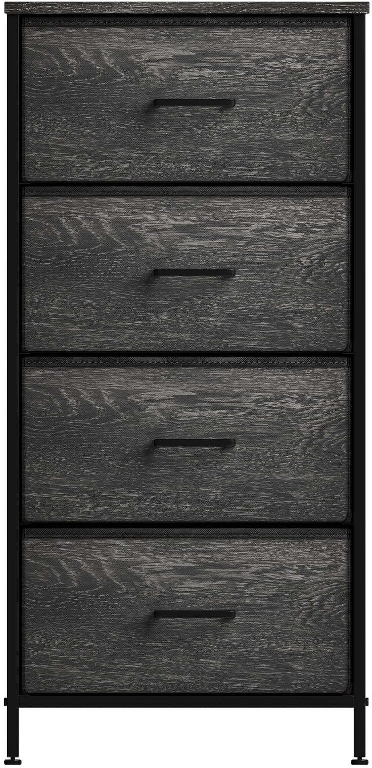 4 Drawer Fabric Storage Dresser — Tall Storage Dresser Tower features a sturdy steel frame, polyester fabric drawers, durable handles, and a wooden, water-proof top.