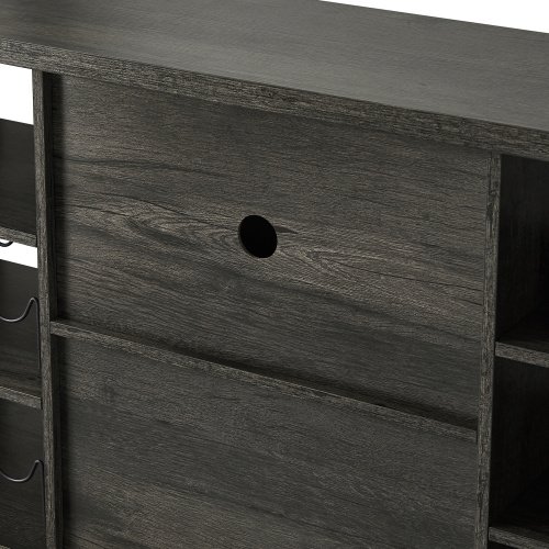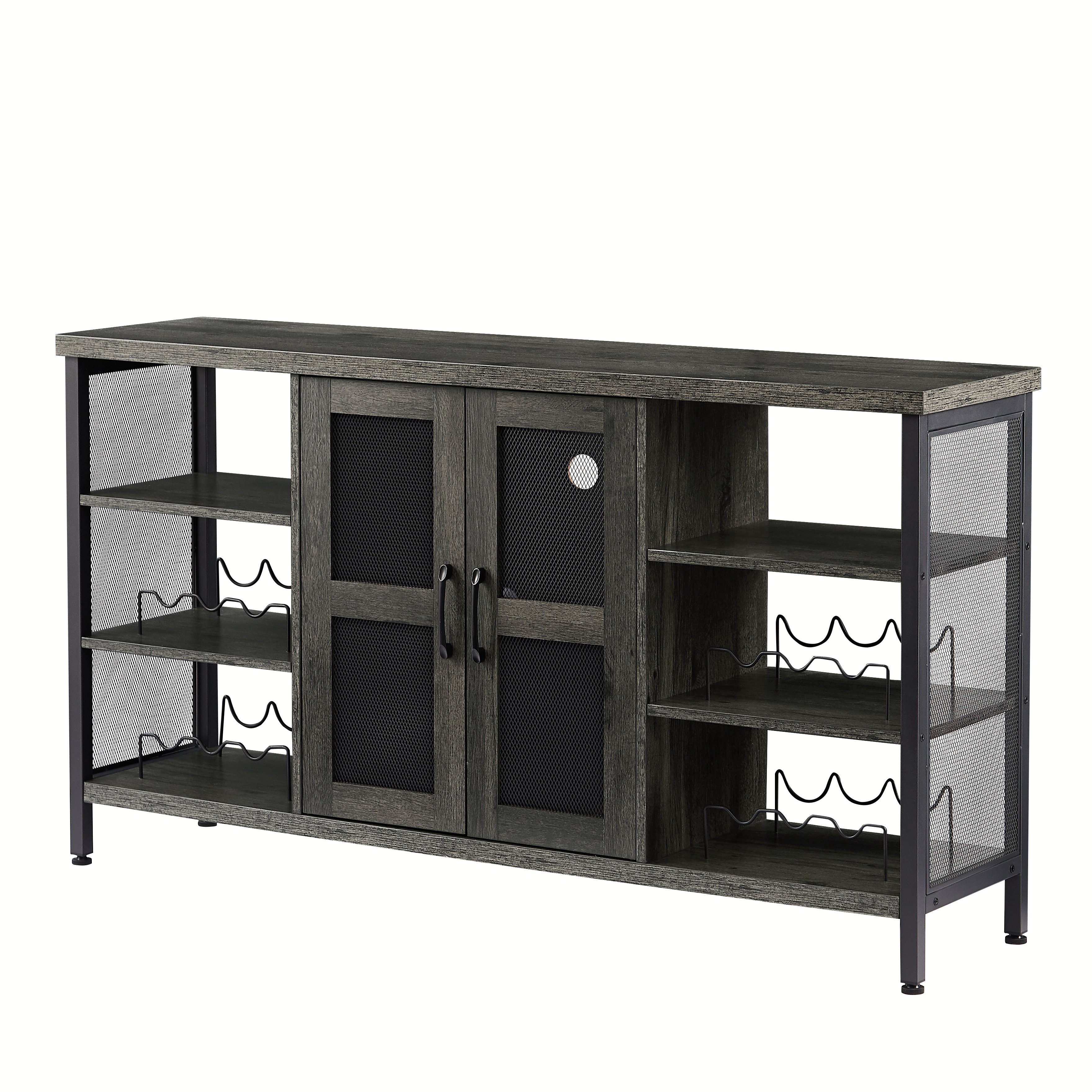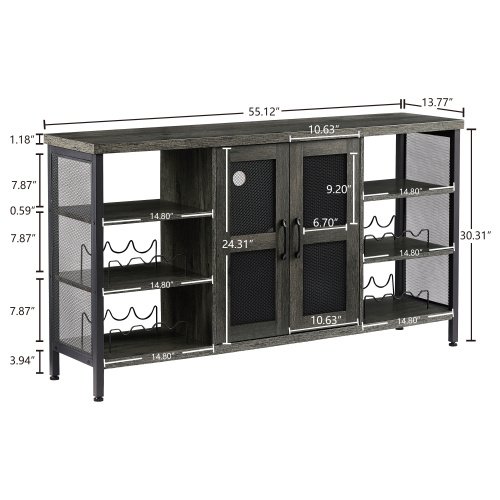 JHX Industrial Wine Bar Cabinet; Liquor Storage Credenza; Sideboard with Wine Racks & Stemware Holder (Dark Grey; 55.12''w x 13.78''d x 30.31' ' h)Pieces Included1 Wine cabinetProduct description•This double sideboard has ample storage capabilities for wine enthusiasts looking to securely store bartending essentials and stemware in a well-organized space.•Constructed from sturdy metal and durable load bearing engineered wood for a refined industrial design that can be applied to your dining; entryway; or family rooms.•Open shelving is available to display household ornaments; appliances; or utilize the provided wine racks to neatly store up to 12 spirits horizontally. •Easily transform the wood-grain tabletop into a decorative serving station and store extra entertainment necessities behind mesh paneled cabinet double doors to conceal clutter.•The enclosed cupboard area is also equipped with a stemware hanger for up to 9 glasses and a lighting feature that illuminates when the doors open.•Create the perfect area to host guests thanks to this deluxe liquor storage credenza. Product Information•Product Type: Wine Cabinet•Color: Dark Grey•Material: Particle board+Iron•Product Dimensions : 55.12'w x 13.78'd x 30.31'h•Tabletop Thickness: 1.18''•Internal laminate Thickness: 0.59''•Bottom plate Thickness: 1.18''•Tabletop Weight Capacity: 300 LBS(Uniform distribution)•middle laminate Weight Capacity: 100LBS•Bottom Weight Capacity: 300 LBS(Uniform distribution)•Assembly Required: About 40min•Package Number: 1Notice•Colorways and measurements may vary slightly.•Consult all warning information and use caution when assembling. •Liquids should be immediately blotted with a damp cloth. •Avoid the use of chemicals and household cleaners as they may damage the finish.•Adjust locks and hardware as needed.