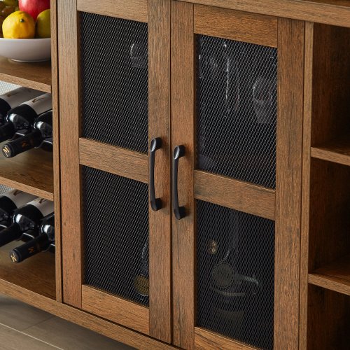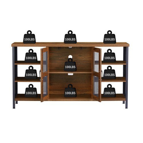JHX Industrial Wine Bar Cabinet; Liquor Storage Credenza; Sideboard with Wine Racks & Stemware Holder (Hazelnut Brown; 55.12''w x 13.78''d x 30.31' ' h)Pieces Included1 Wine cabinetProduct description•This double sideboard has ample storage capabilities for wine enthusiasts looking to securely store bartending essentials and stemware in a well-organized space.•Constructed from sturdy metal and durable load bearing engineered wood for a refined industrial design that can be applied to your dining; entryway; or family rooms.•Open shelving is available to display household ornaments; appliances; or utilize the provided wine racks to neatly store up to 12 spirits horizontally. •Easily transform the wood-grain tabletop into a decorative serving station and store extra entertainment necessities behind mesh paneled cabinet double doors to conceal clutter.•The enclosed cupboard area is also equipped with a stemware hanger for up to 9 glasses and a lighting feature that illuminates when the doors open.•Create the perfect area to host guests thanks to this deluxe liquor storage credenza. Product Information•Product Type: Wine Cabinet•Color: Hazelnut Brown•Material: Particle board+Iron•Product Dimensions : 55.12'w x 13.78'd x 30.31'h•Tabletop Thickness: 1.18''•Internal laminate Thickness: 0.59''•Bottom plate Thickness: 1.18''•Tabletop Weight Capacity: 300 LBS(Uniform distribution)•middle laminate Weight Capacity: 100LBS•Bottom Weight Capacity: 300 LBS(Uniform distribution)•Assembly Required: About 40min•Package Number: 1Notice•Colorways and measurements may vary slightly.•Consult all warning information and use caution when assembling. •Liquids should be immediately blotted with a damp cloth. •Avoid the use of chemicals and household cleaners as they may damage the finish.•Adjust locks and hardware as needed.