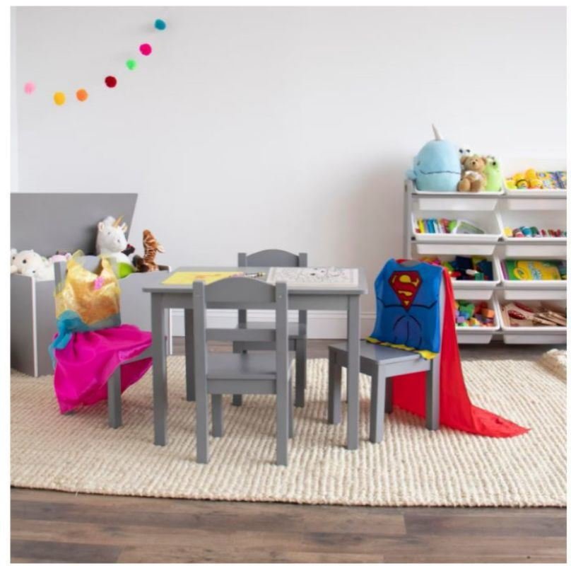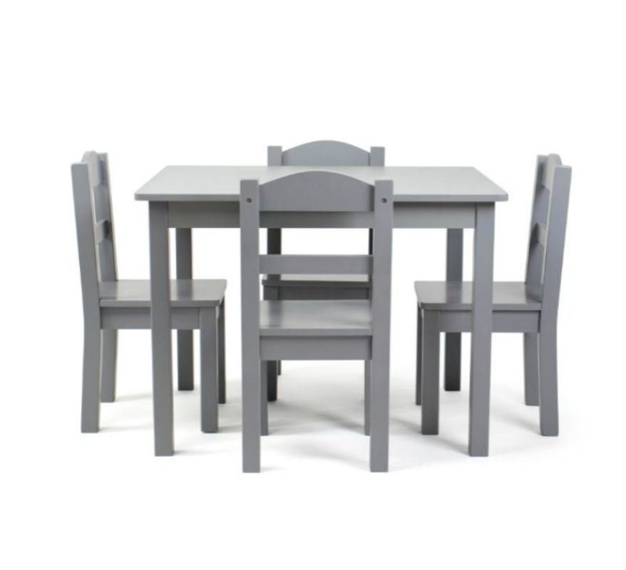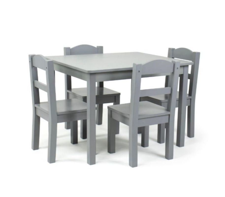 Product DetailsThis kids table and chair set is just the right size for growing children and will host tons of coloring and art projects, snack time, and creative play for years to come. Modern children's furniture set includes a gray square children's table and four gray chairs to provide years of creative fun. Durable and sturdy engineered wood construction. Easy to assemble. The table and chairs are specially designed for your child and are perfect for ages 3 and up. Product Dimensions: Table - . Chair - 10" x 10" x 22" H. Seat Height - 10 in.Great for eating, reading, coloring, arts and crafts, playing board games and moreSturdy engineered wood construction is easy to assembleThe unisex design makes this product suitable for any environment.Perfect for a child's bedroom, playroom or living roomProduct Size Chart: 26"W x 22"D x 19"H, Chair: 10"W x 10"D x 22"H, Seat Height: 10"Hwipe clean with a soft cloth