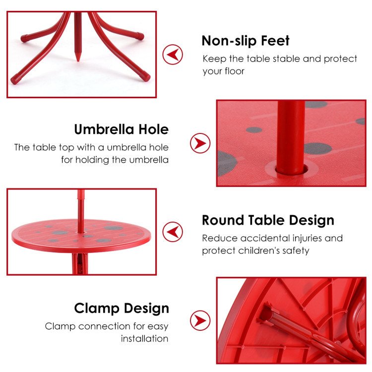 2.Adjustable Height & Removable Umbrella: This table and chairs set with an umbrella protect your baby from harmful rain and direct sunlight. It has a removable umbrella in case of indoor use. In addition, the height of the umbrella can be adjusted from 47'' to 50'' according to your requirements.