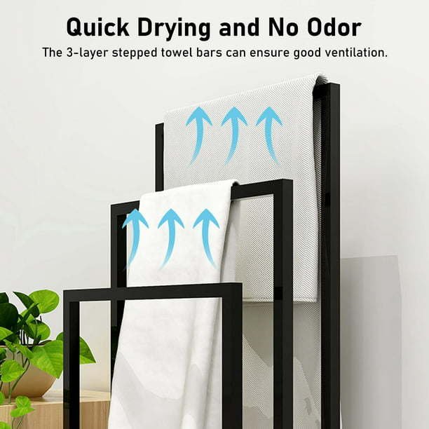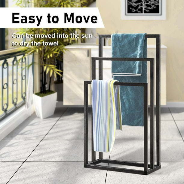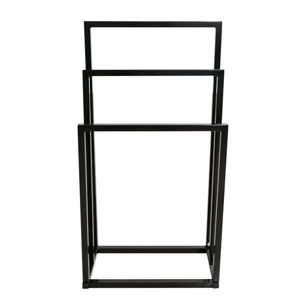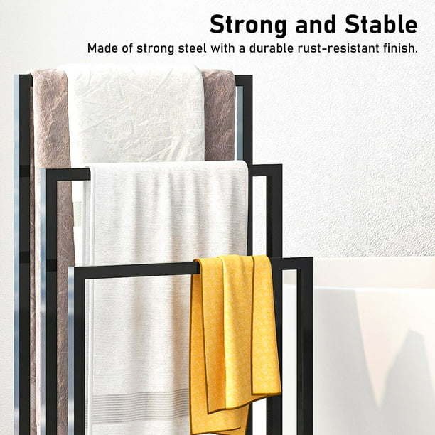 Bring organization, storage, and modern style to your bathroom with this convenient towel rack. The Aukfa AK-HTR1-001 3-tier bars provide you with plenty of space to hang and store bath towels, hand towels, washcloths, bathmats, and more. The rectangular base on this towel stand keeps it upright and prevents tipping when loaded with wet towels. With a variety of functions, and a stylish look well-suited to modern decor, this distinctive towel stand can be at home anywhere in the home. For a stylish way to keep your towels organized and within easy reach, make this freestanding towel rack a part of your home today.STYLISH AND ELEGANT -With its elegant modern style, beautiful black lines, and simple bar design, this AK-HTR1-001 towel rack standing adds a unique touch of sophistication to your bathroom and complements a variety of home decor styles. Say goodbye to crumpled and damp towels!LARGE SIZE DESIGN -Measuring 34.84"L x 8.66"W x 33.86"H, this free standing towel rack has ample height and width to accommodate extra-large towels and blankets. Its large rectangular base ensures stability without tipping.3 TIER FREE STANDING - The freestanding towel rack is designed with 3 sturdy stepped towel bars providing ample space to hang and dry your towels and clothes. Its open-air construction allows for optimal air circulation, ensuring quick and efficient drying. It features good ventilation and is perfect for drying multiple towels at once.MULTIFUNCTIONAL USE - This towel racks can be used in the bathroom for hanging hand towels and bath towels. It can also be used in the corner to store clothing, such as coats, scarves, etc. The towel rack is suitable for bathroom, living room, bedroom, laundry room, kitchen.STURDY CONSTRUCTION - This towel rack holder is made of high-quality and sturdy metal fram that is well-sanded and smoothed out without any rough edges.QUICK TO ASSEMBLE -Please carefully read the product size information before purchasing to ensure you get the right size. The bathroom towel racks feature a straightforward design and step-by-step instructions that make installation a breeze.