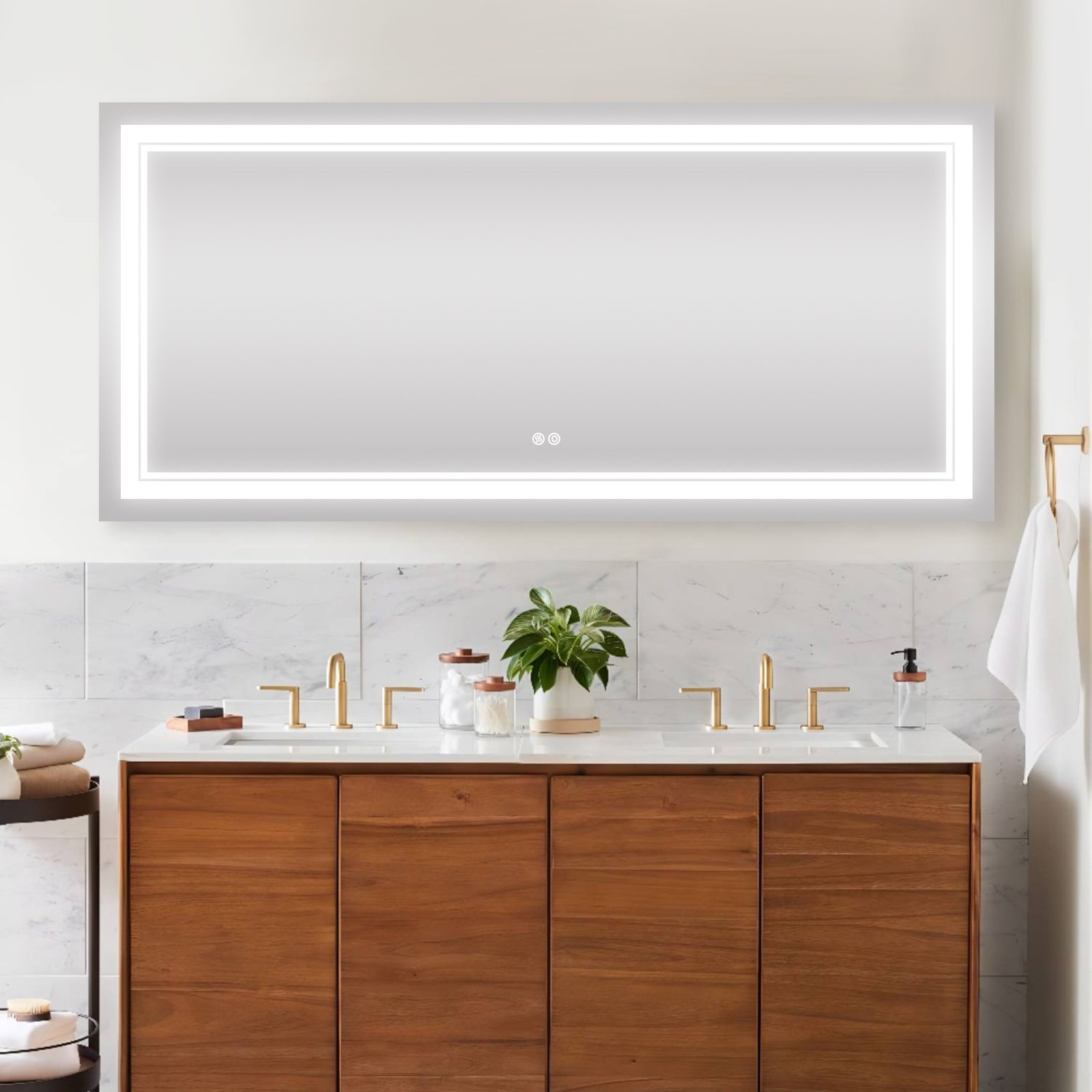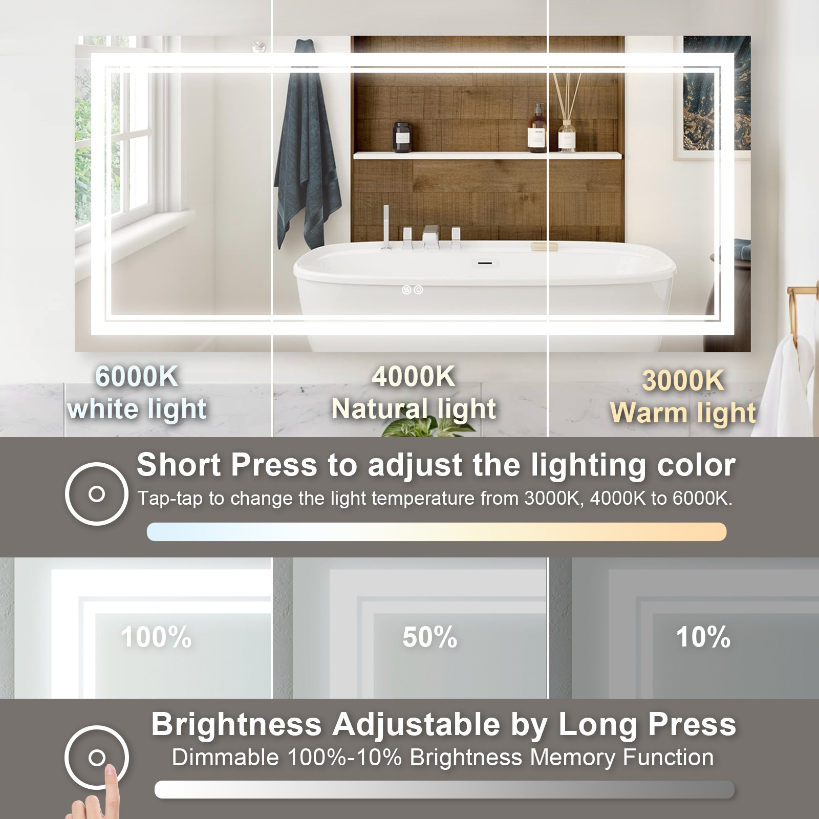 The bathroom mirror with LED light; Made of high qualit Anodized aluminum can be used for long time. High tech Intelligent bathroom vanity makeup mirror with defogging function. Touch sensor button can adjustable mirror color brightness from 2700K-6300K to meet the needs of different light. Brightness can be adjusted freely from 10 % to 100%. Large size bathroom mirrors wall mounted design; it is space-saving. Bright mirror can make your bathroom or living room can be more spacious; Better mood. Perfect for bathroom; bedroom; dressroom; powder room and more.