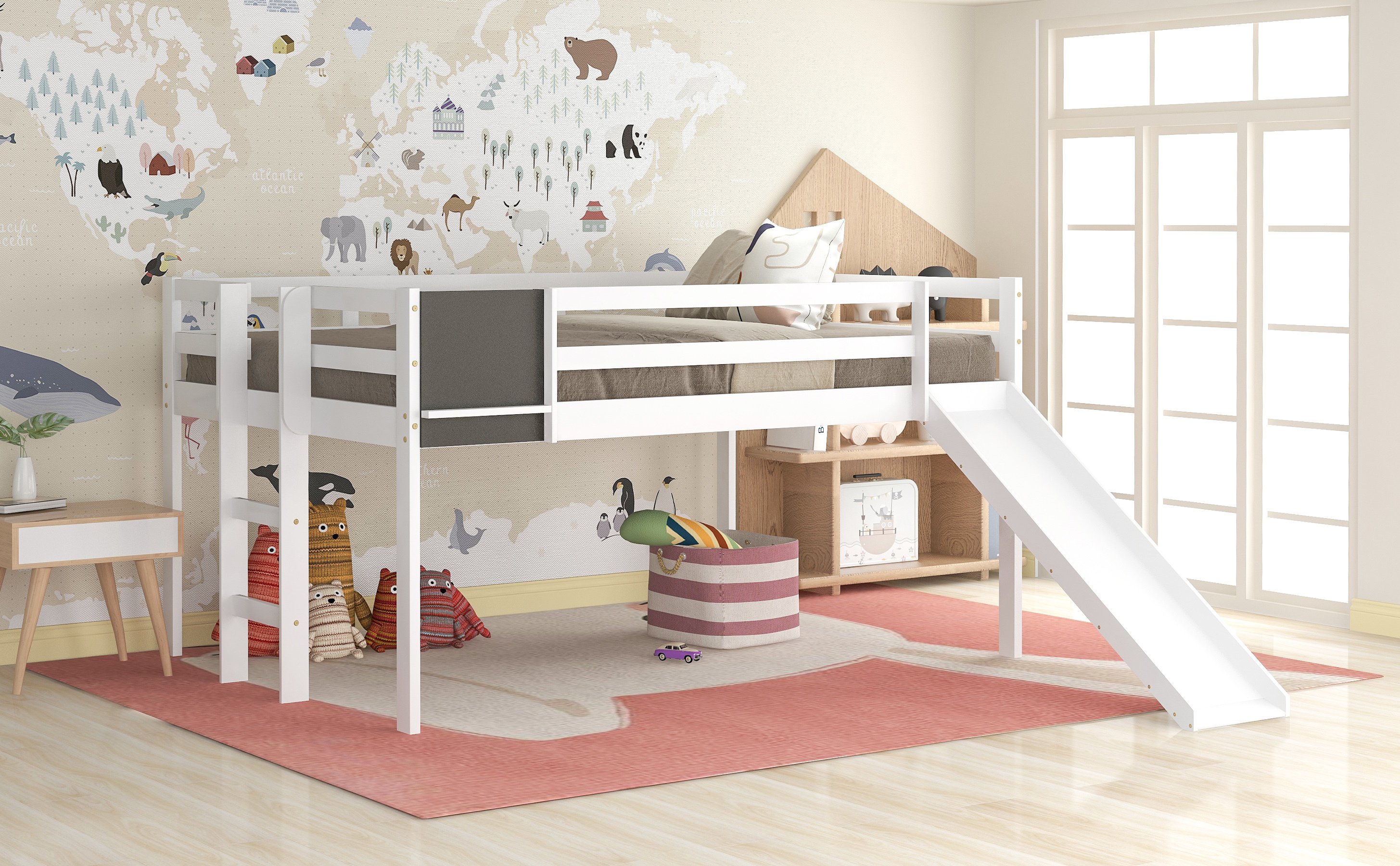 2.[Convertible Ladder and Slide] With built-in ladder, it is easy for you to climb up and down from the top bed. Featuring a slide for you to play, this loft bed can add fun to you and develop your sense of balance and coordination. The slide and the ladder are convertible, both of them can be put front or side. What’s more, the chalkboard can be put front or side.