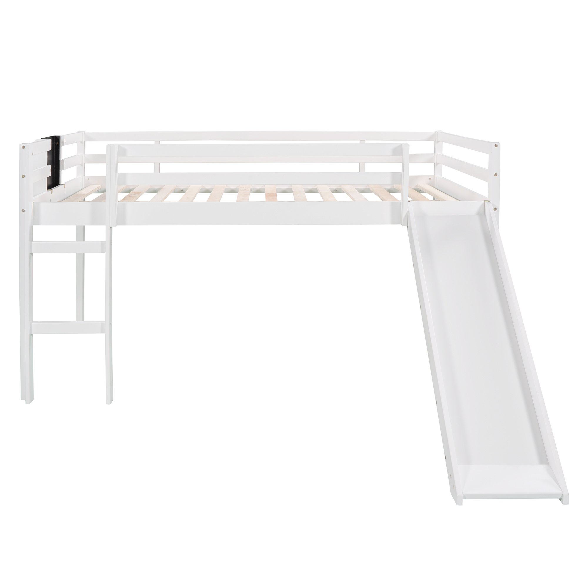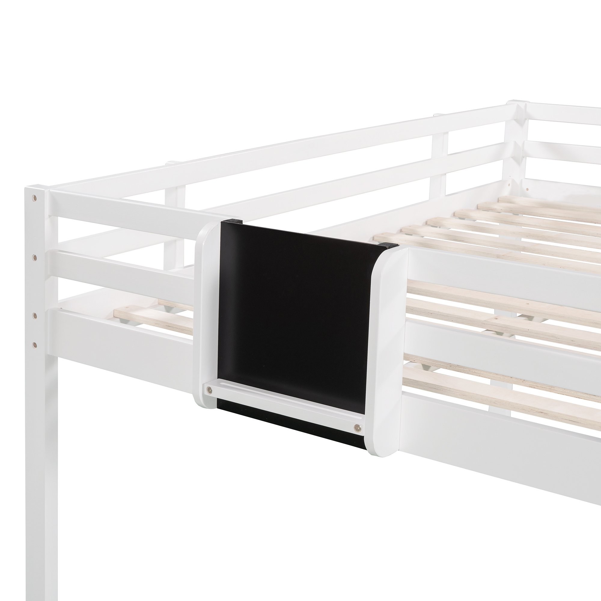This interesting design loft bed offer the chance to push you gain more happiness in bedroom. The chalkboard set on the side of bed allow you use your imagination and creativity at any time; and stimulate the potential of your brain. For added extra fun; slide is included and can be put either left or right. The 13.7" tall guardrails to keep your safe on the top bed. High-quality; solid pine legs and a strong; durable frame ensures stability and durability for long-term use. Slat kit included so box springs are not required. This loft bed is designed with a clean silhouette and a hue of elegance. It suits all styles of home decoration; and completes the look of any bedroom.