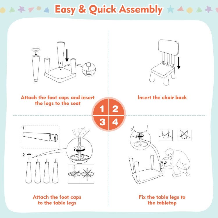 4.Sturdy and Stable Construction: Made of non-toxic and odorless PP material, this kids table and 2 chairs set can be used for a long time and comes with a strong loading capacity of 110 lbs. Meanwhile, this kid's furniture set with ASTM certification grows with your little one who is 1 - 7 years old.