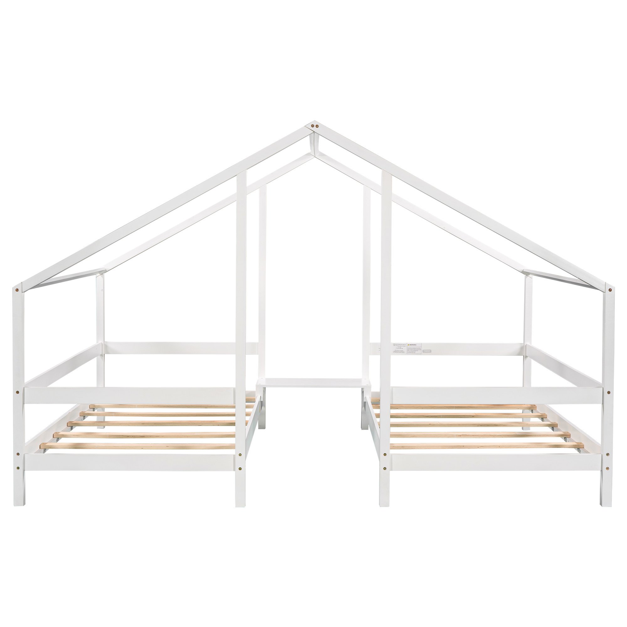 The double twin-size canopy triangular house bed with a built-in little table is an eye-catching piece with a modern design that will make the perfect centerpiece for your bedroom. It is crafted with sturdy pine wood and MDF construction. Two beds can be used as either a platform bed or a daybed, with a small table in the middle of the bed for your convenience to store goods like bottles or phones.