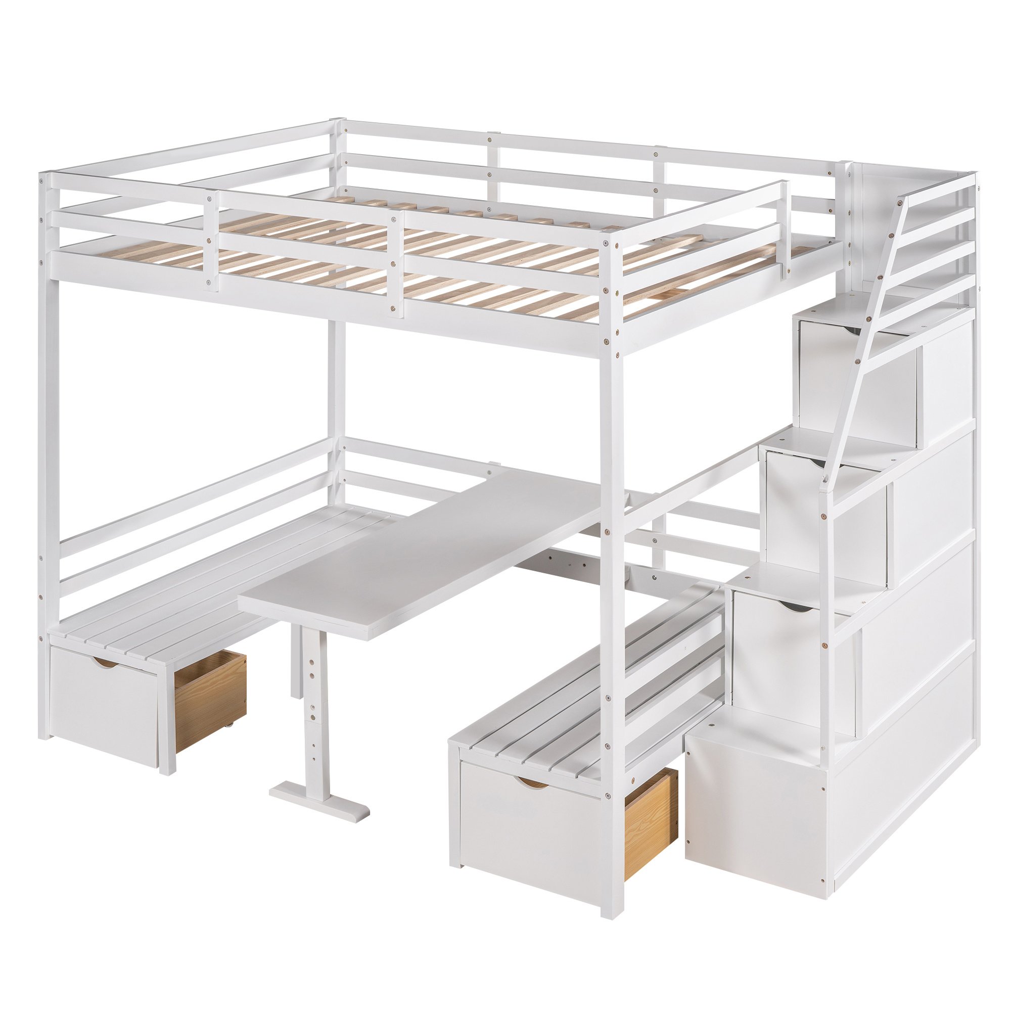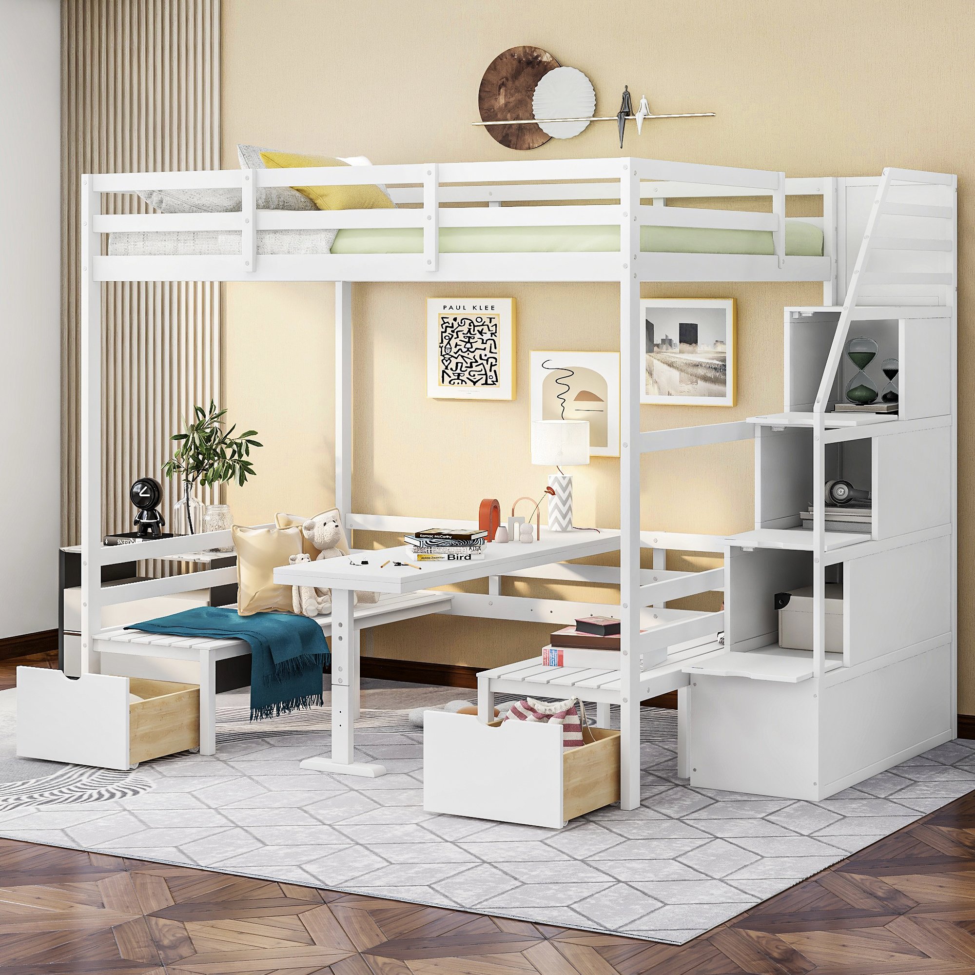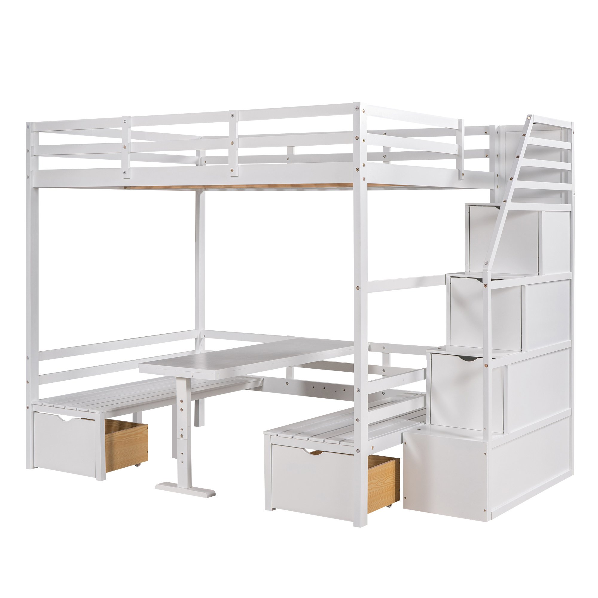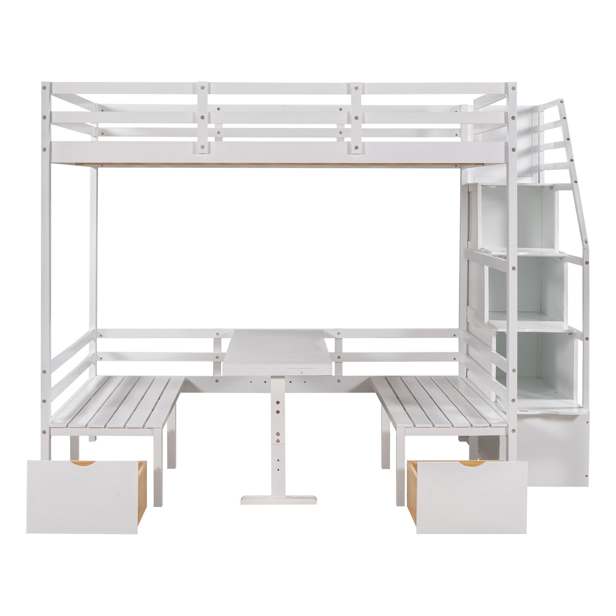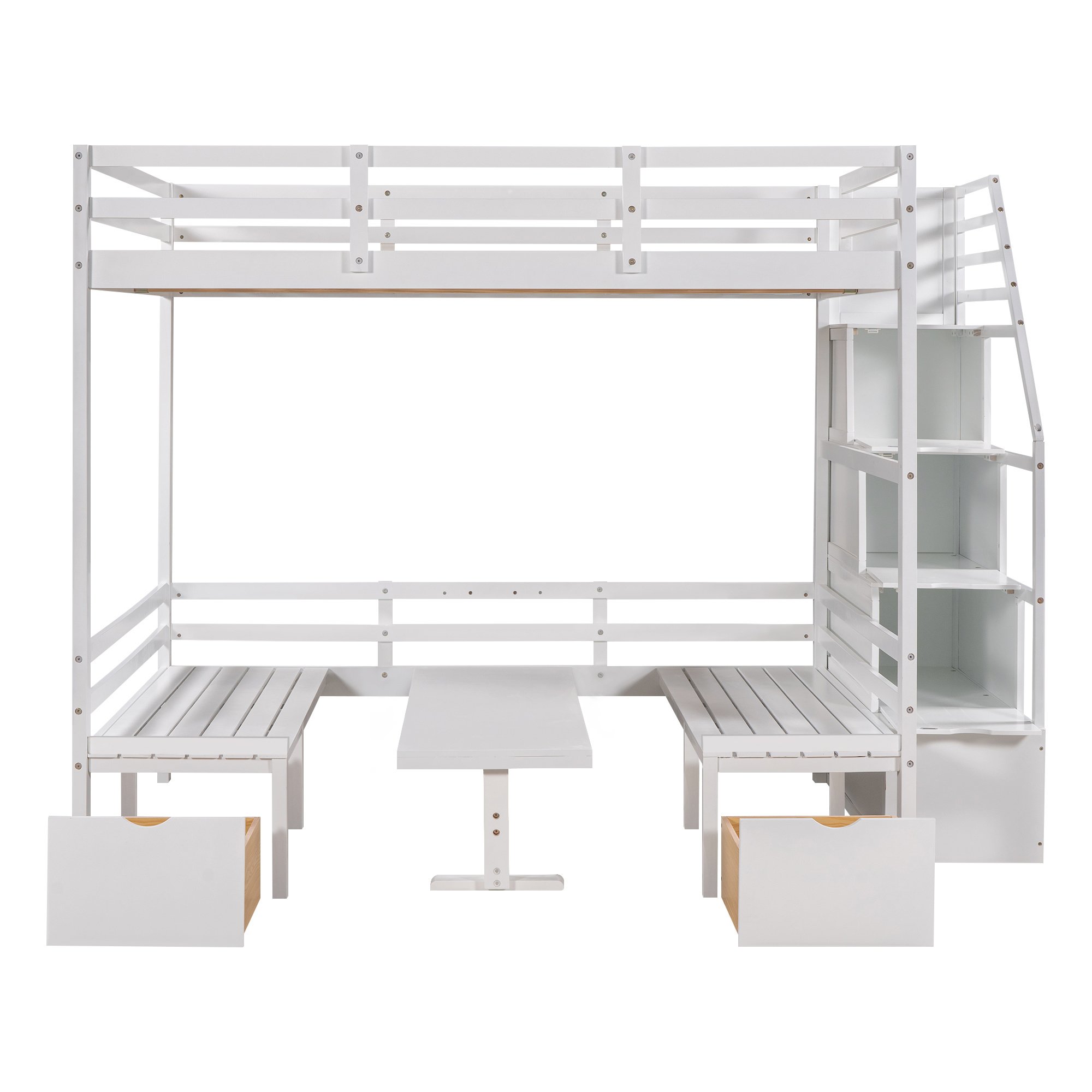 This wisely designed piece of bedroom furniture dramatically enhances your small spaces; making them grander and more versatile for not only sleeping time but also reading; entertaining or even meal time. Most importantly; it's a convertible full bunk bed which can effortlessly convert into a table with two seats. It is a super worthy investment as a space-saving solution for your home! The storage staircase attached to the side can not only be used as the stairs to enter the upper floor; but also can store daily necessities.