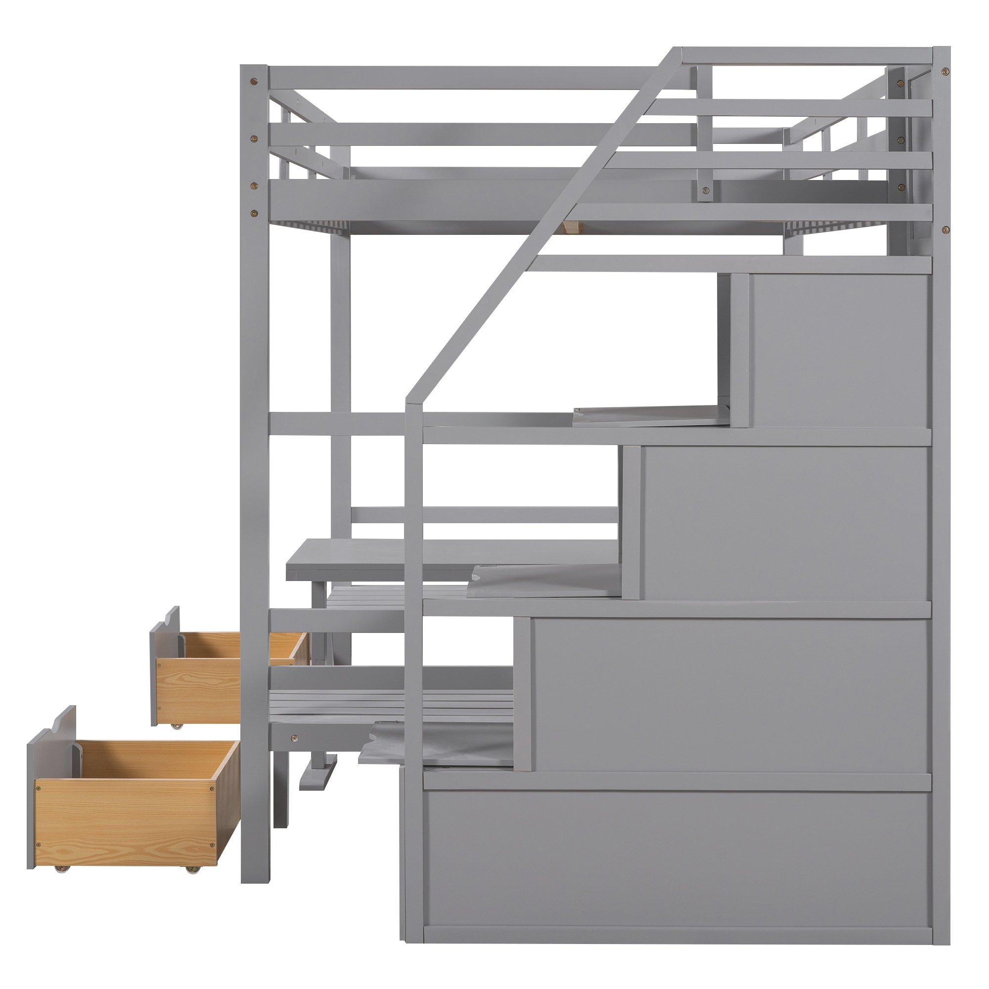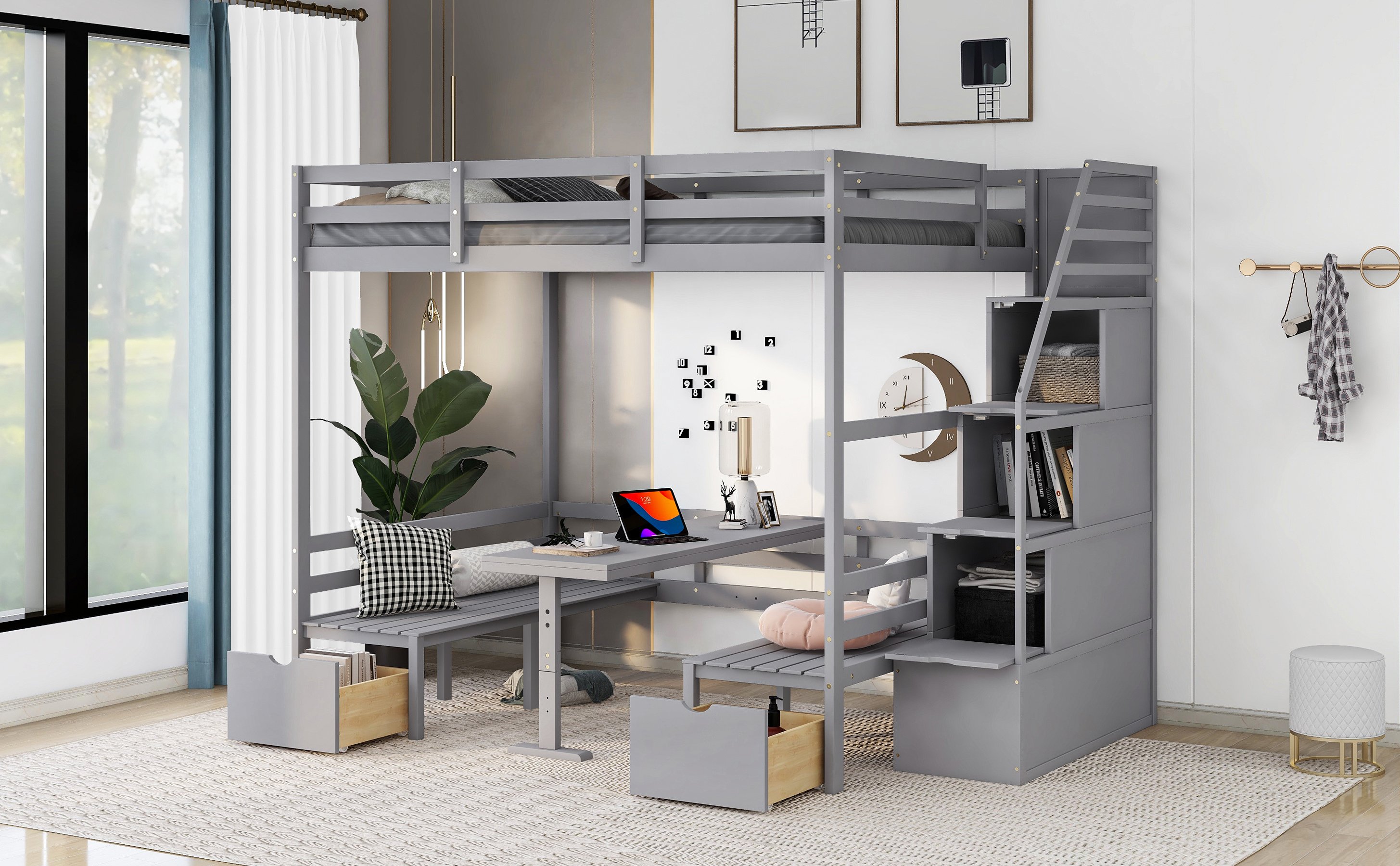 This wisely designed piece of bedroom furniture dramatically enhances your small spaces; making them grander and more versatile for not only sleeping time but also reading; entertaining or even meal time. Most importantly; it's a convertible full bunk bed which can effortlessly convert into a table with two seats. It is a super worthy investment as a space-saving solution for your home! The storage staircase attached to the side can not only be used as the stairs to enter the upper floor; but also can store daily necessities.