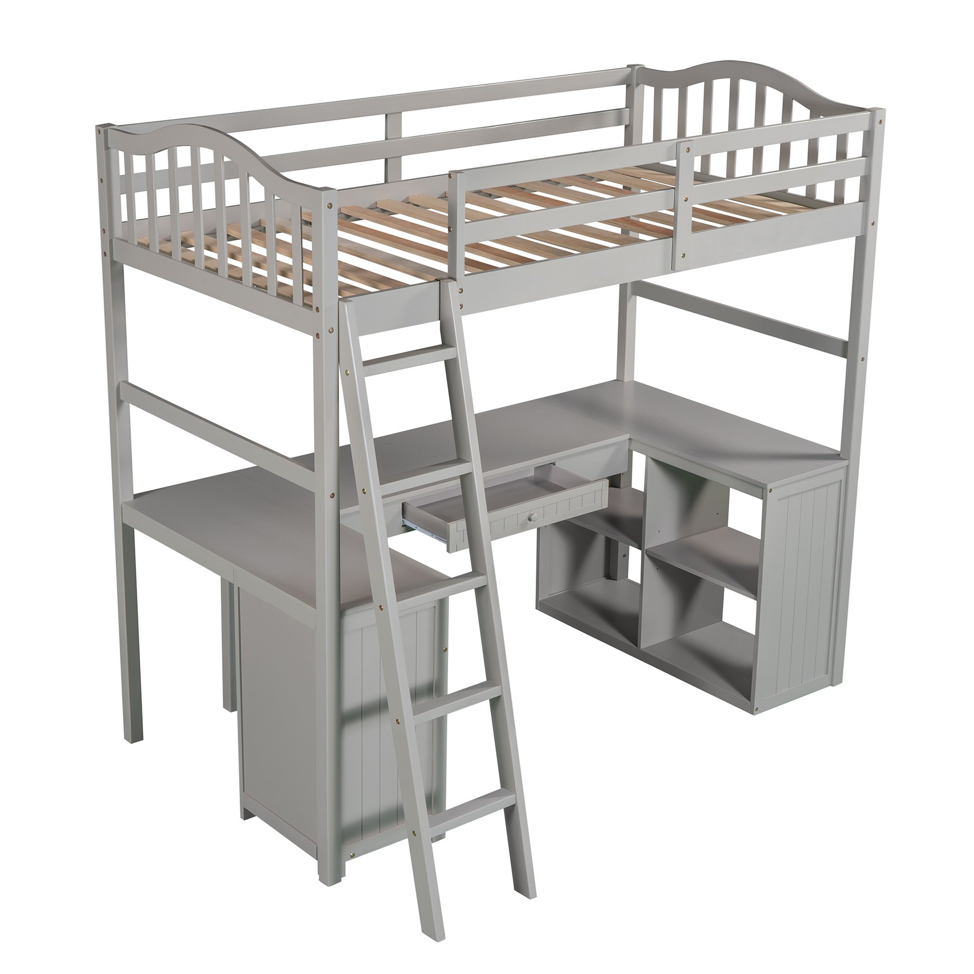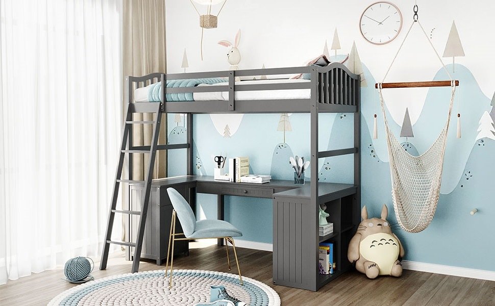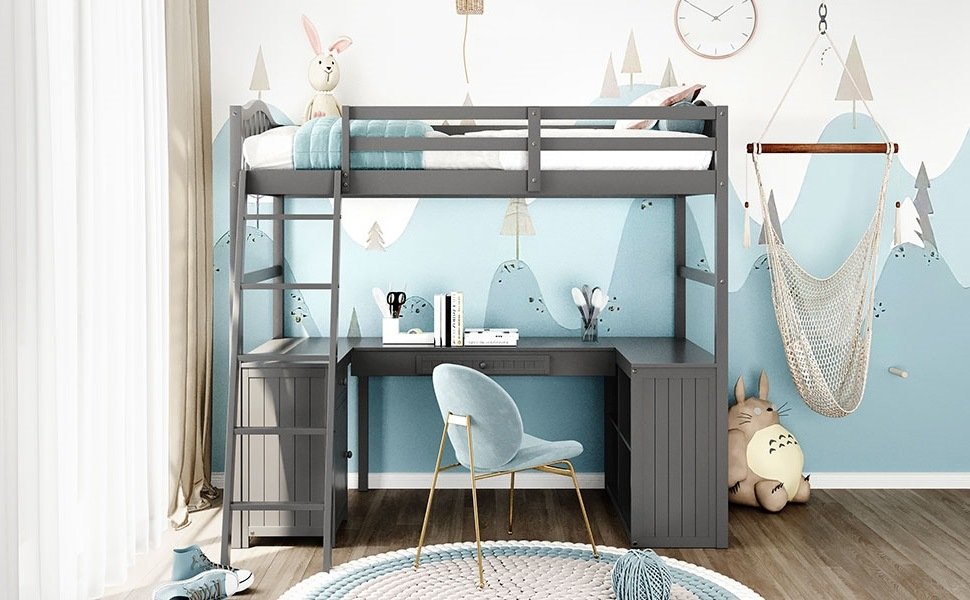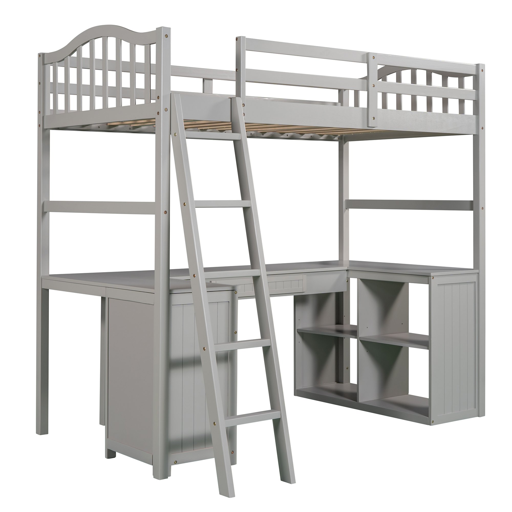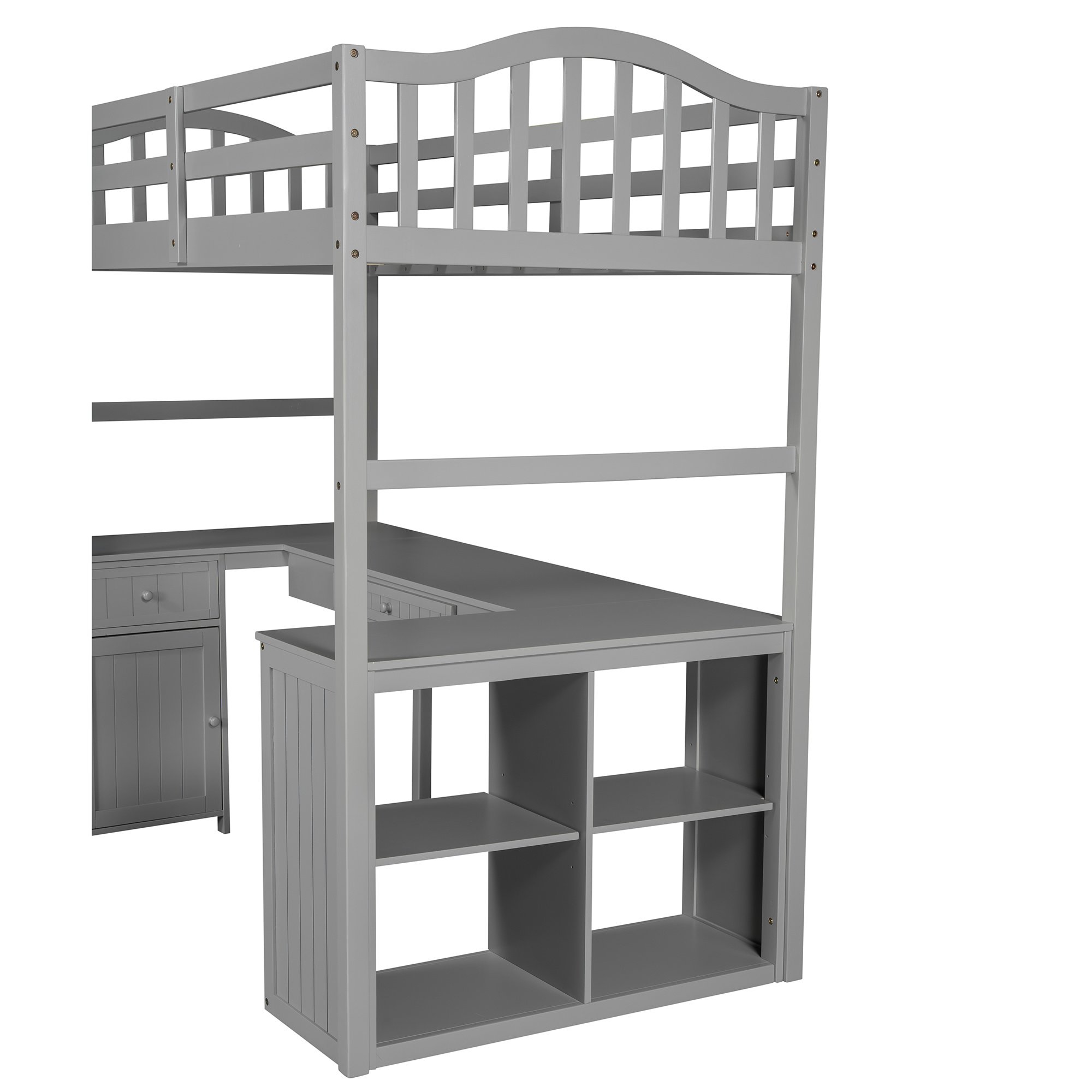 Unlock the possibilities with the Loft Bed with Drawer; Cabinet; Shelves and Desk in twin size; which will have you saving space and maximizing functionality with a wide array of features. Designed with a wooded desk; two drawers; a cabinet and four shelves; it is a perfect study area while also allowing space to store your belongings. Available in versatile gray finish for the perfect fit with your décor.