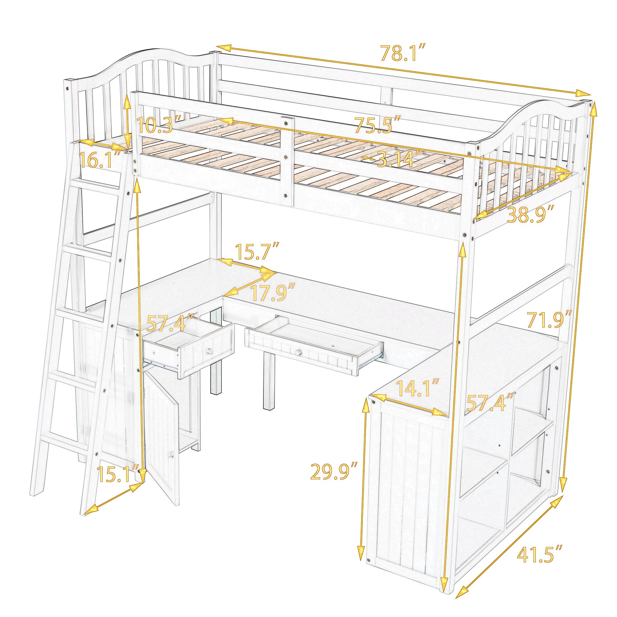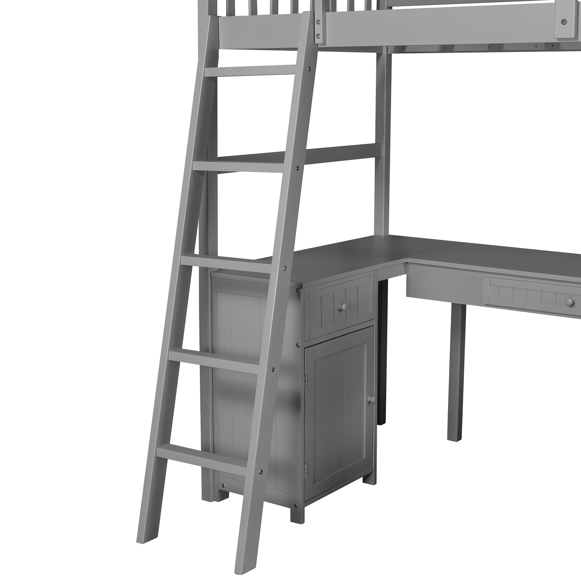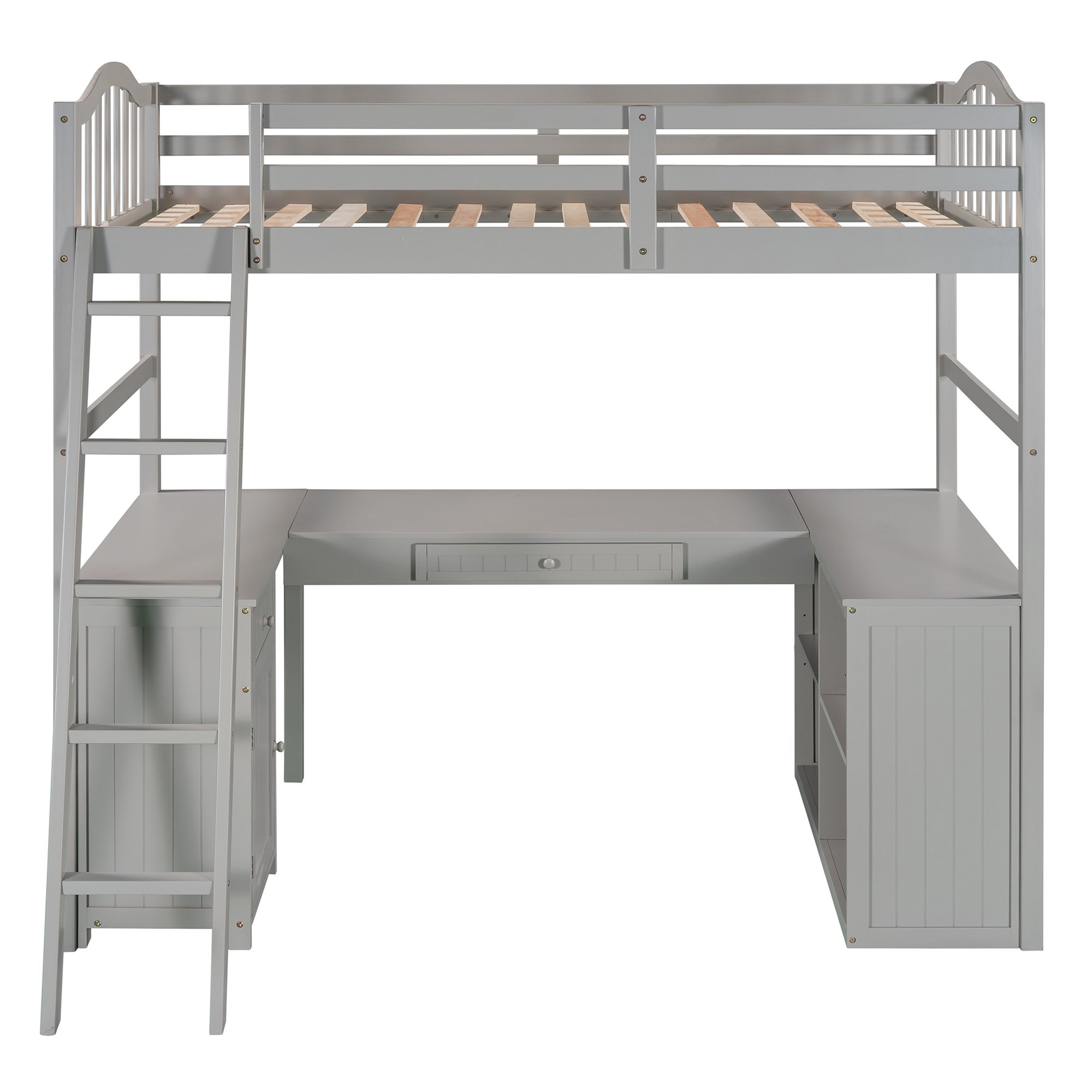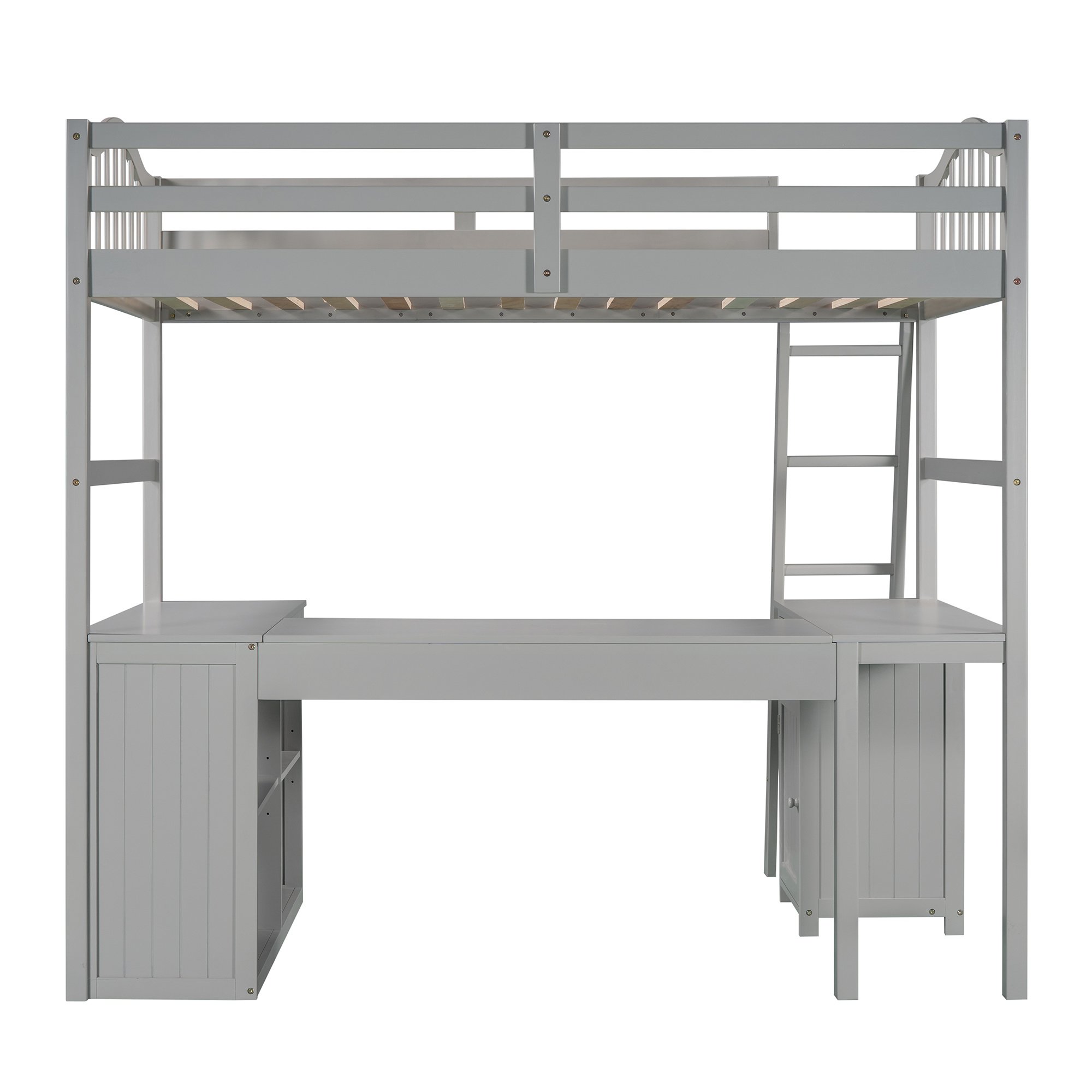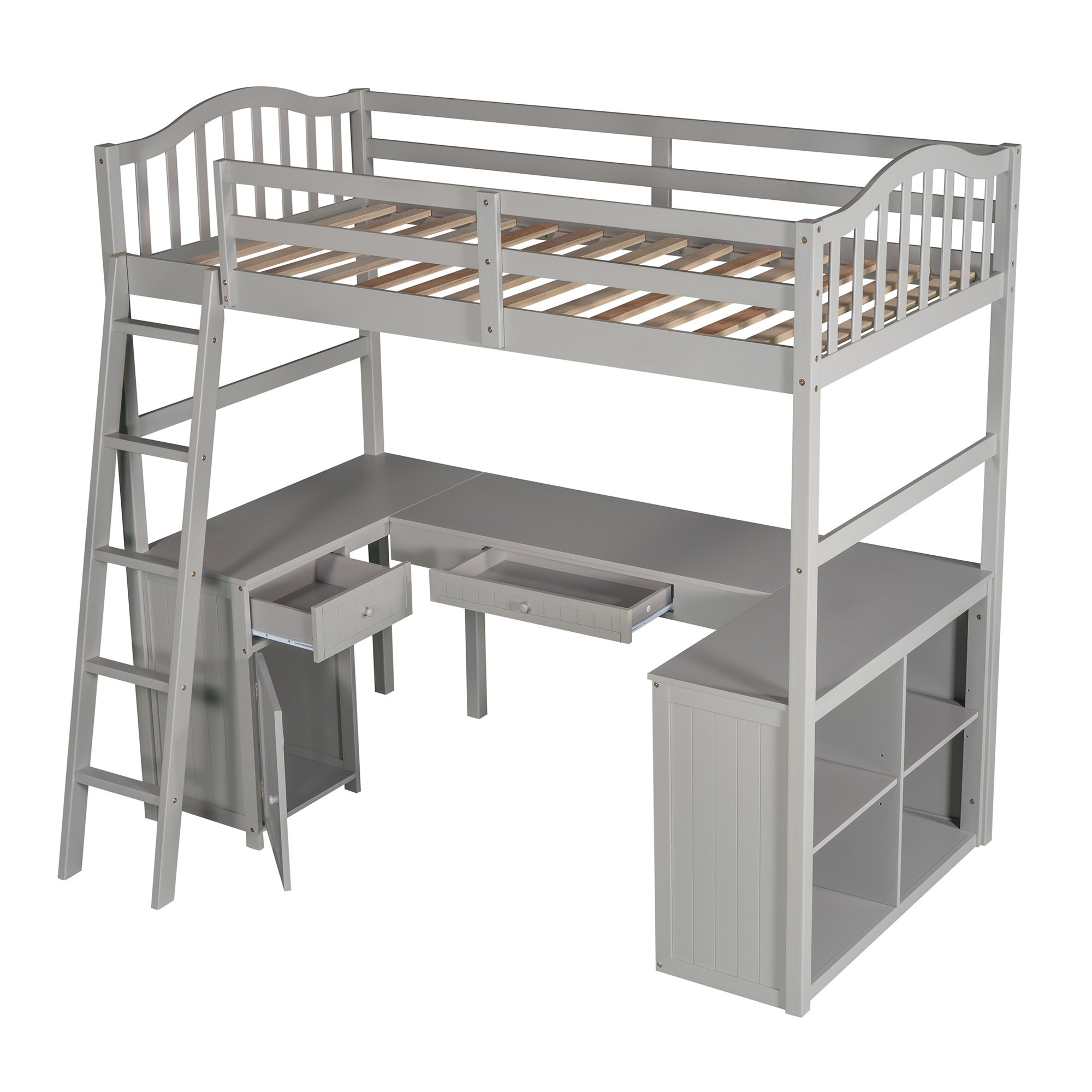 Unlock the possibilities with the Loft Bed with Drawer; Cabinet; Shelves and Desk in twin size; which will have you saving space and maximizing functionality with a wide array of features. Designed with a wooded desk; two drawers; a cabinet and four shelves; it is a perfect study area while also allowing space to store your belongings. Available in versatile gray finish for the perfect fit with your décor.