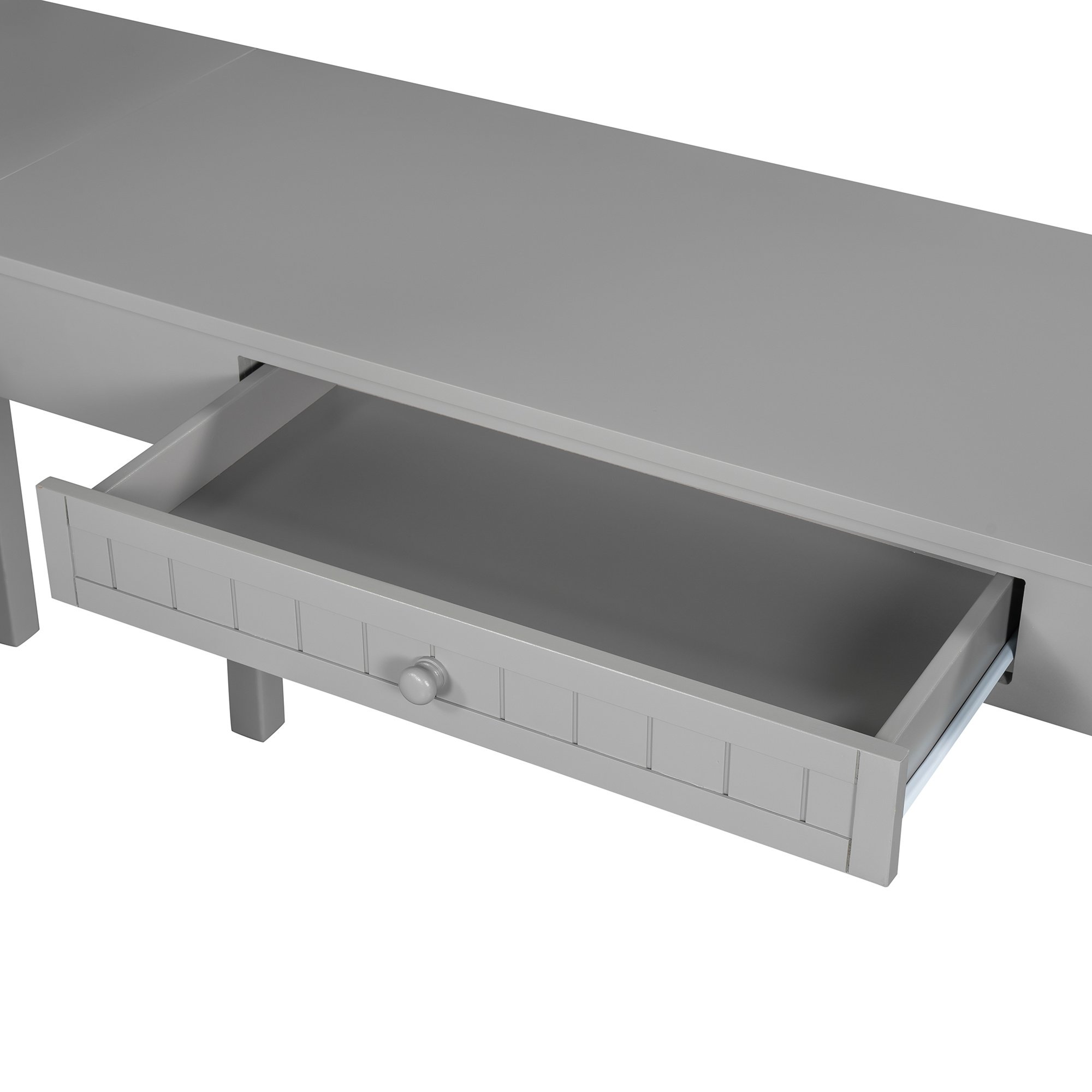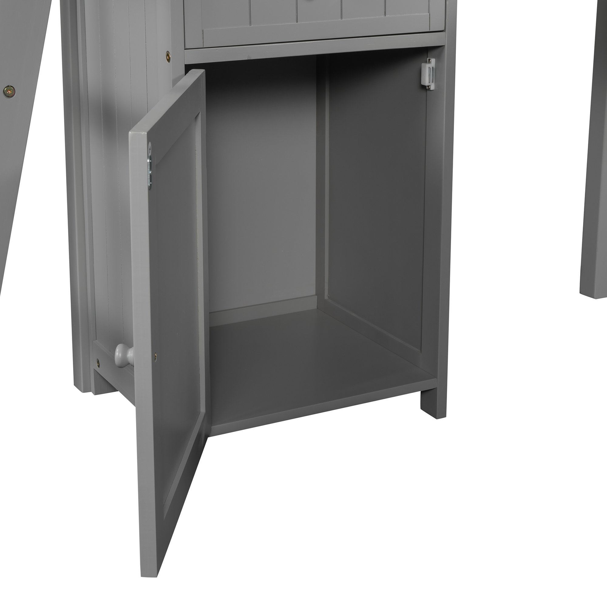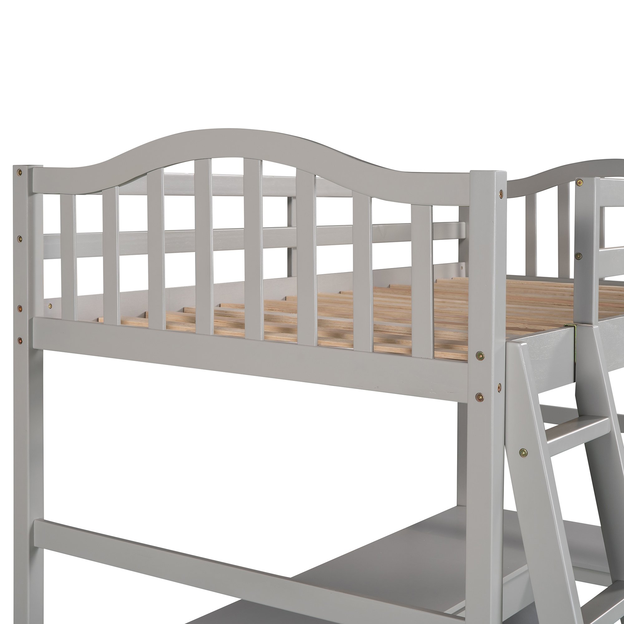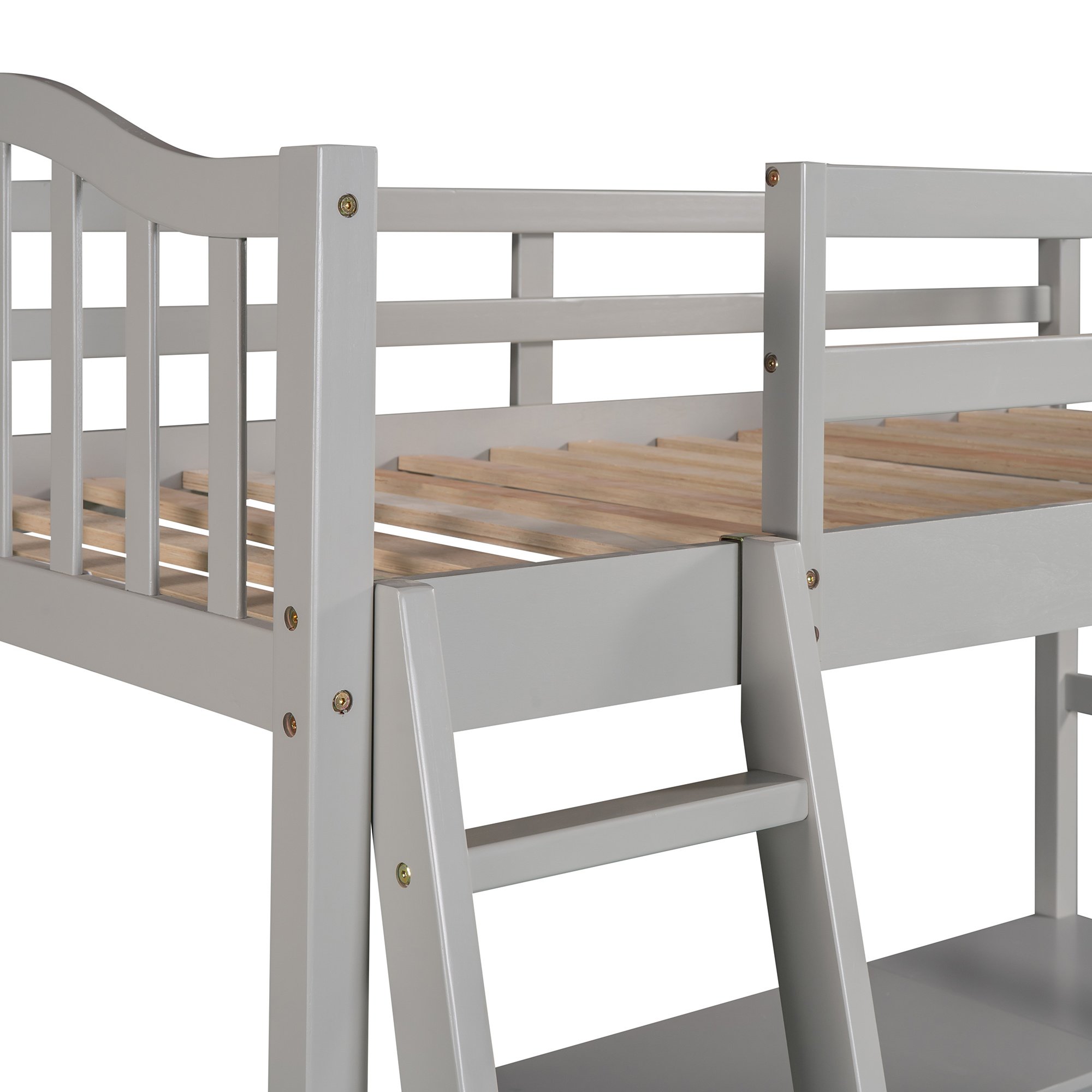 Unlock the possibilities with the Loft Bed with Drawer; Cabinet; Shelves and Desk in twin size; which will have you saving space and maximizing functionality with a wide array of features. Designed with a wooded desk; two drawers; a cabinet and four shelves; it is a perfect study area while also allowing space to store your belongings. Available in versatile gray finish for the perfect fit with your décor.