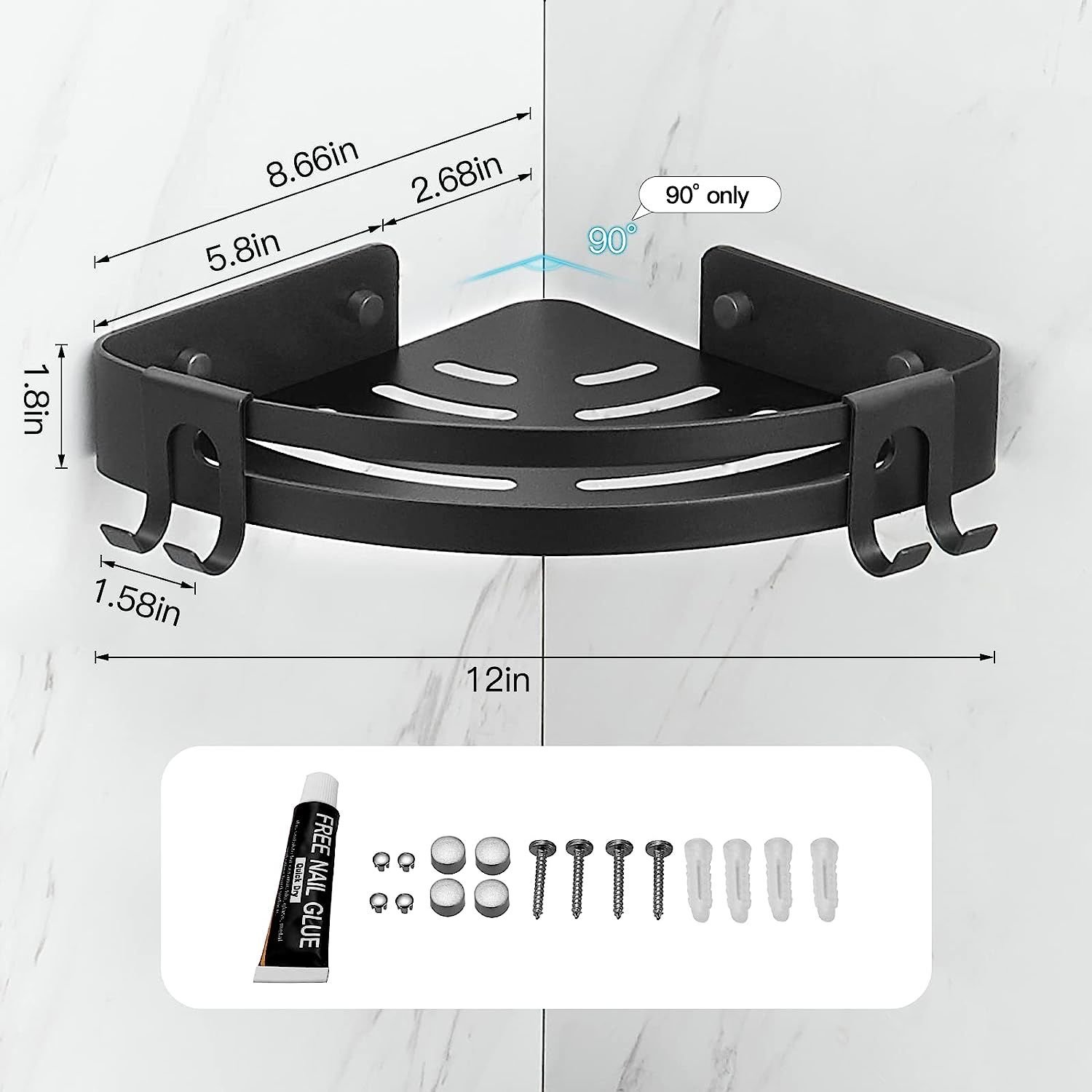 [TWO INSTALLATION METHODS] The corner shower caddy comes with both screws and glue, you can choose drilling or adhesive mounting. Note: The adhesive installation is suitable smooth hard surfaces such as ceramic tiles, smooth marbles, glass, metal, and solid woods. And the corner of shower shelf only suit for suit for 90 degree corner, not suit for rounded corner.