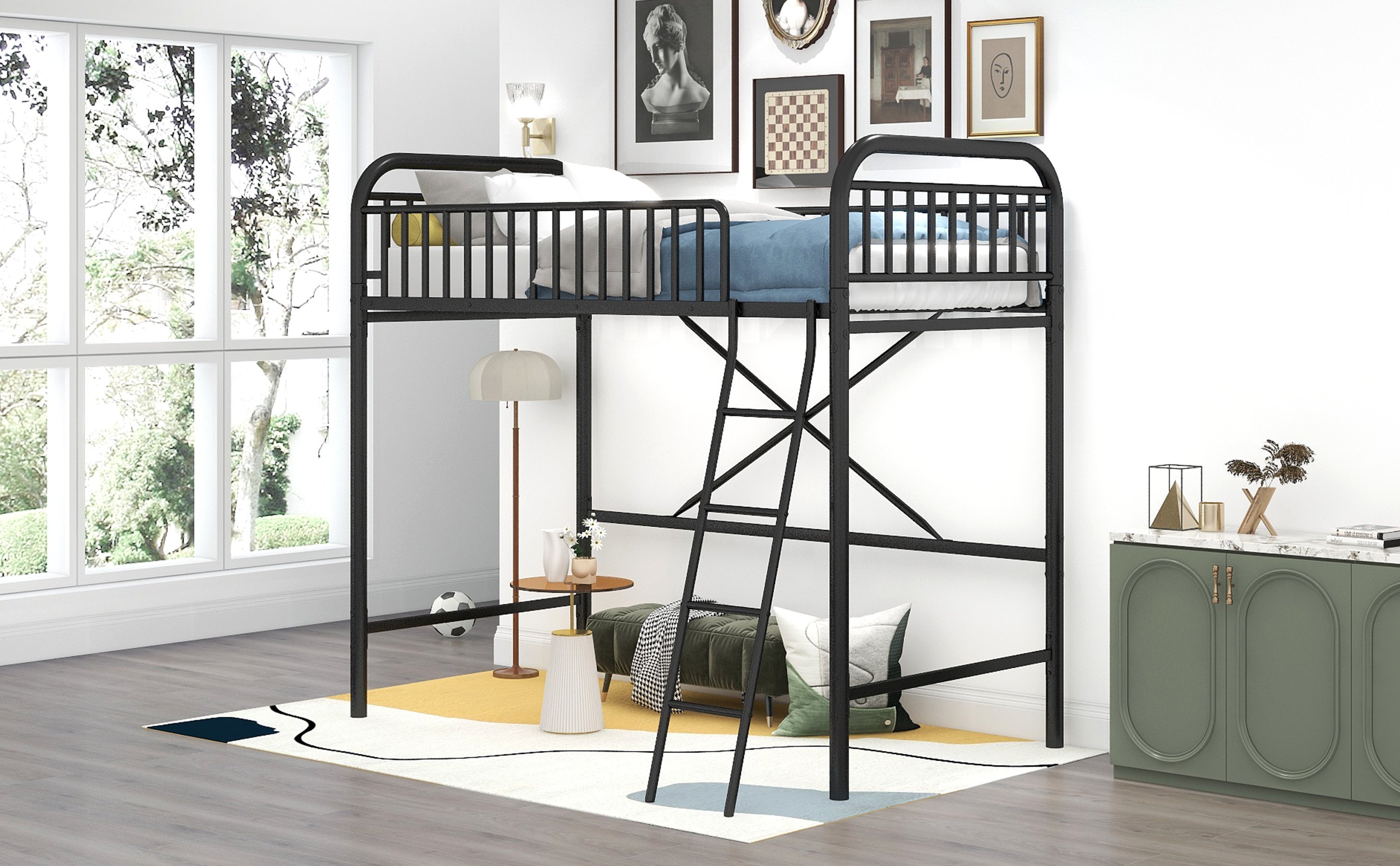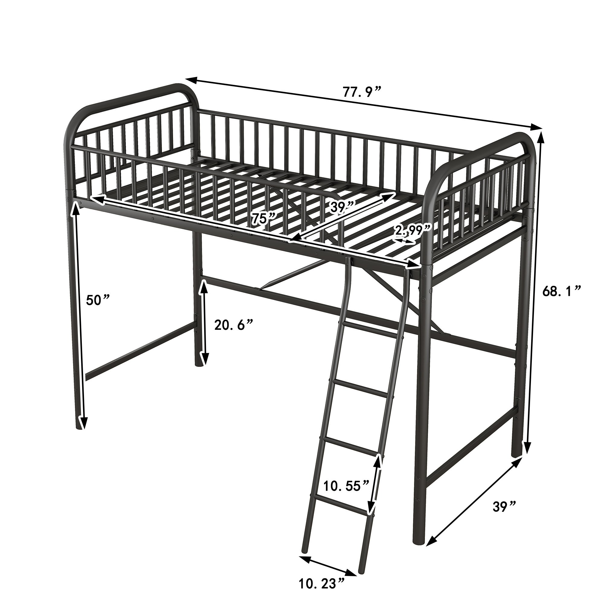 This loft bed is a stylish and fun choice for your child's room because it is an innovative storage solution that optimizes space. It consists of a single loft bed; ideal for rooms with limited space. The bottom space can easily accommodate a study area desk; game center; dresser; or furniture of your choice. The whole bed is made of high-quality metal. The strong metal frame makes this bed durable; and the metal railing on the upper bunk adds extra safety to ensure your sleep safety.