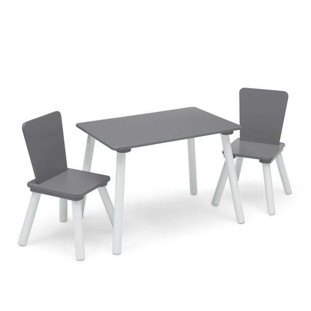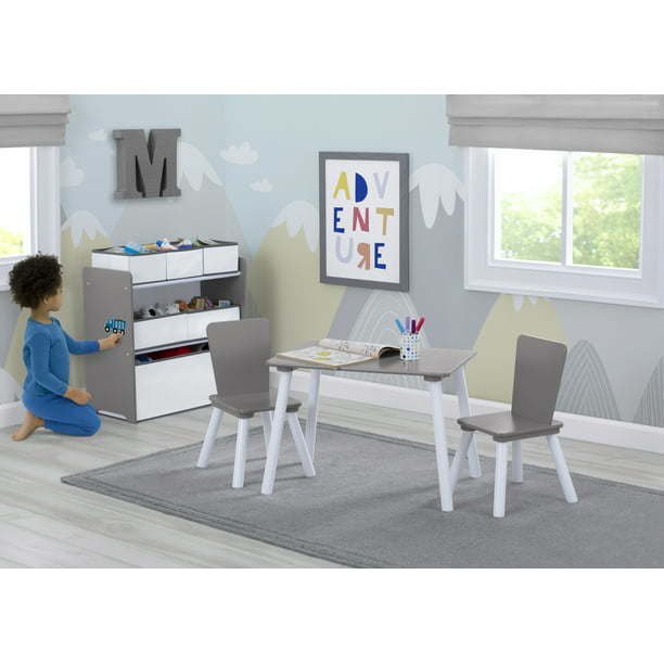Complete your child's playroom or bedroom with this 4-Piece Toddler Playroom Set . Vibrant and playful, this set includes a wooden play table with dry erase tabletop, two coordinating chairs and a toy organizer. Also included in this set, a set of reusable vinyl cling stickers that kids will love arranging to the sides of the toy organizer to create a new story every time they play. All items are at the perfect kid-sized height to help teach your little one responsibility and independence as they play, eat and clean up on their own. The adorable two-tone design ensures your little one's playroom is a stylish and charming as the rest of your home. Ideal for both boys and girls, this kids' playroom set comes in two colors, Grey/White and Pink/White. Get it today--the play possibilities are endless with this versatile set! Recommended for ages 3+.