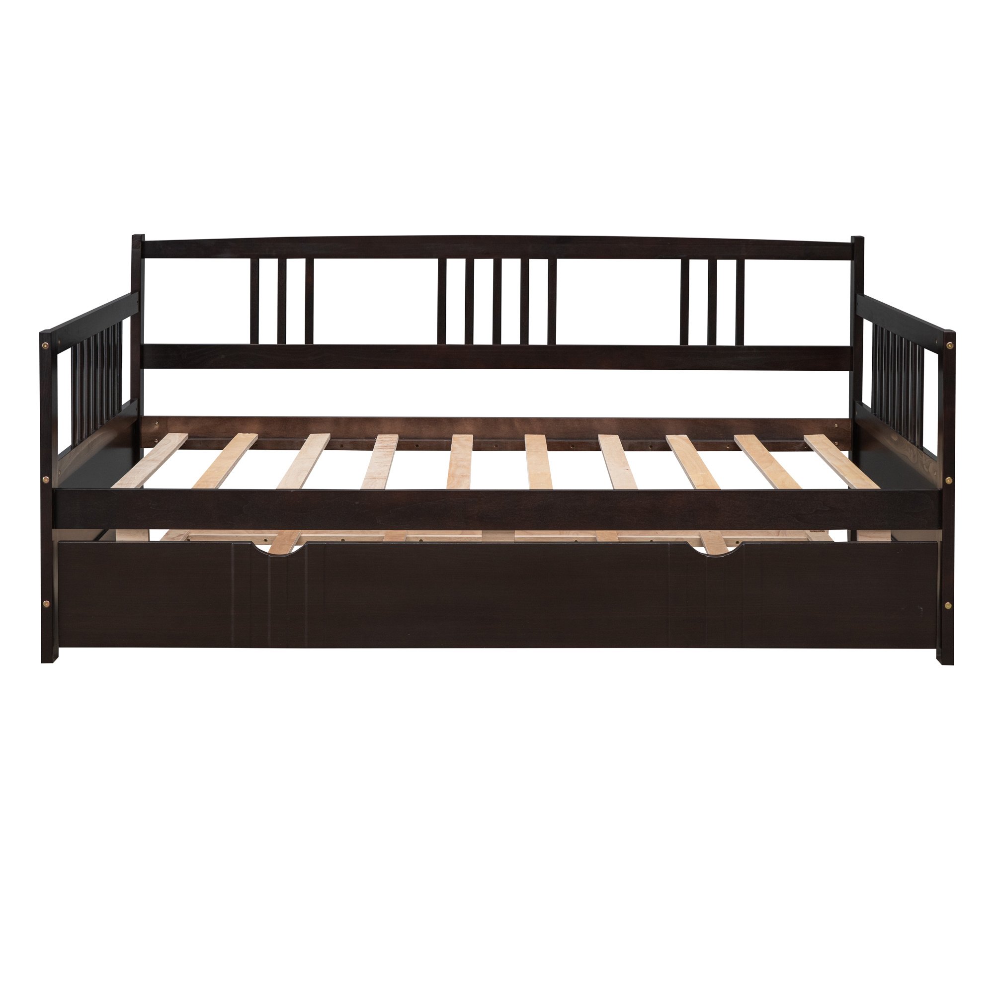 Are you finding a bed or sofa to sleep or have rest in leisure time? Our dual-use daybed frame can be used as sofa or bed. It is a good choice for you. Most of the frame is made of premium pine wood which ensures sturdiness and durability. And the accessories come with the daybed frame are sturdy and antirust so that the bed won't make any noise and shake after you use it for many years. This twin daybed comes with a trundle ; easy to pull in and out; multi-functional piece of furniture ideal for small living spaces. And the appearance of our bed is concise and modern which can suit for any style of decoration.