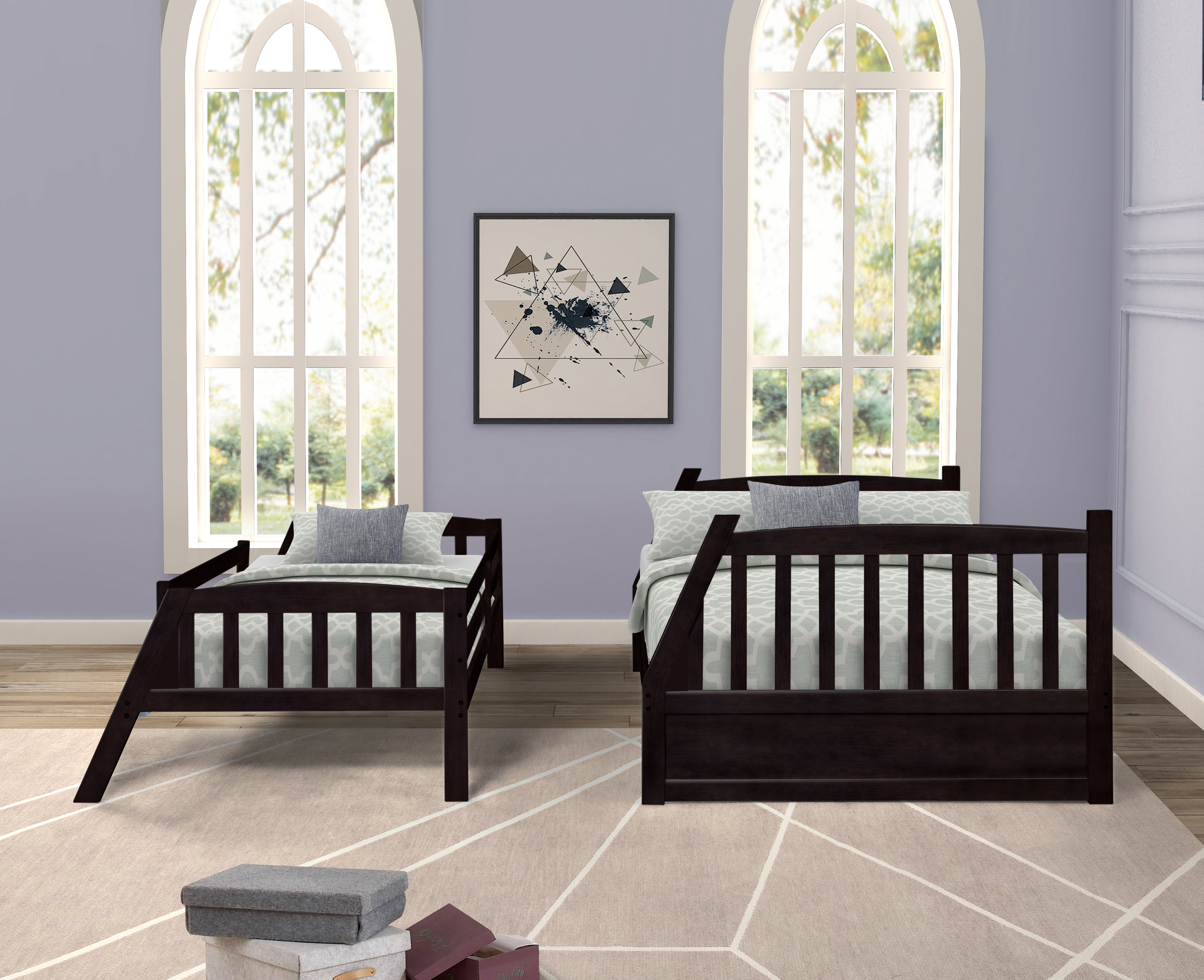 3.Accommodates one twin-size mattress and one full-size (Bedding and mattresses are not included).