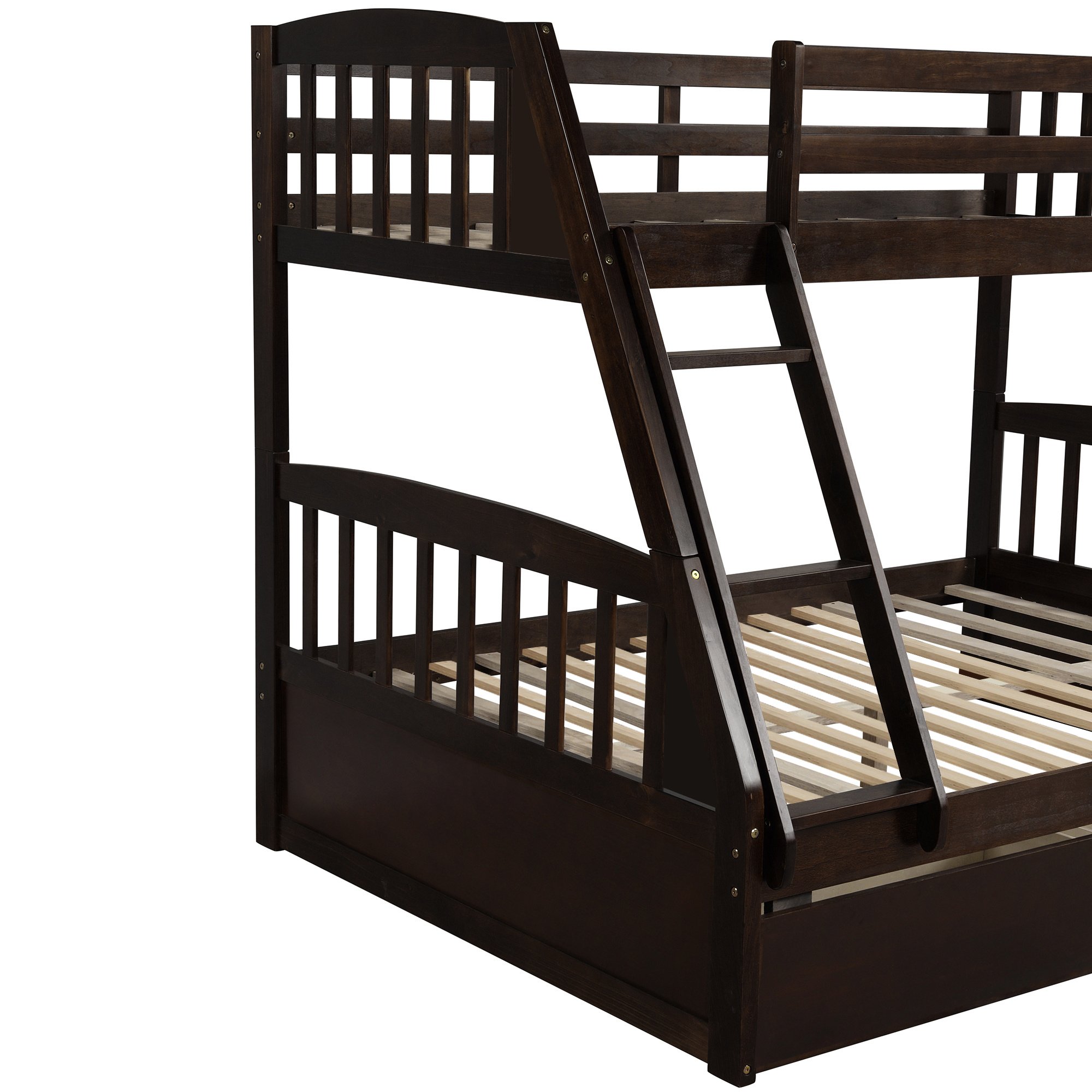 2.Comes with guard rails on the top bunk for protection and two drawers on the bottom for storage.