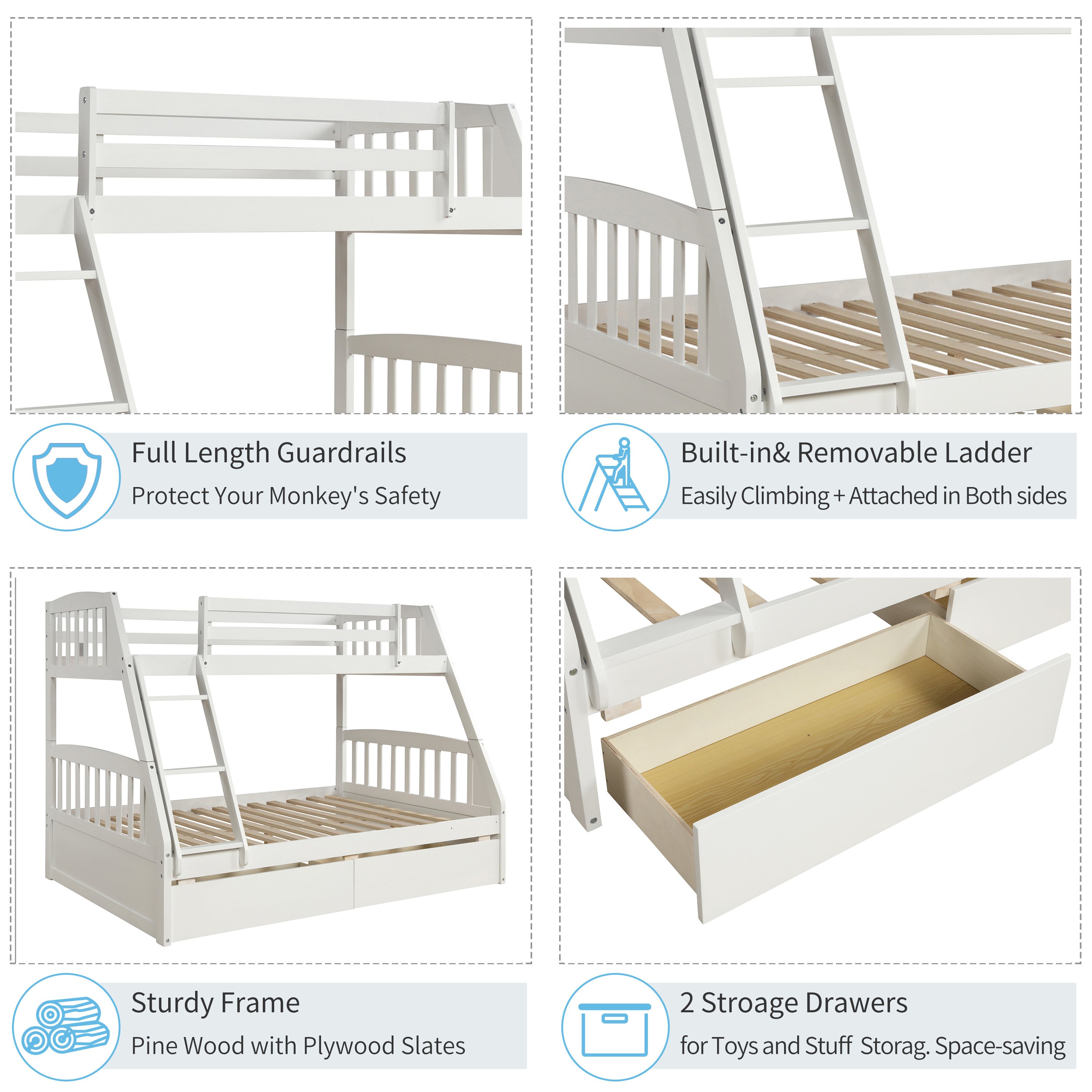 2.Comes with guard rails on the top bunk for protection and two drawers on the bottom for storage.
