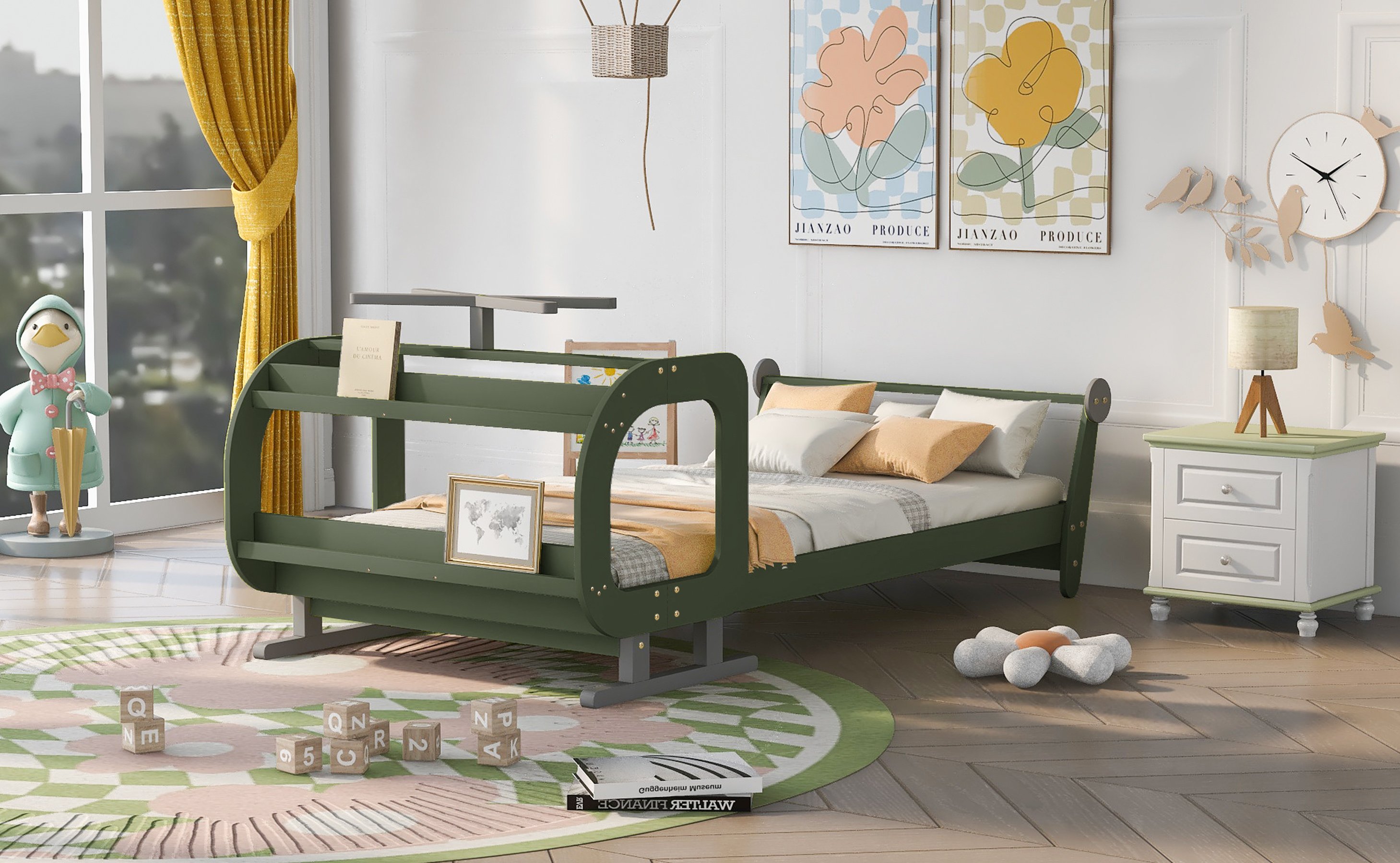 1.[Plane Shape] The plane-shaped platform bed is unique and the bold contrast of green and silver is even more eye-catching.