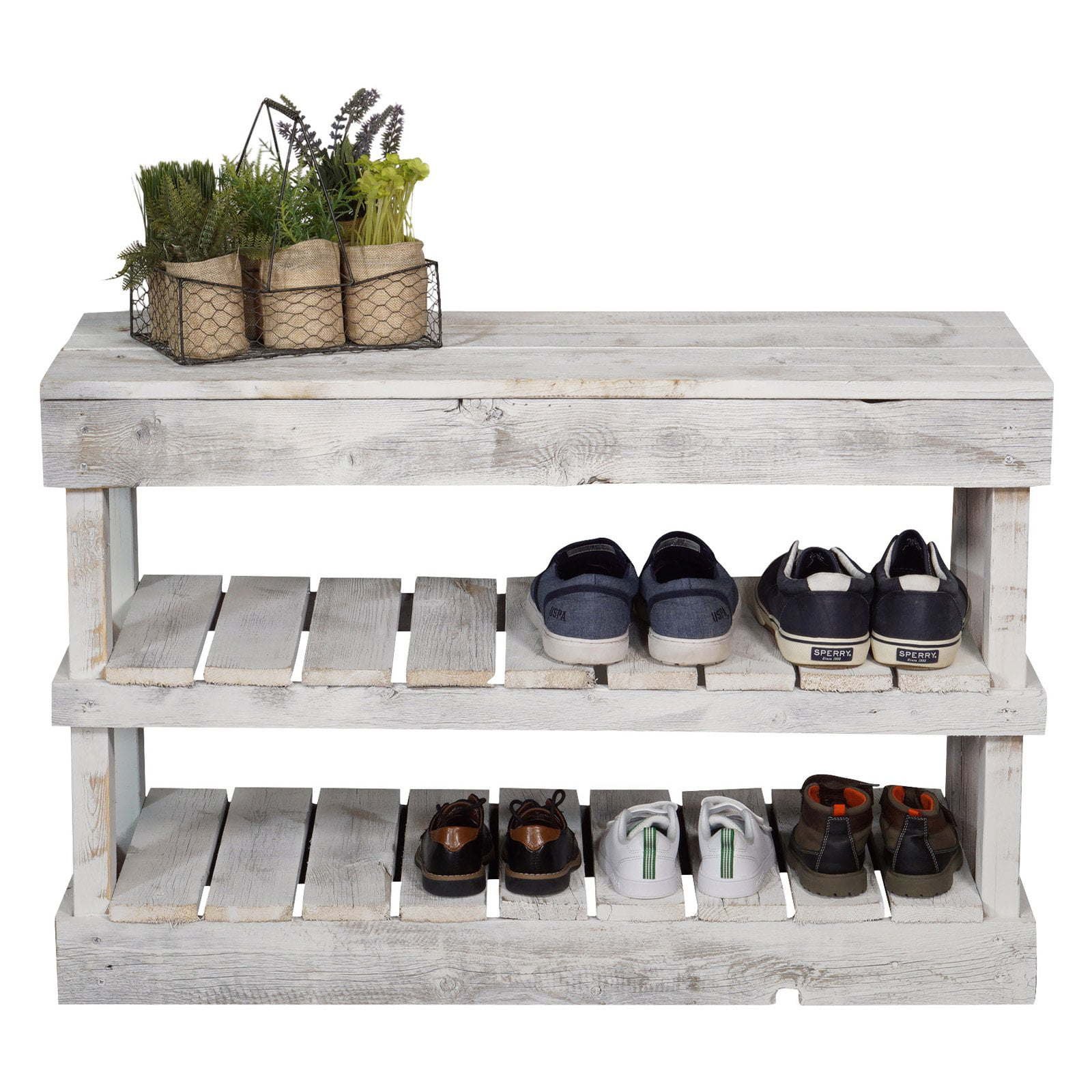 The Woven Paths Rustic Wood Shoe Bench helps you keep shoes neatly organized with two lower shelves and sturdy solid wood construction. This charming shoe rack also serves as a handy bench for a hallway, and it comes in your choice of available finish to help you create the perfect farmhouse look in your home. Add a rustic touch to your space with the Woven Paths Rustic Wood Shoe Bench. The Woven Paths collection blends rustic farmhouse style with bohemian accents perfect for any season. This collection makes it easy and affordable to brighten up any room with cozy, vibrant, quality pieces.Convenient bench top perfect for putting on and taking off shoesStore up to 8 pairs of shoes on the lower shelf tiersSturdy Solid Wood Construction Adds Rustic Contemporary Style and WarmthFully assembled and ready to enjoy right out of the box!