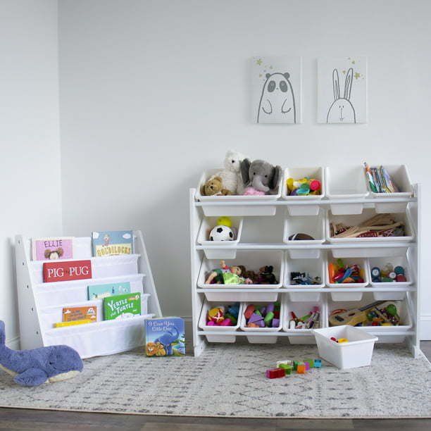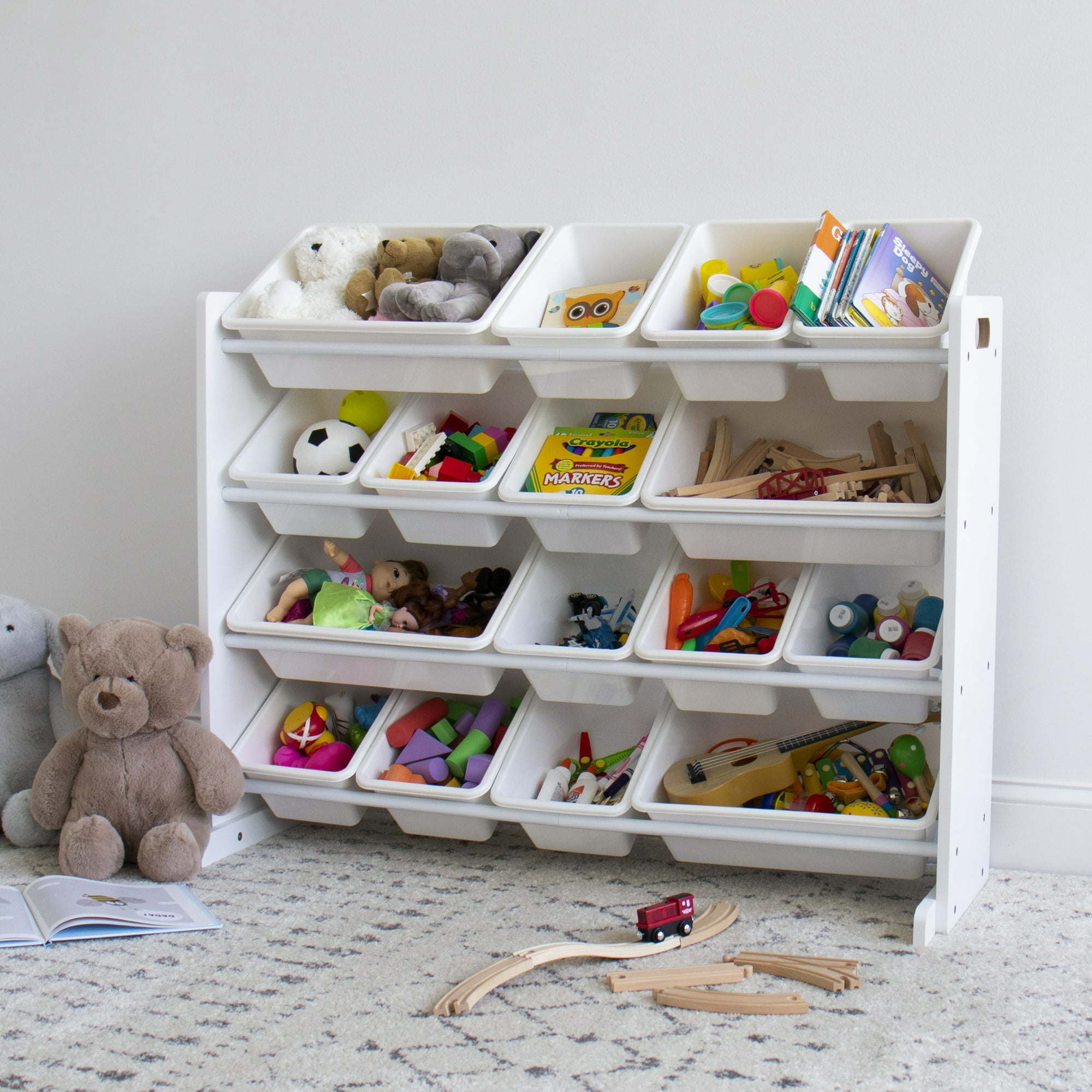 Playtime becomes more fun when your kids can easily take out their toys, books and games and then quickly clean up afterwards. The space-saving Tot Tutors Super Sized Toy Storage Organizer with 16 Storage Bins stows your children's toys in easy-to-see, easy-to-access BPA and phthalate free plastic storage bins. Ideal for organizing your child's nursery/bedroom, playroom, closet, living room. The options are endless. The 12 standard and 4 large colorful storage containers are easy to remove, replace and reposition along the 4 tiered organizer shelves. Storage bins are sized just right within the toy organizer for toddler and preschool aged children. Sturdy engineered wood construction frame with stabilizing braces and steel shelving rods, 20 pound weight capacity per level. Some assembly is required. A great toy storage box alternative; helping keep your little one's room clean and organized while at the same time teaching color identification, sorting and cognitive skills. Product sizing: 42"W x 11"D (15.5"D with stabilizing braces) x 32" H Standard bin sizing: 11.75" L x 8.25"W x 5.25" H Large bin sizing: 16"L x 11.75"W x 5.25"H Additional plastic storage toy bins are sold separately.