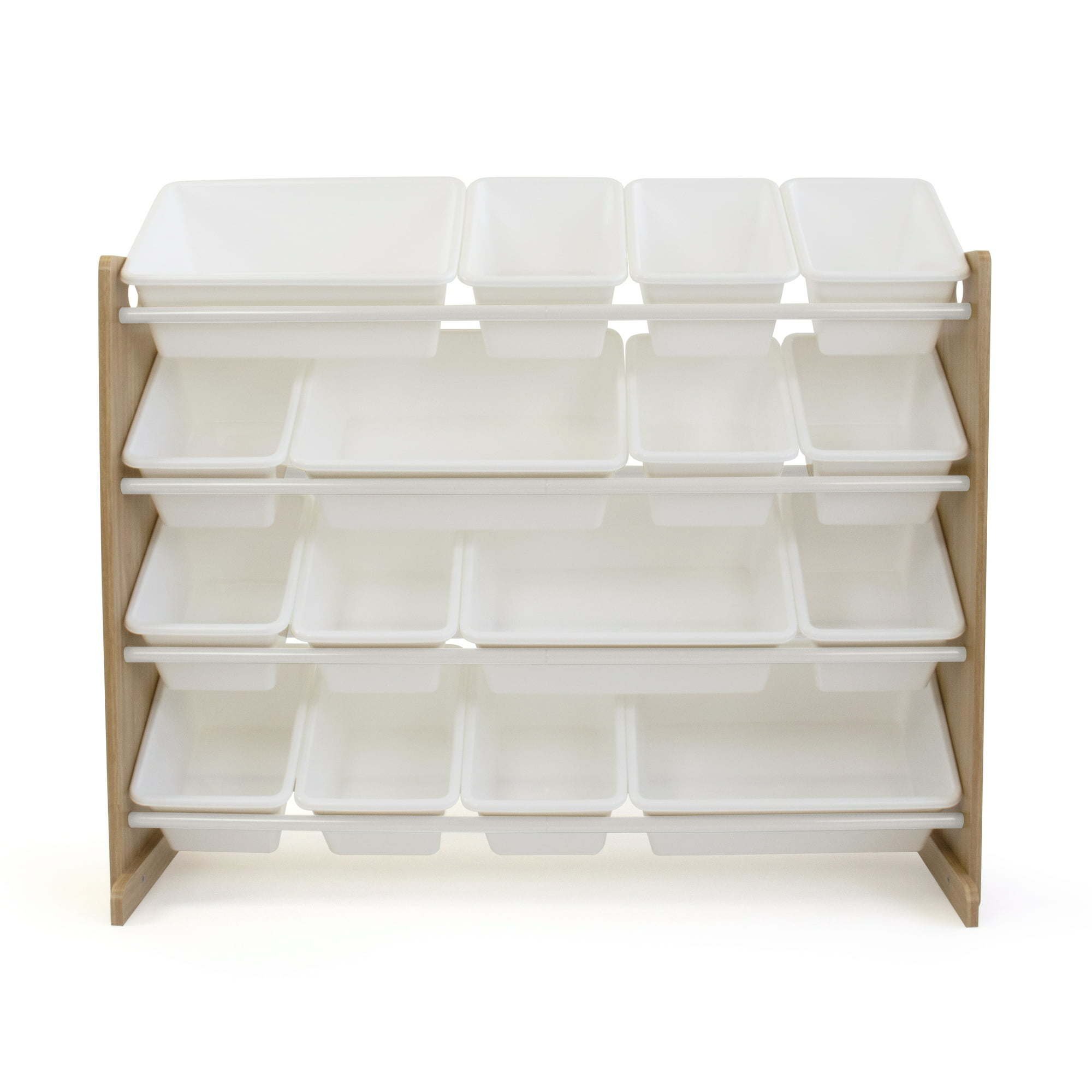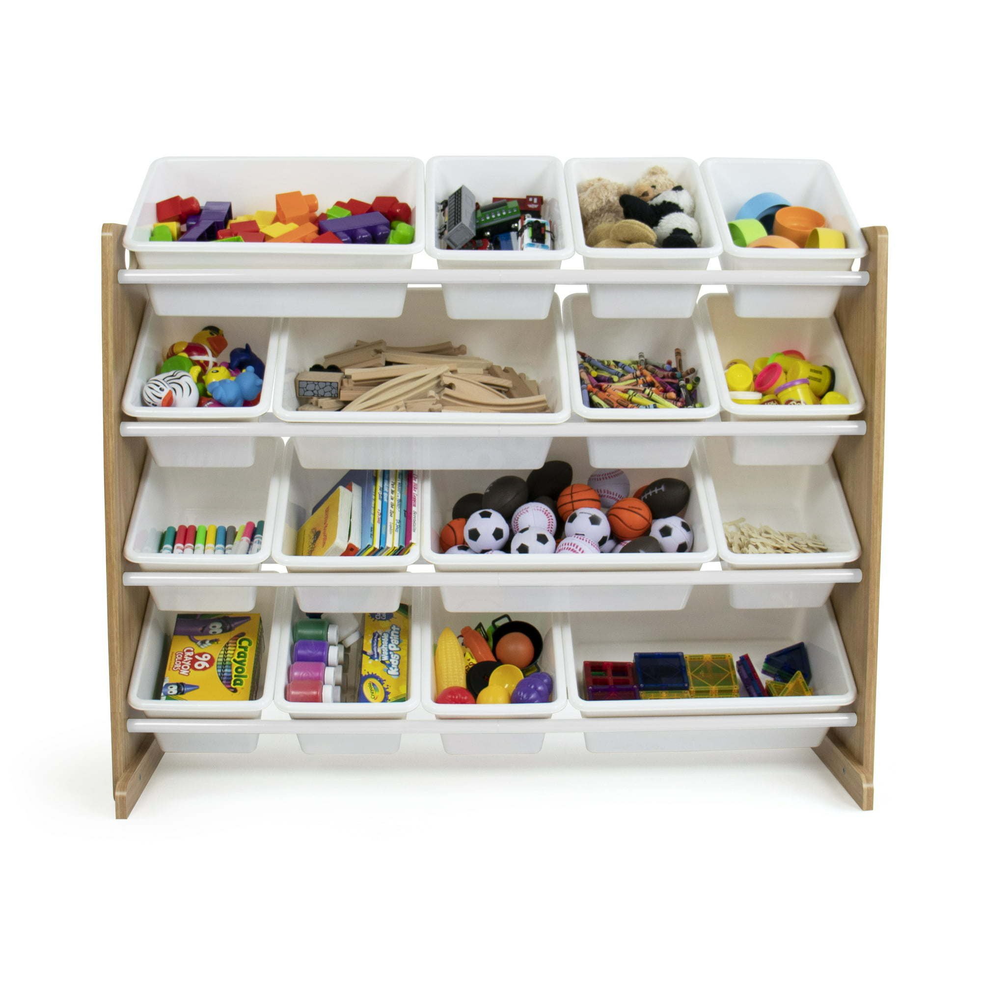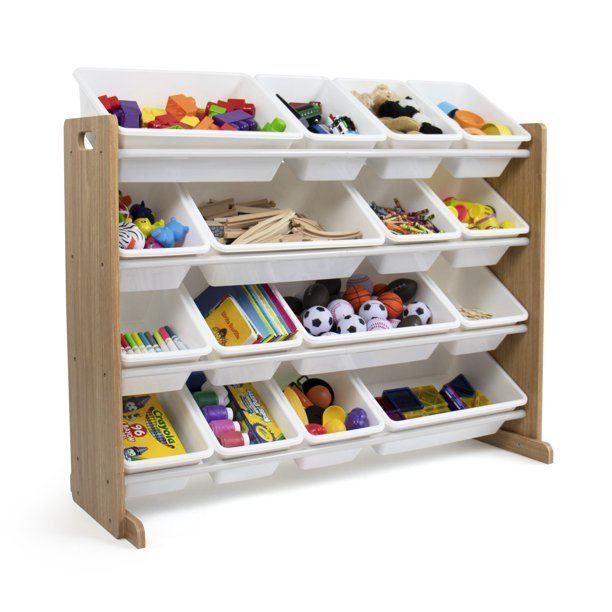 Playtime becomes more fun when your kids can easily take out their toys, books and games and then quickly clean up afterwards. The space-saving Tot Tutors Super Sized Toy Storage Organizer with 16 Storage Bins stows your children's toys in easy-to-see, easy-to-access BPA and phthalate free plastic storage bins. Ideal for organizing your child's nursery/bedroom, playroom, closet, living room. The options are endless. The 12 standard and 4 large colorful storage containers are easy to remove, replace and reposition along the 4 tiered organizer shelves. Storage bins are sized just right within the toy organizer for toddler and preschool aged children. Sturdy engineered wood construction frame with stabilizing braces and steel shelving rods, 20 pound weight capacity per level. Some assembly is required. A great toy storage box alternative; helping keep your little one's room clean and organized while at the same time teaching color identification, sorting and cognitive skills. Product sizing: 42"W x 11"D (15.5"D with stabilizing braces) x 32" H Standard bin sizing: 11.75" L x 8.25"W x 5.25" H Large bin sizing: 16"L x 11.75"W x 5.25"H Additional plastic storage toy bins are sold separately.