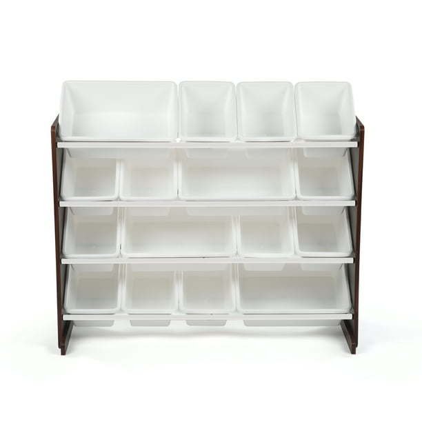 Playtime becomes more fun when your kids can easily take out their toys, books and games and then quickly clean up afterwards. The space-saving Tot Tutors Super Sized Toy Storage Organizer with 16 Storage Bins stows your children's toys in easy-to-see, easy-to-access BPA and phthalate free plastic storage bins. Ideal for organizing your child's nursery/bedroom, playroom, closet, living room. The options are endless. The 12 standard and 4 large colorful storage containers are easy to remove, replace and reposition along the 4 tiered organizer shelves. Storage bins are sized just right within the toy organizer for toddler and preschool aged children. Sturdy engineered wood construction frame with stabilizing braces and steel shelving rods, 20 pound weight capacity per level. Some assembly is required. A great toy storage box alternative; helping keep your little one's room clean and organized while at the same time teaching color identification, sorting and cognitive skills. Product sizing: 42"W x 11"D (15.5"D with stabilizing braces) x 32" H Standard bin sizing: 11.75" L x 8.25"W x 5.25" H Large bin sizing: 16"L x 11.75"W x 5.25"H Additional plastic storage toy bins are sold separately.