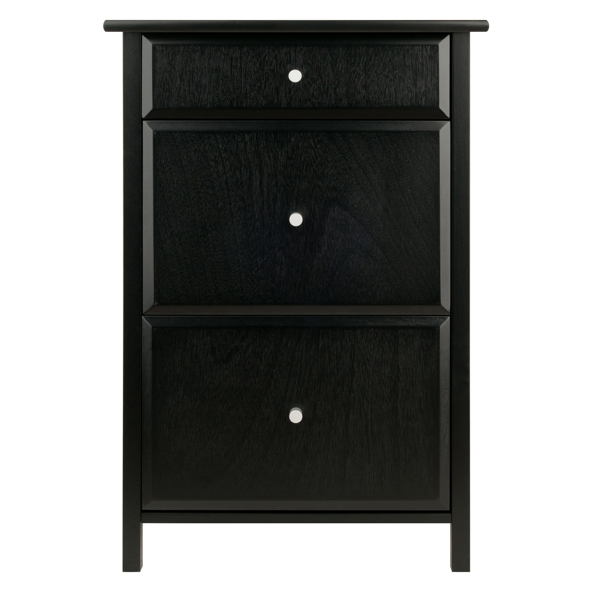 The Delta File Cabinet is a practical and handsome solution for storing your important files and paperwork. Finished in Black; it will enhance any professional or home office space. Two lower drawers offer ample room for both legal and letter-sized files; and the top drawer is perfect for smaller items; such as pens; pads; envelopes; and more. It can also be used without the file rods as a storage cabinet to keep office supplies within easy reach. Overall dimensions are 30.7"H x 20.8"W x 20.2"D.