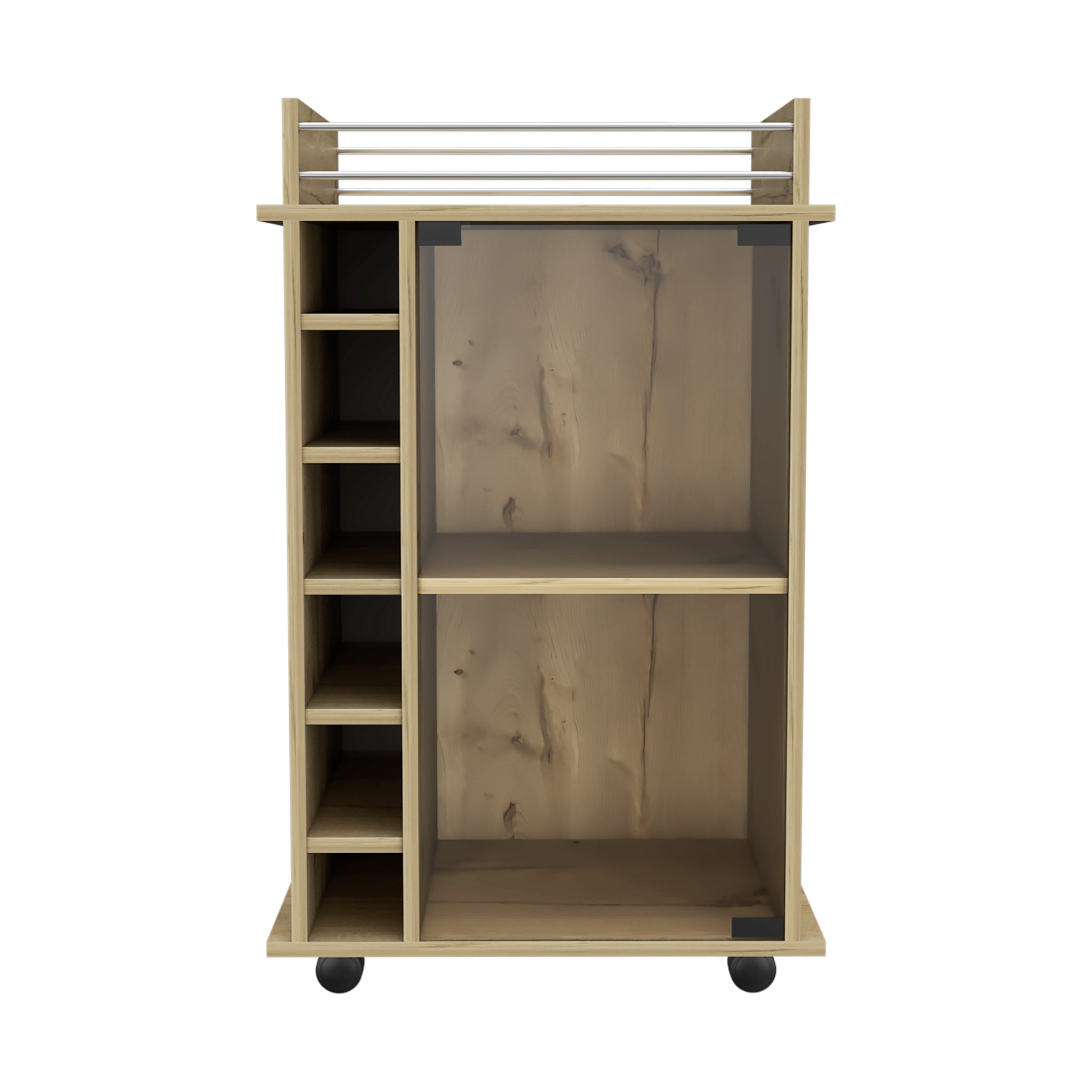 The Savannah Bart Car is the best way to receive your guests; this beautiful Bart Car is designed to facilitate your work; that is why it has been designed with four wheels that allow efficient mobility throughout the home without the need for efforts. A glass door cabinet with two interior shelves will provide plenty of space to store your liquor bottles; glasses; or items that you need to entertain your guest. On the side; a six-bottle cubbies rack will give you provide you the space you need to keep the wine bottles handy. A spacious top with a rail will give you the space you need to prepare drinks for your guest and have a great time. Four wheels with locking mechanisms will allow you to take the party anywhere in your house.Set includes: One (1) bar cartDimensions: 35 inches high x 21.6 inches wide x 16.3 inches deepFinish Color: Light OakMaterials: Manufactured woodNumber of shelves: 3-ShelfNumber of doors: 1-DoorWine cabinet capacity: 6-BottleGlass door cabinet with two interior shelves (Each shelf: 13.5" H x 14.1" W) Six cubbies: The middle four: 4.3" H x 3.5" W and the upper and lower cubbies: 3.3" H x 3.5" W Lockable wheels (x4): 2.1" HTop surface with metal rails (3.9" H x 18.5" W)