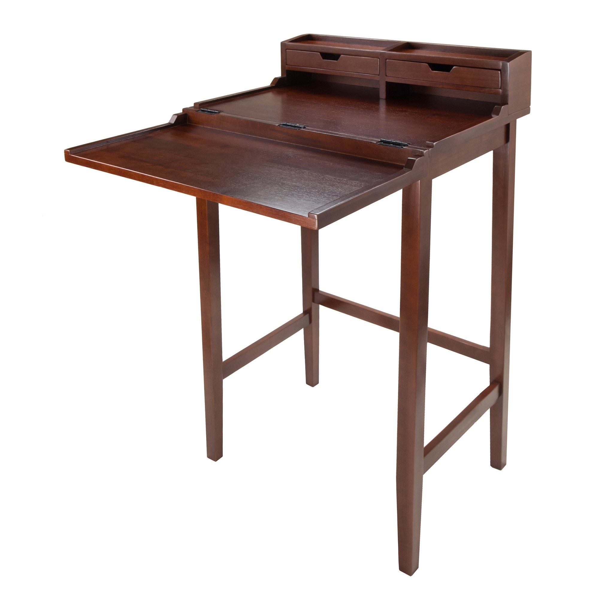 Ergonomic High Standing Desk with Solid wood construction; multiple storage bins and slots; flip-open storage space and extended desk top. Its high desk's elbow height serves abundant functions as Podium; Reception Desk; Work-Station; Laptop Stand or Drafting Table. Ideal for working while standing especially for people with back pain. Flip out top creates a larger working surface of 27.95"W x 34.49"D. Table Top height stands at 45.91 inches. Dimension of compartment on top of hutch is 12.80"W x 3.70"D for each section. Open compartment has are of 12.80"W x 4.88"D x 1.97"H. Fully assembled size is 27.95'W x 19.92"D x 45.91"H. Warm Walnut Finish. Assembly Required.Flip out top creates a larger working surface of 27.95"W x 34.49"D. Table Top height is 45.91".Top of hutch section 12.80"W x 3.70"D; Open compartment 12.80"W x 4.88"D x 1.97"H. Walnut Finish.Fully assembled size is 27.95'W x 19.92"D x 45.91"H. Solid/Composite wood. Assembly Required.nullnullnull This product meets the oversized requirement per UPS/FedEx. The shipping weight reflected is the dimensional weight. This product also meets the large package requirement per UPS/FedEx. The estimated shipping cost will include this fee. Large package is $70.00; applied when length plus girth [(2 x width) + (2 x height)] combined exceeds 130 inches. Additional Handling charge of $10.50 applied where a package's longest side exceeds 48 inches in length; the second longest side exceeds 30 inches in length; or total weight is greater than 70 lbs.This product meets the oversized requirement per UPS/FedEx. The shipping weight reflected is the dimensional weight. This product also meets the large package requirement per UPS/FedEx. The estimated shipping cost will include this fee. Large package is $70.00; applied when length plus girth [(2 x width) + (2 x height)] combined exceeds 130 inches. Additional Handling charge of $10.50 applied where a package's longest side exceeds 48 inches in length; the second longest side exceeds 30 inches in length; or total weight is greater than 70 lbs.