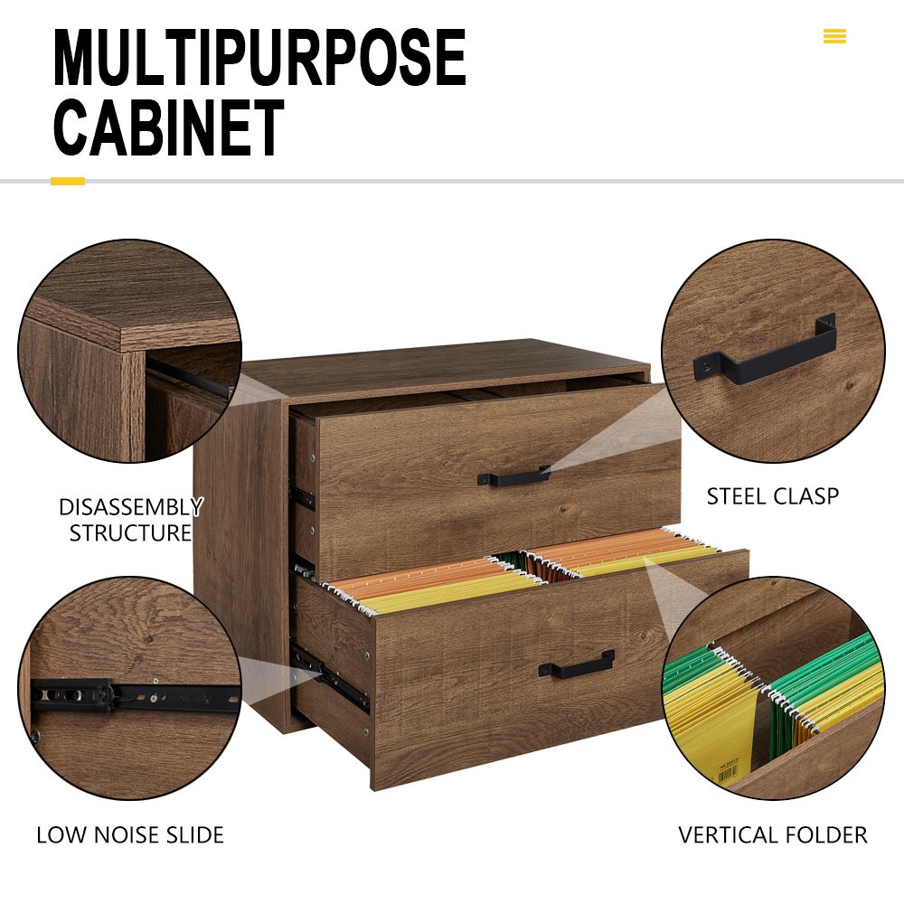 Lateral Wooden Filing Cabinet with 2 Drawer Suit for letter sizeMDF Board/Legal-size File/Letter-Size File/Smooth Drawer RunnersColor BrownSize(inch) Product Dimension 30.3*15.75*24"Packaging Size 33.66*17.52*8.27"Weight(Ibs) Gross Weight 61.82Net Weight 58.82Material Type Frame MDFInterior MDFHandle SteelFunction Lock secure NOHanging File Bars 2 Bars for each drawerFile Size Accommodated Legal; Letter;A4Adjustable leg levelers NOAssembly Assembly required YESUsing Area Home; office and all the places you needWarranty 1 yearØ This file cabinet made by melamine board with 2 files Drawer ; suit for letter size ; legal size ; A4 and F4 size hanging files.Ø Each drawer has rectangular drawbars and the rectangular tabletop is a great place to showcase photos; plants or your favorite accent pieces.Ø This file cabinet is perfect for home offices; lofts or creative spaces and can be matched to the height of your desk to extend your work surface.Ø Full-extension file drawers open on smooth ball-bearing slides for easy access to contents in the back. Store your letters and legal-sized files in the drawer.