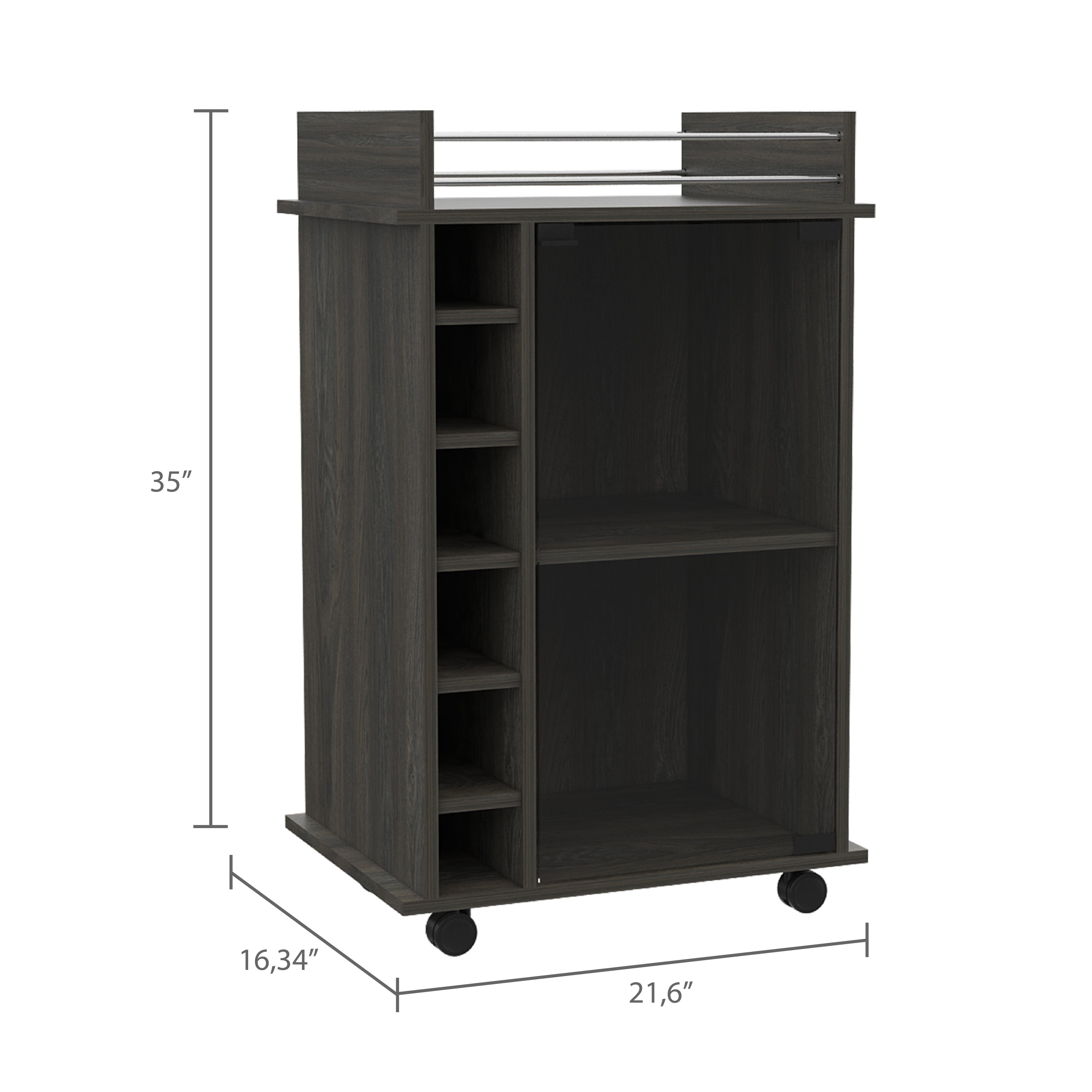 The Savannah Bart Car is the best way to receive your guests; this beautiful Bart Car is designed to facilitate your work; that is why it has been designed with four wheels that allow efficient mobility throughout the home without the need for efforts. A glass door cabinet with two interior shelves will provide plenty of space to store your liquor bottles; glasses; or items that you need to entertain your guest. On the side; a six-bottle cubbies rack will give you provide you the space you need to keep the wine bottles handy. A spacious top with a rail will give you the space you need to prepare drinks for your guest and have a great time. Four wheels with locking mechanisms will allow you to take the party anywhere in your house.Set includes: One (1) bar cartDimensions: 35 inches high x 21.6 inches wide x 16.3 inches deepFinish Color: Carbon EspressoMaterials: Manufactured woodNumber of shelves: 3-ShelfNumber of doors: 1-DoorWine cabinet capacity: 6-BottleGlass door cabinet with two interior shelves (Each shelf: 13.5" H x 14.1" W) Six cubbies: The middle four: 4.3" H x 3.5" W and the upper and lower cubbies: 3.3" H x 3.5" W Lockable wheels (x4): 2.1" HTop surface with metal rails (3.9" H x 18.5" W)