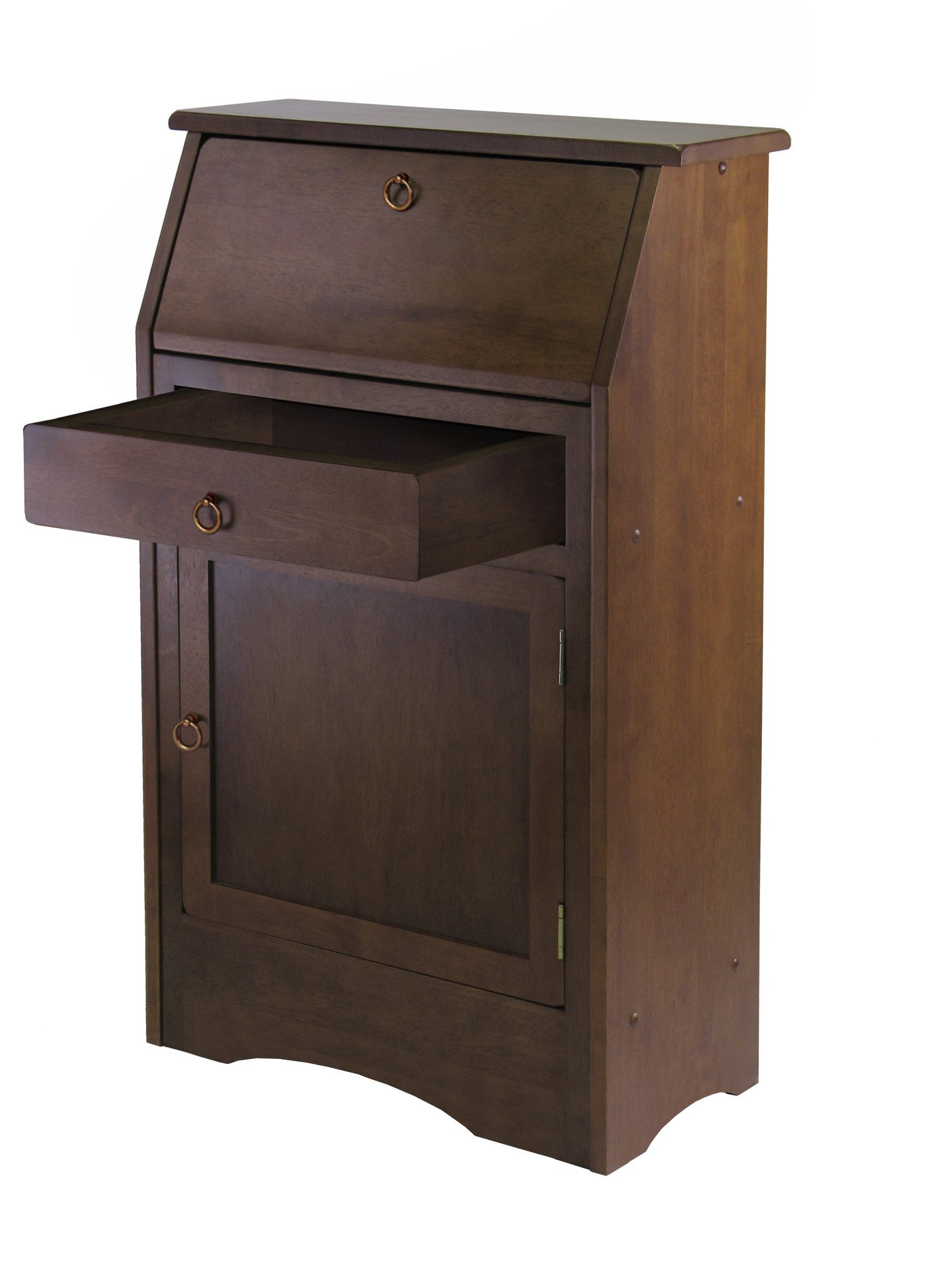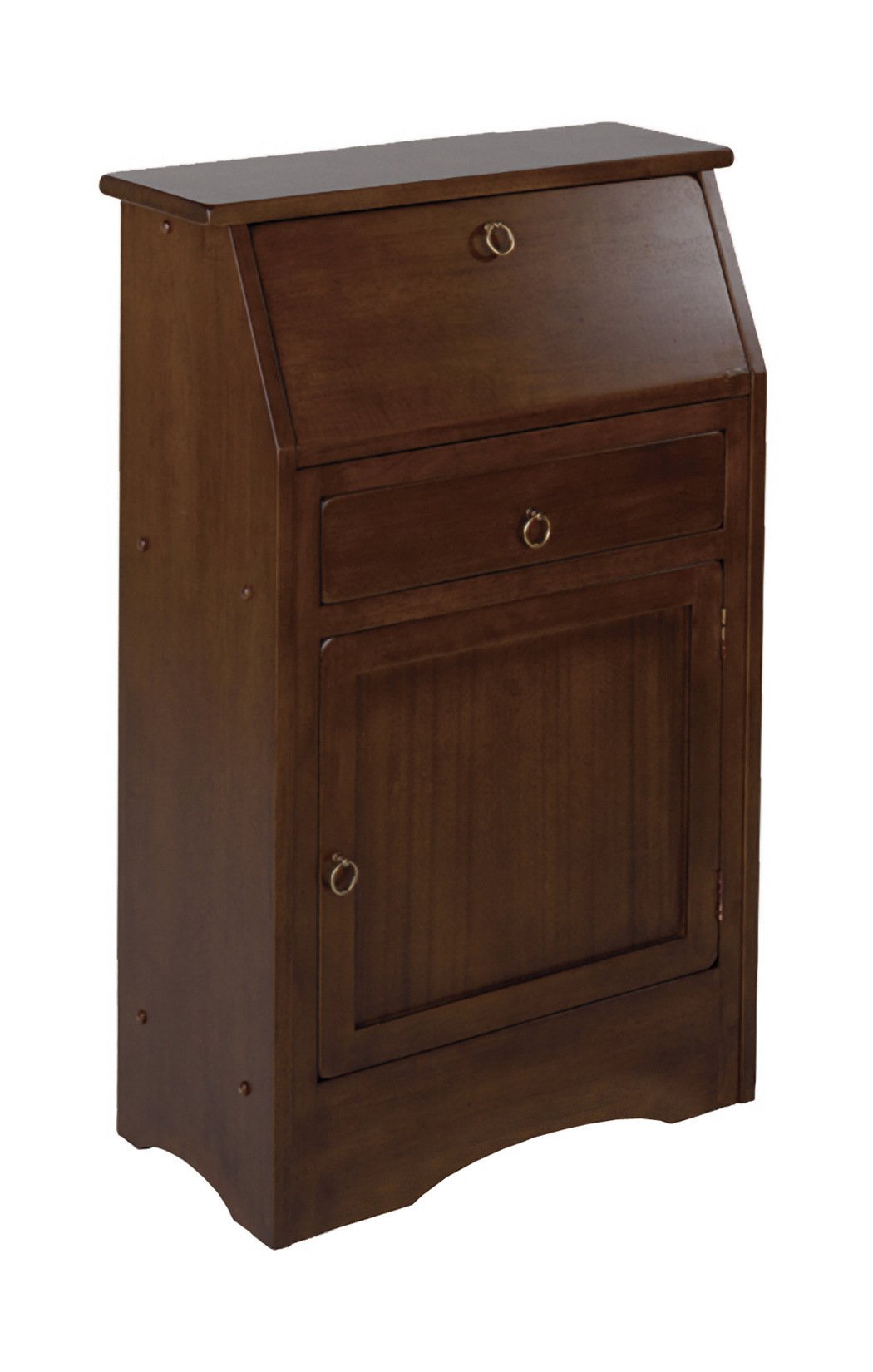 An elegant traditional design to a multifunctional secretary desk that can fit almost any room in the house. The cabinet door opens to two inner shelves and the fold down table makes a great writing surface and also hides papers and supplies once it's folded up. The overall size is 38.5"H x 25.1"W x 11.9"D. The top dimension is 25.1"W x 7.9"D. The slanted cubby's shelves are 3.5"H x 21.6"W x 6.1"D for the top and 3.4"H x 21.6"W x 10"D for the bottom. The shelf can be removed to allow for a 7.7"H x 21.6"W x 10"D at the bottom and 6.1"D at the top open space. Drawer below the flip down door is 18"W x 8.3"D x 3.7"H. Bottom cabinet has a removable shelf with each section measuring 21.6"W x 10.2"D x 8.25"H. If the shelf is removed; the opening is 21.6"W x 10.2"D x 17.3"H. Made from solid and composite wood in a walnut finish. Assembly required.The overall size is 38.5"H x 25.1"W x 11.9"D. The top dimension is 25.1"W x 7.9"D. The slanted cubby's shelves are 3.5"H x 21.6"W x 6.1"D for the top and 3.4"H x 21.6"W x 10"D for the bottom.Bottom cabinet has a removable shelf with each section measuring 21.6"W x 10.2"D x 8.25"H. If the shelf is removed; the opening is 21.6"W x 10.2"D x 17.3"Hnullnullnull This product meets the oversized requirement per UPS/FedEx. The shipping weight reflected is the dimensional weight. This product also meets the large package requirement per UPS/FedEx. The estimated shipping cost will include this fee. Large package is $70.00; applied when length plus girth [(2 x width) + (2 x height)] combined exceeds 130 inches. Additional Handling charge of $10.50 applied where a package's longest side exceeds 48 inches in length; the second longest side exceeds 30 inches in length; or total weight is greater than 70 lbs.This product meets the oversized requirement per UPS/FedEx. The shipping weight reflected is the dimensional weight. This product also meets the large package requirement per UPS/FedEx. The estimated shipping cost will include this fee. Large package is $70.00; applied when length plus girth [(2 x width) + (2 x height)] combined exceeds 130 inches. Additional Handling charge of $10.50 applied where a package's longest side exceeds 48 inches in length; the second longest side exceeds 30 inches in length; or total weight is greater than 70 lbs.