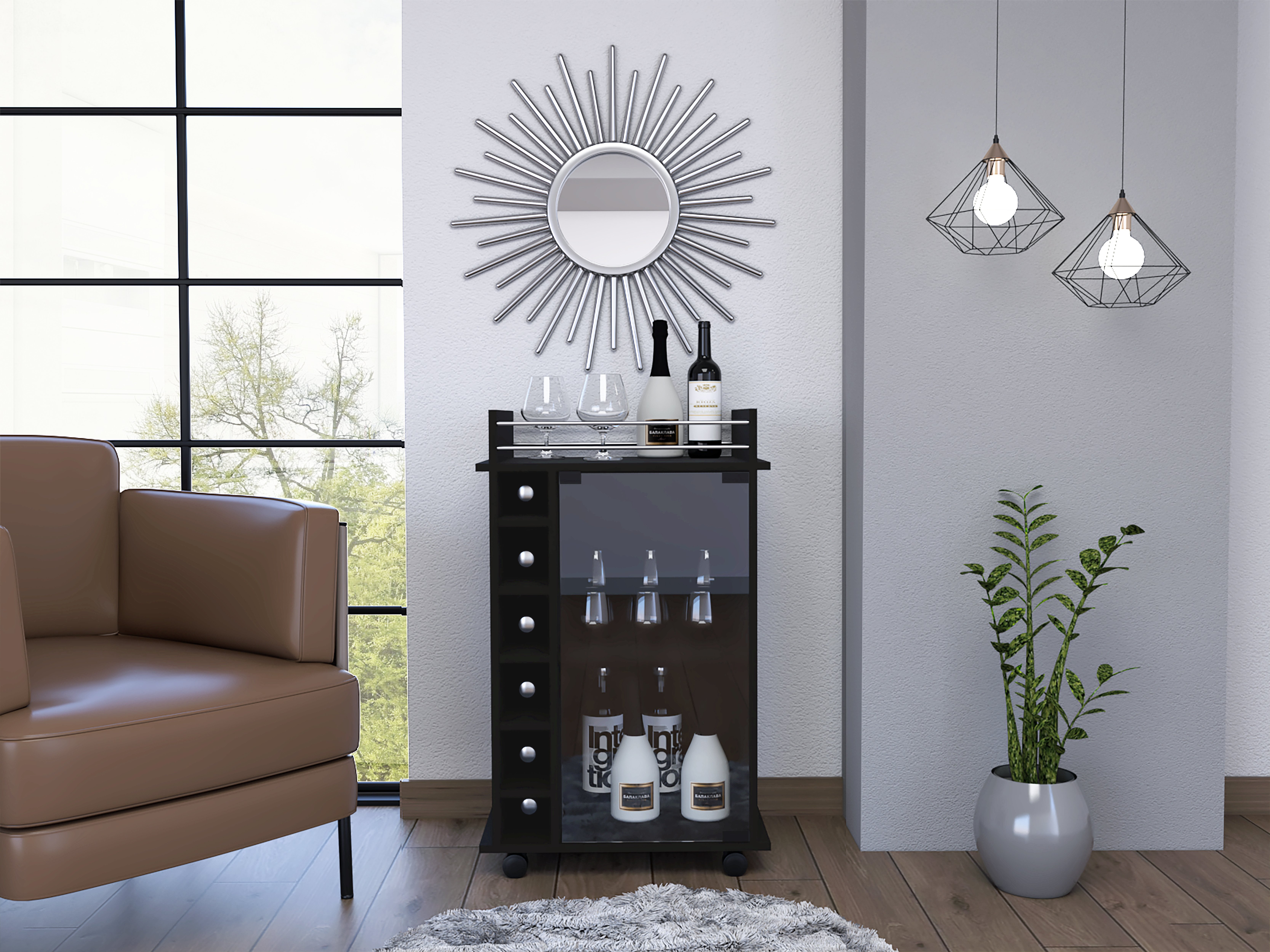 The Savannah Bart Car is the best way to receive your guests; this beautiful Bart Car is designed to facilitate your work; that is why it has been designed with four wheels that allow efficient mobility throughout the home without the need for efforts. A glass door cabinet with two interior shelves will provide plenty of space to store your liquor bottles; glasses; or items that you need to entertain your guest. On the side; a six-bottle cubbies rack will give you provide you the space you need to keep the wine bottles handy. A spacious top with a rail will give you the space you need to prepare drinks for your guest and have a great time. Four wheels with locking mechanisms will allow you to take the party anywhere in your house.Set includes: One (1) bar cartDimensions: 35 inches high x 21.6 inches wide x 16.3 inches deepFinish Color: Black WengueMaterials: Manufactured woodNumber of shelves: 3-ShelfNumber of doors: 1-DoorWine cabinet capacity: 6-BottleGlass door cabinet with two interior shelves (Each shelf: 13.5" H x 14.1" W) Six cubbies: The middle four: 4.3" H x 3.5" W and the upper and lower cubbies: 3.3" H x 3.5" W Lockable wheels (x4): 2.1" HTop surface with metal rails (3.9" H x 18.5" W)