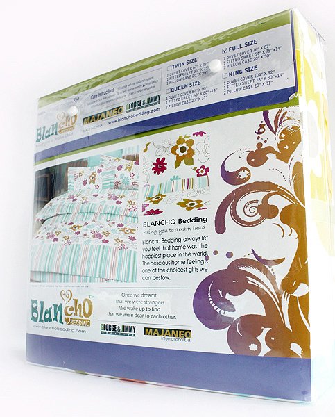 Five-piece set for Twin size (consisting of a pillow sham, a fitted sheet, a duvet cover, a comforter & a pillow);Seven-piece set for Full,Queen and King Size (consisting of two pillow shams, a fitted sheet, a duvet cover, a comforter and two pillows);Twin (Fitted sheet: 39 x 75 inches; Duvet cover and Comforter: 67 x 87 inches; Pillow sham and Pillow: 20 x 30 inches); Full (Fitted sheet: 54 x 75 inches ; Duvet cover and Comforter: 76 x 87 inches; Pillow sham and Pillow: 20 x 30 inches);Queen (Fitted sheet: 60 x 80 inches; Duvet cover and Comforter: 87 x 90 inches; Pillow sham and Pillow: 20 x 31 inches); King (Fitted sheet: 78 x 80 inches; Duvet cover and Comforter: 104 x 92 inches; Pillow sham and Pillow: 20 x 31 inches);*Blancho Bedding products are all made of high quality certified fibers, highest quality construction, chemical and fire retardant free. Allergy-free nontoxic natural bedrooms is our specialty.*The concealed elastic band in the fitted sheet will firmly wrap the overall corners of the mattress, thus avoiding displacement. The design of extending the pocket size of the fitted sheet to 14 inches will fit with the most of mattresses.*We recommend duvet covers because they can be washed much more often than can your quilted comforter. Too-frequent washing (even dry cleaning) can compromise your comforter's down fill. However, a cotton duvet cover can be laundered along with the sheets and pillowcases. This keeps the down comforter fresh as well. If you have ever priced dry cleaning for a fine comforter, you understand why cleaning it less often is a huge advantage!*Another advantage of cotton duvet covers is that they are changeable, so you can change the look and feel of your bedroom without having to completely redecorate. Browse our colorful duvet cover sets and bring excitement to your bedroom. King size contains two pillow shams, a fitted sheet, a duvet cover, a comforter and two pillow.King size comforter measures 104 by 92 inches with 66 oz hypo-allergenic breathable filling.This combo combines a duvet cover set, a down-alternative comforter and two pillows(one for Twin).Shrinkproof, anti-pilling and fading proof processes; 14 inches pocket size of the fitted sheet.Environment-friendly dyes; Fine and concentrated stitches; Machine washable and dryable.