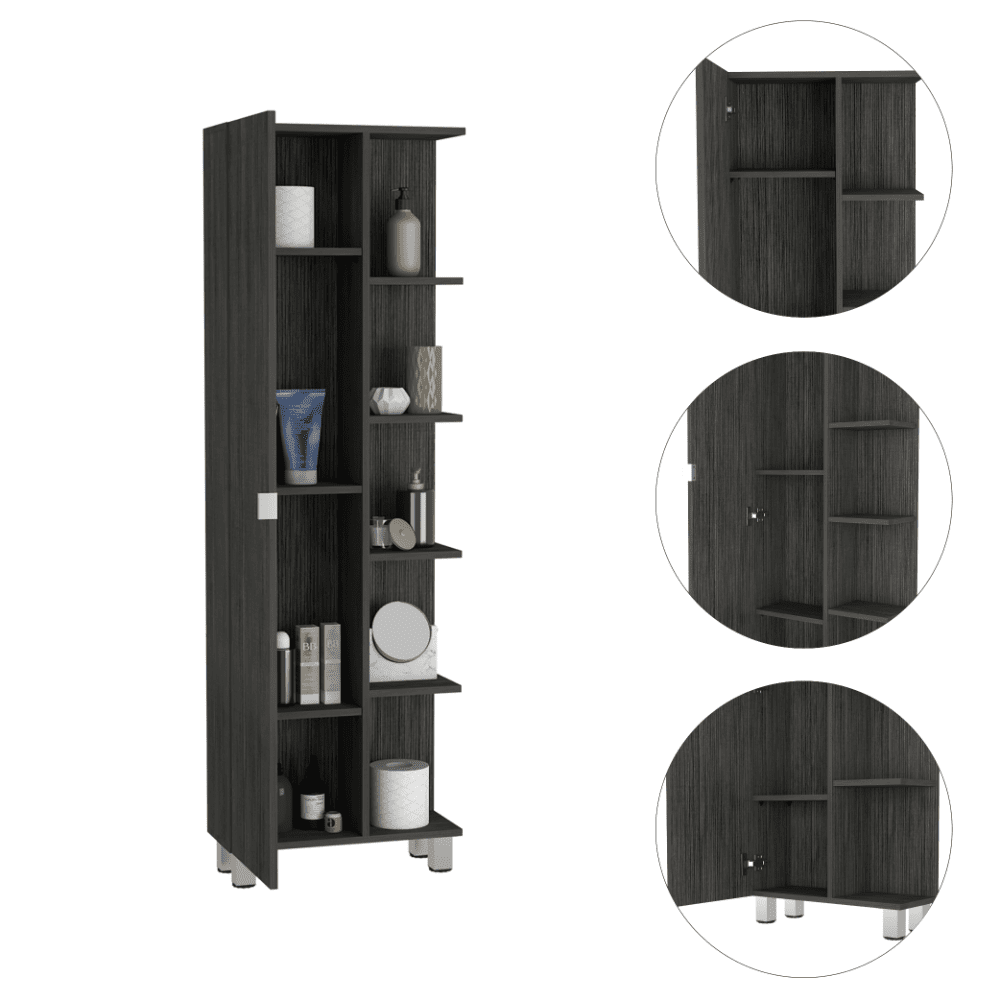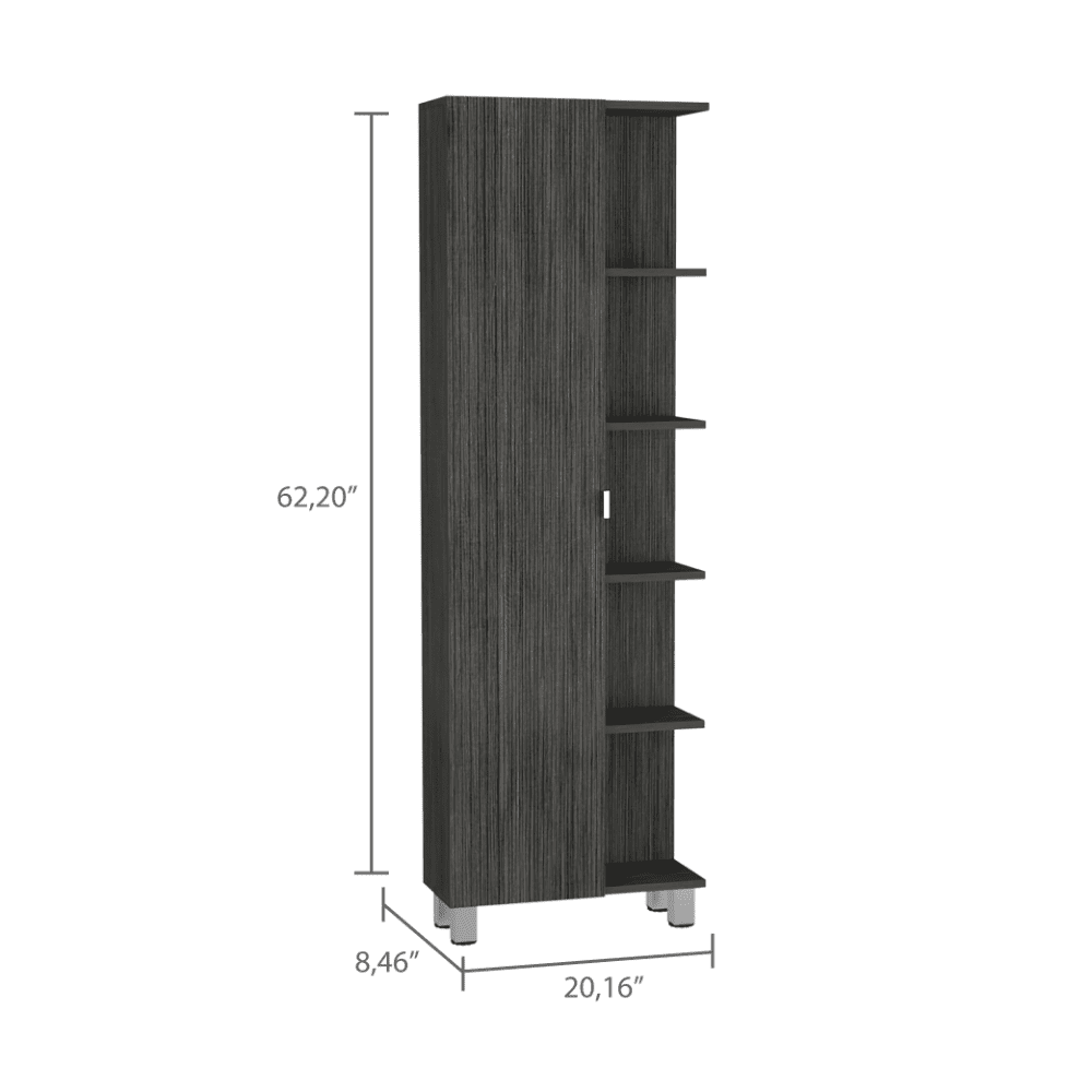Part of the exclusive Urano collection; this cabinet updates the look of any space with modern styling and a unique smoky oak manufactured wood finish. Five shallow shelves and a large covered cabinet give you plenty of storage options ideal for your bathroom; kitchen; bedroom; or garage. Easy and ready to assemble furniture with full warranty and CARB certification.With four stylish legs and ergonomic size (8; 58''D X 20; 15''W X 62; 2''H)