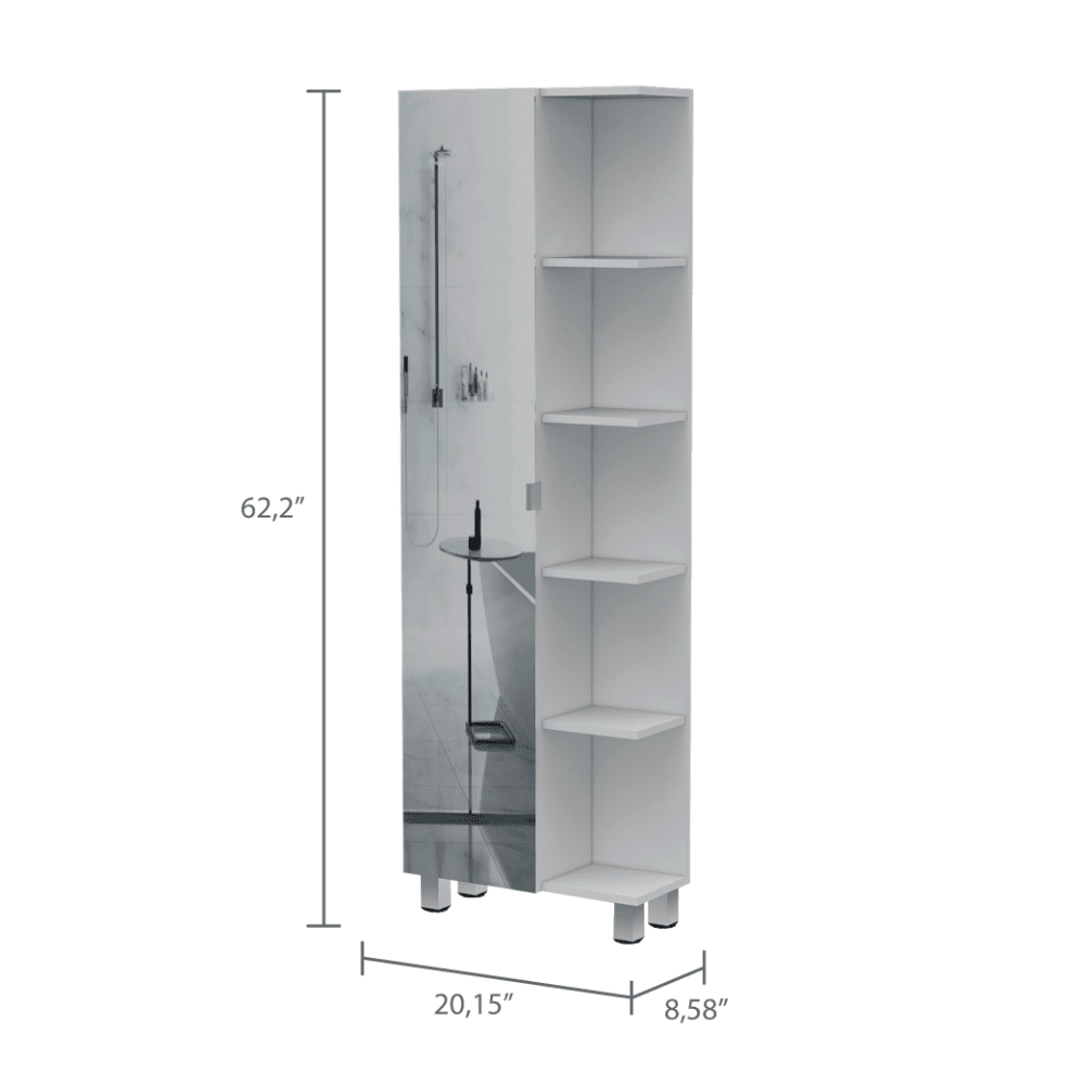 Part of the exclusive Urano collection; this cabinet updates the look of any space with modern styling and a unique white manufactured wood finish. Five shallow shelves and a large covered cabinet give you plenty of storage options ideal for your bathroom; kitchen; bedroom; or garage. Easy and ready to assemble furniture with full warranty and CARB certification.With four stylish legs and ergonomic size (8; 58''D X 20; 15''W X 62; 2''H)