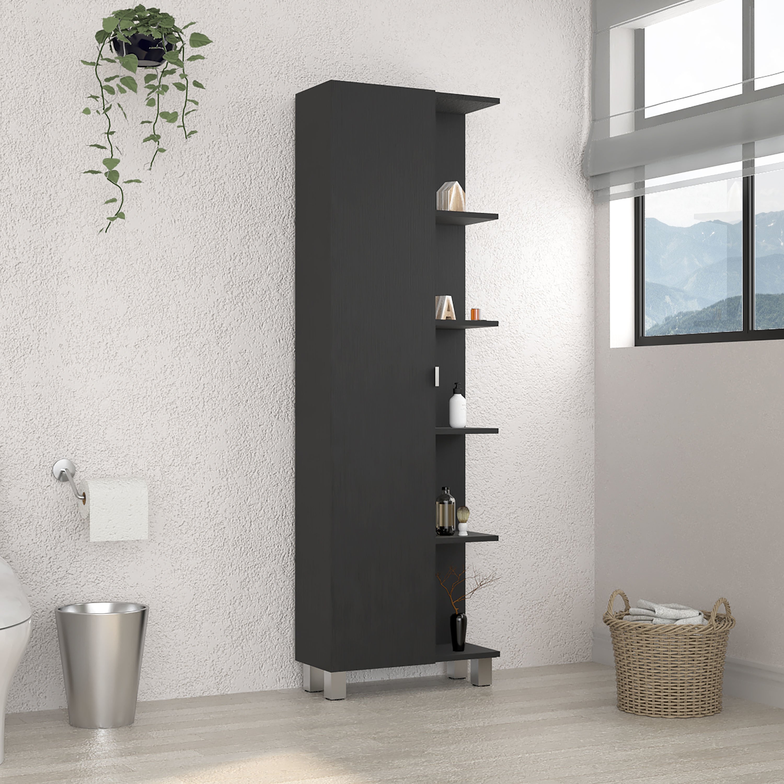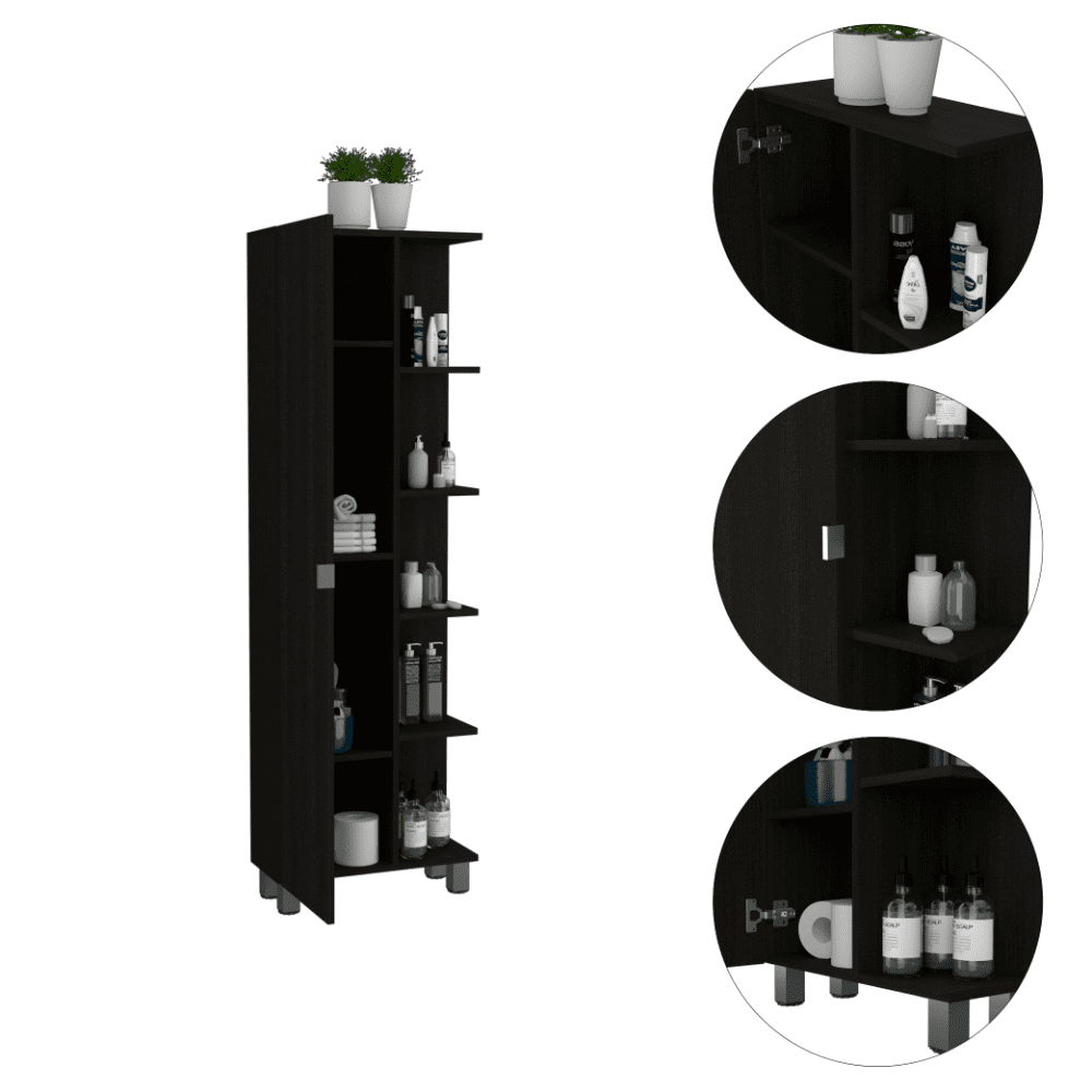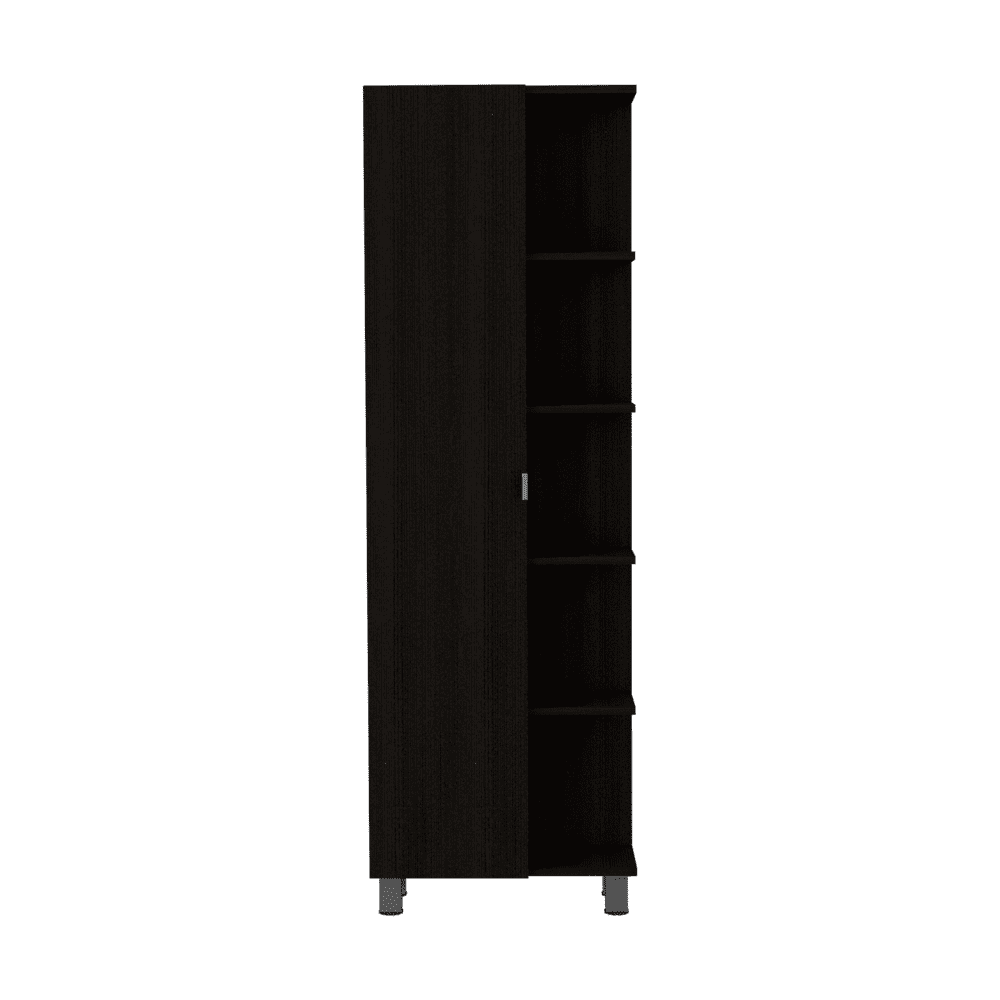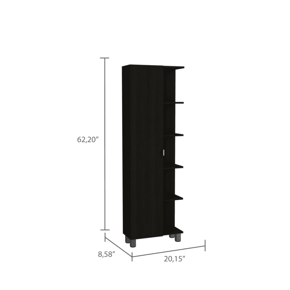 Part of the exclusive Urano collection; this cabinet updates the look of any space with modern styling and a unique black manufactured wood finish. Five shallow shelves and a large covered cabinet give you plenty of storage options ideal for your bathroom; kitchen; bedroom; or garage. Easy and ready to assemble furniture with full warranty and CARB certification.With four stylish legs and ergonomic size (8; 58''D X 20; 15''W X 62; 2''H)