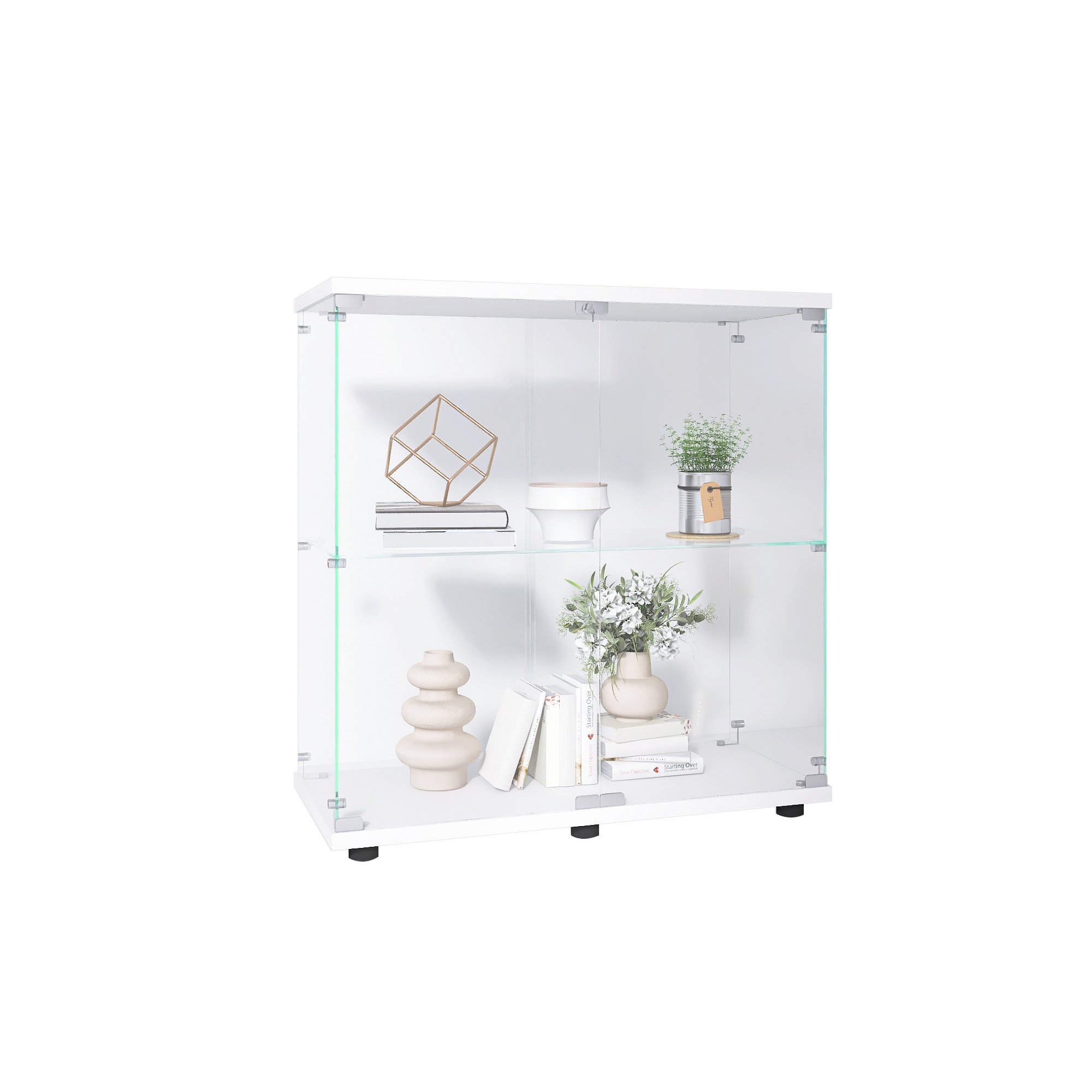 Two-door Glass Display Cabinet 2 Shelves with Door, Floor Standing Curio Bookshelf for Living Room Bedroom Office, 33.35"*31.69"*14.37",White