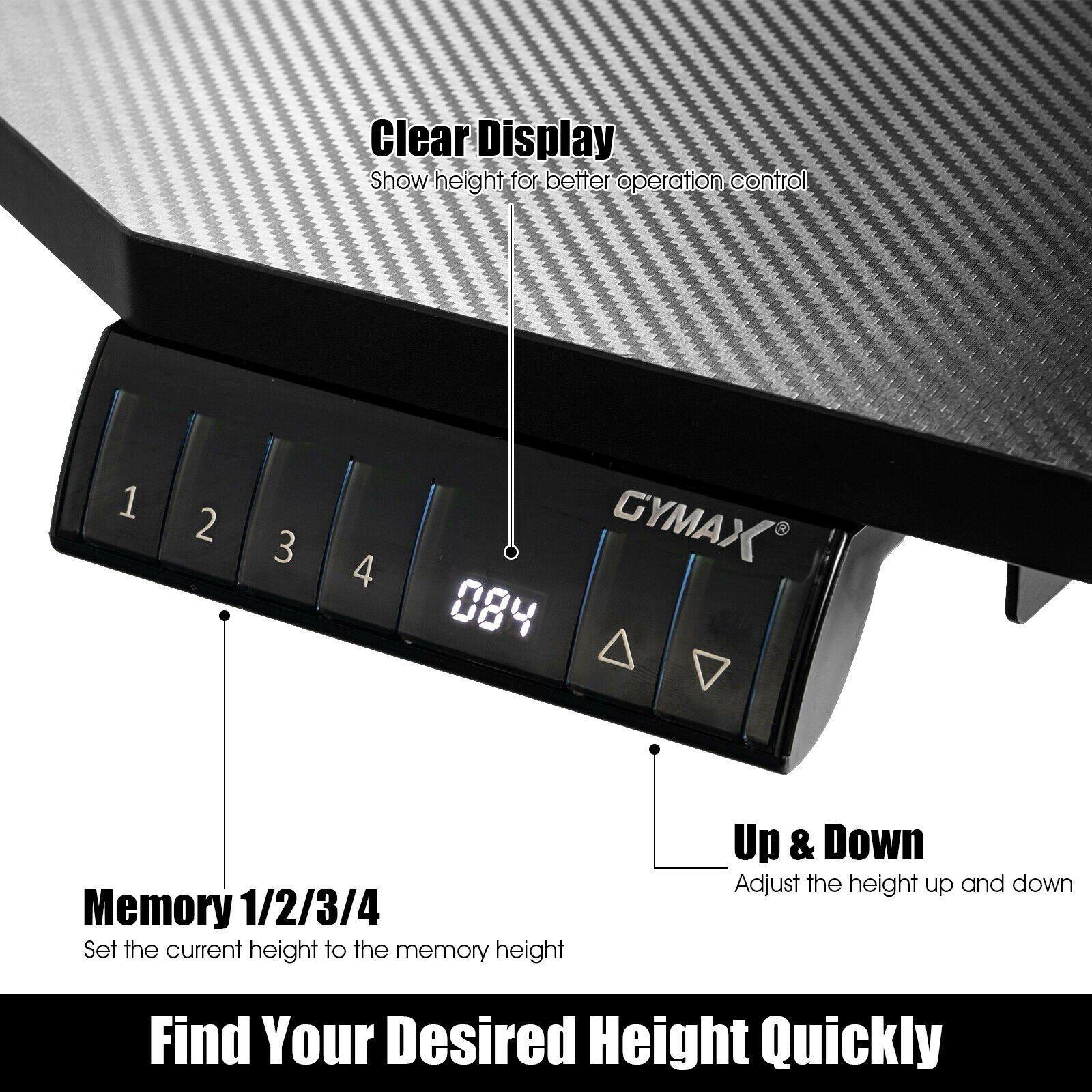Equipped with a noiseless motor, this table allows you to adjust the height freely. The low noise of the motor won't disturb anyone. Try the new way of standing work and play to relieve your fatigue caused by long time sitting. The digital height controller provides 4 memory buttons for you to save your desired desk height. With elegant carbon fiber texture, this electric computer desk is suitable for your study, living room, office, and so on. No matter how old you are, you can always find the most comfortable height.