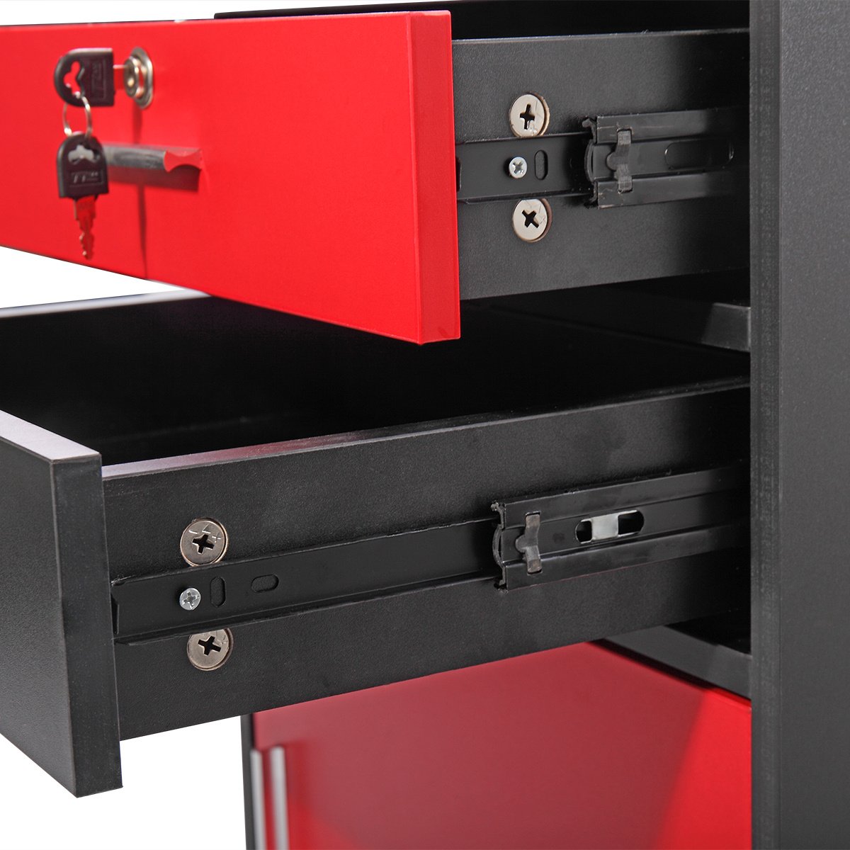 [Ample Storage Space]:Equipped with 2 slide-out drawers (one is lockable); 1 spacious cabinetwitha hingeddoor; and2dryerholders; the trolley can keep your working tools safe and organized.
