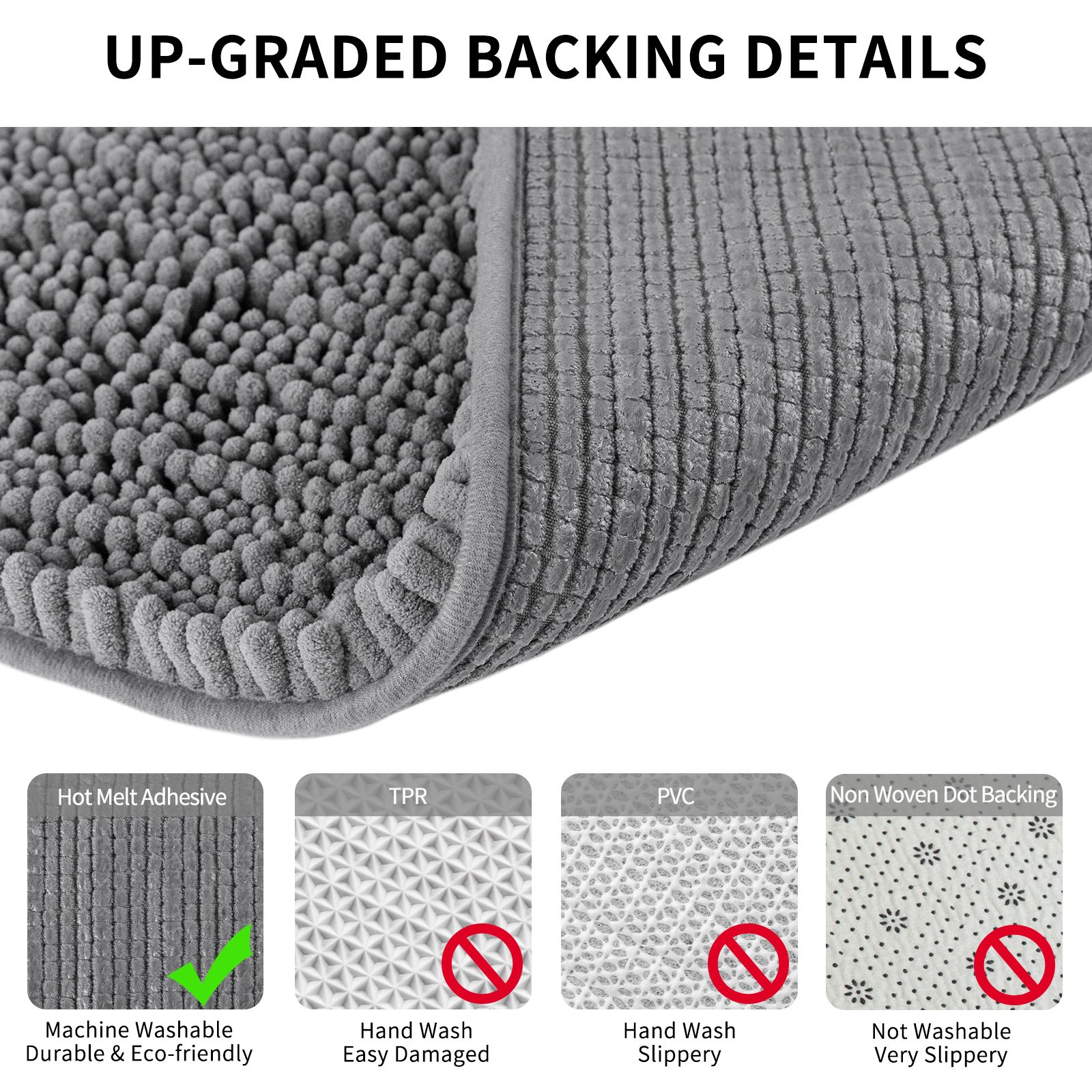ULTRA THICK SOFT-100%Made of thick and velvety microfiber chenille.The thick and soft chenille floor mat makes your feet feel the ultimate luxury enjoyment.When you step on it after a bath; it will be as comfortable as stepping on a cloud